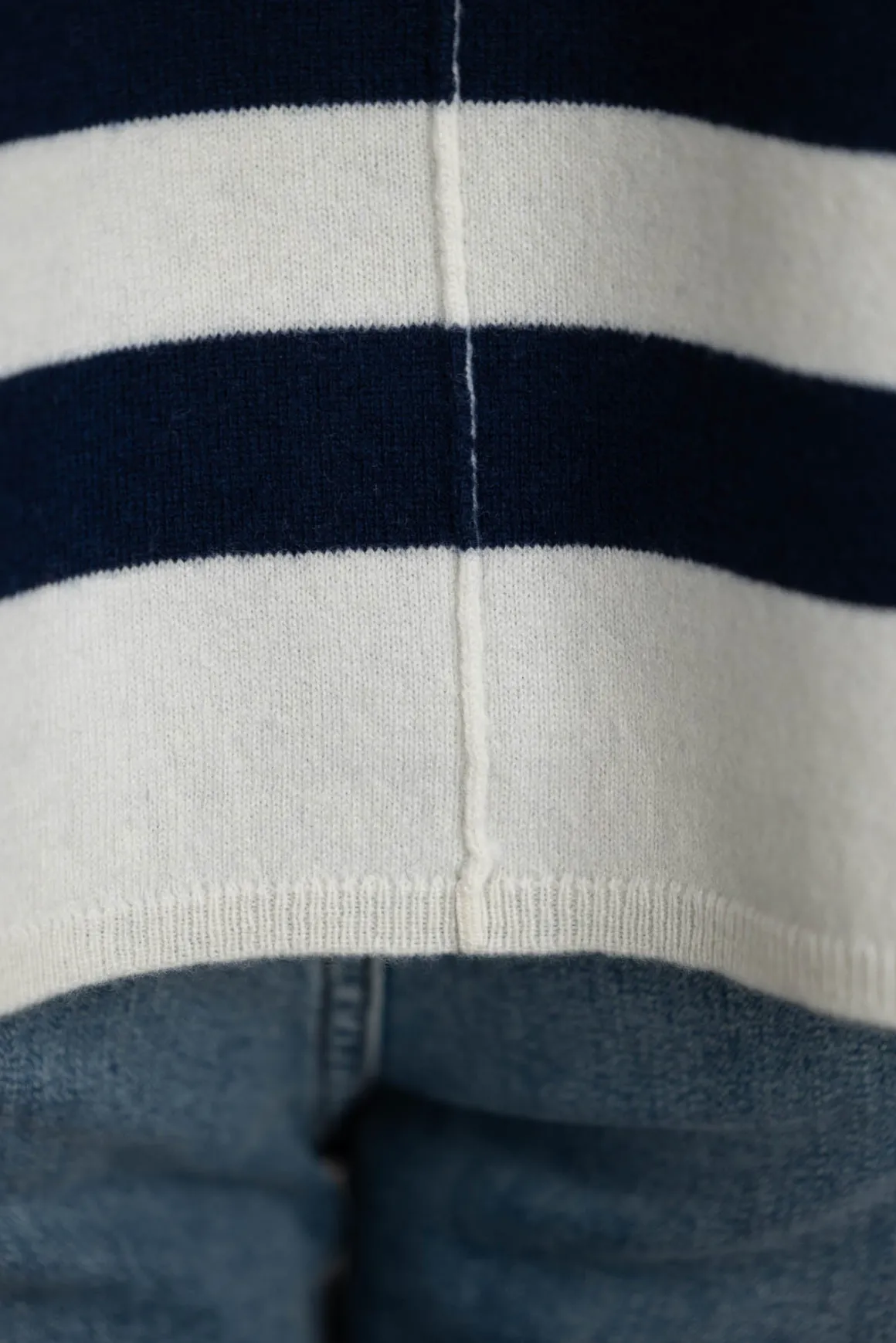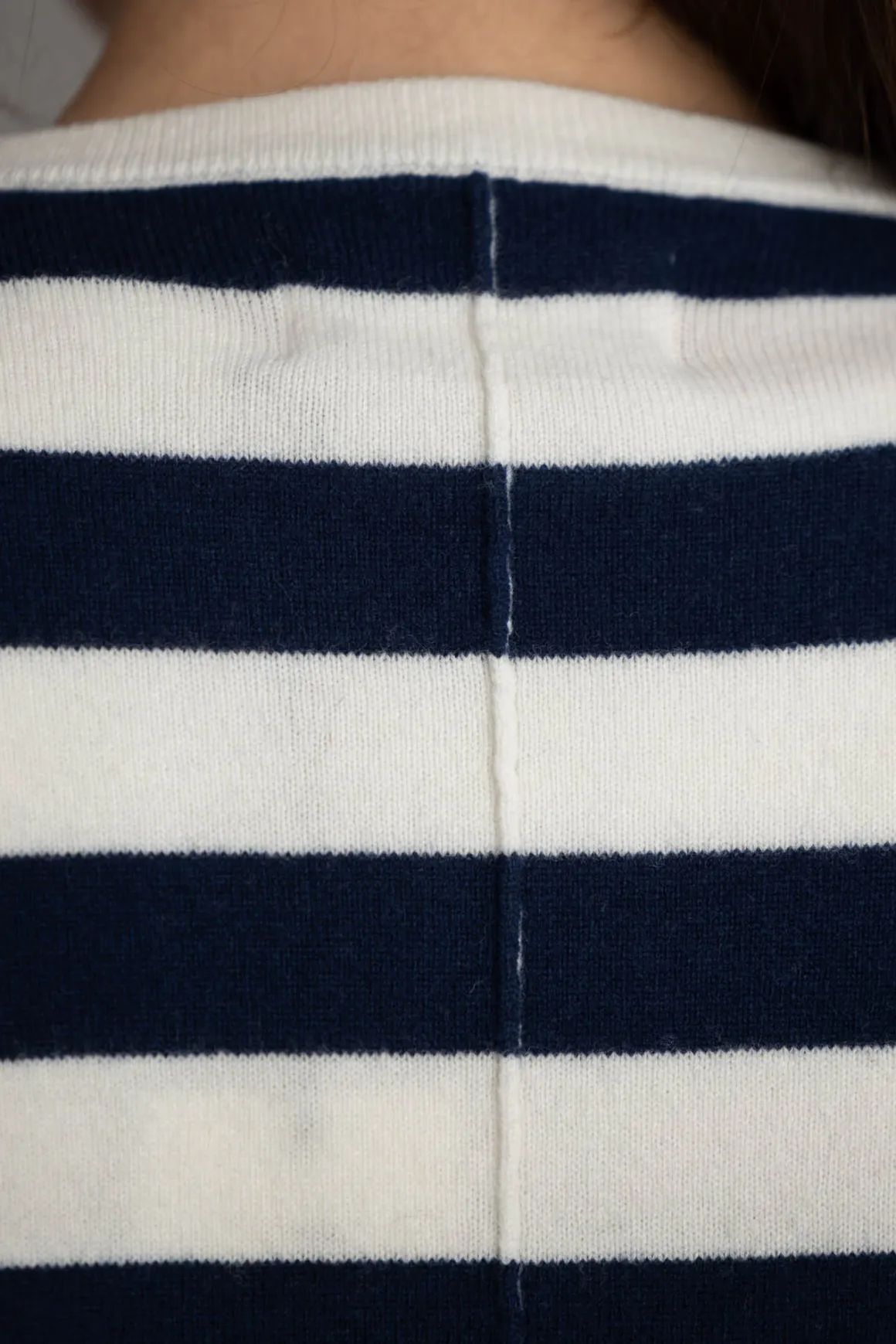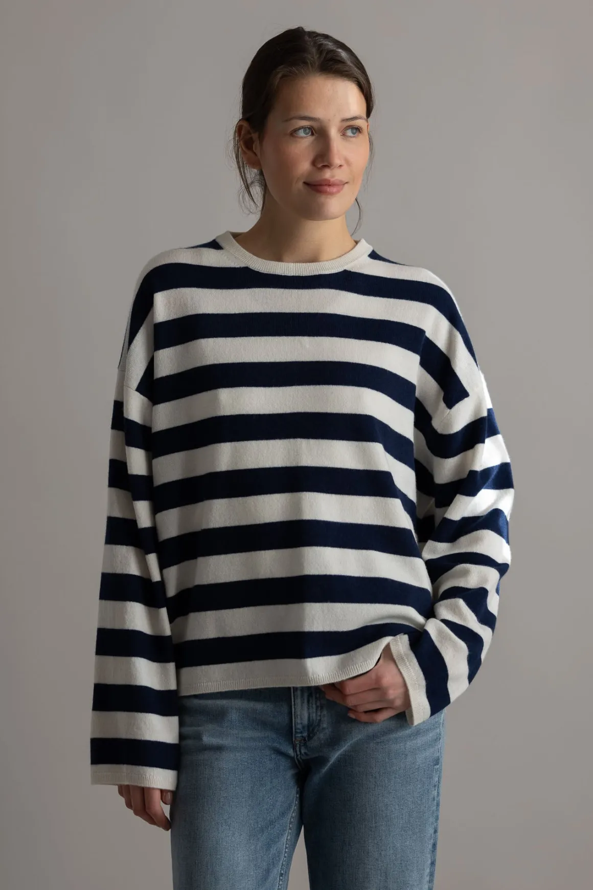 FWSS Toulon Sweater er en blå/hvit stripete genser i ekstra fin og myk merinoull. Genseren har en versized passform, en flatterende rund hals og gjennomførte detaljer på baksiden. Den har en cool og flatterende drop-shoulder. Et tidløst plagg for enhver basegarderobe. Perfekt å bare slenge over med et par jeans eller olashorts.