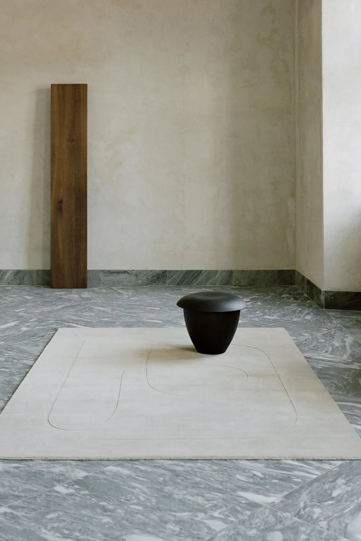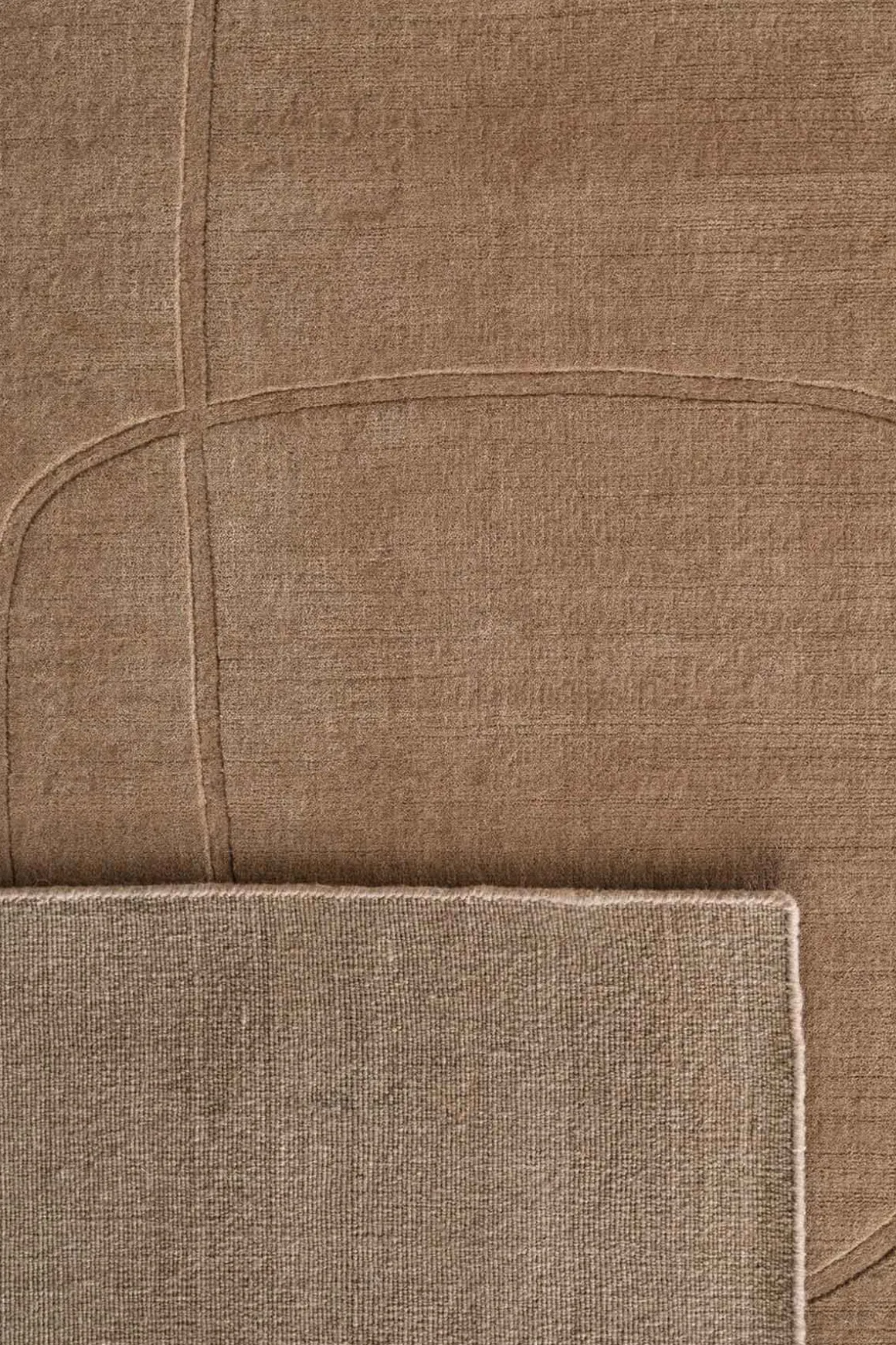 Cursive Expanse gulvteppe fra Linie Design i beige, designet av Urd Moll Gundermann. Gulvteppet har en buktende linje som danner et subtilt mønster på en nøytral bakgrunn, og skaper en tiltalende tekstur og visuell effekt som gir en