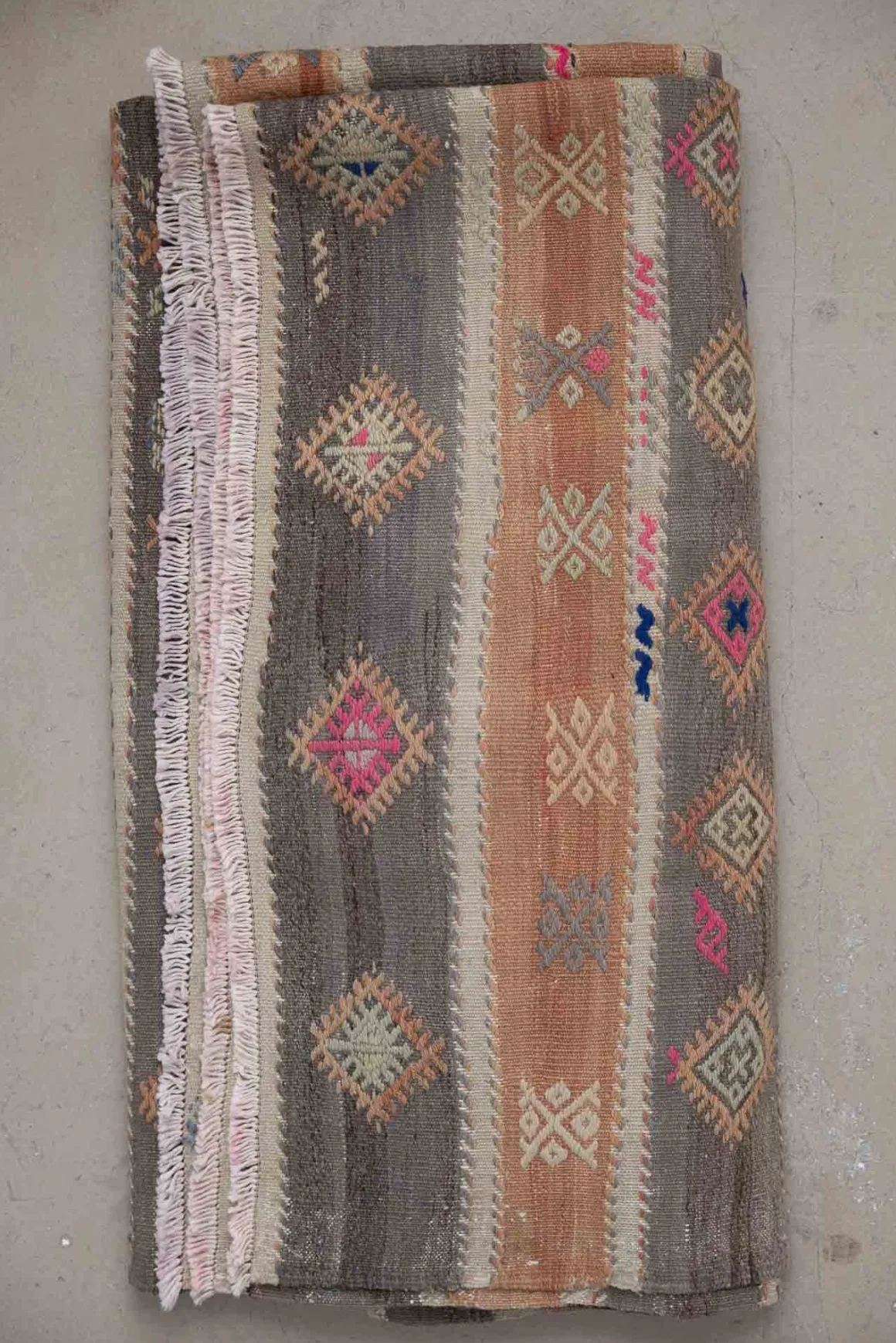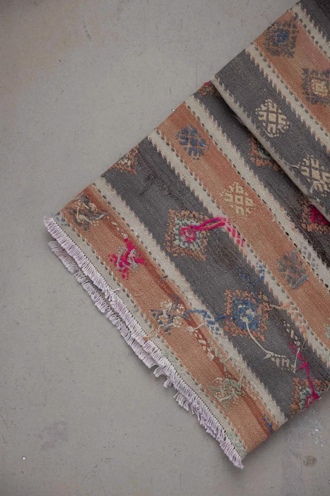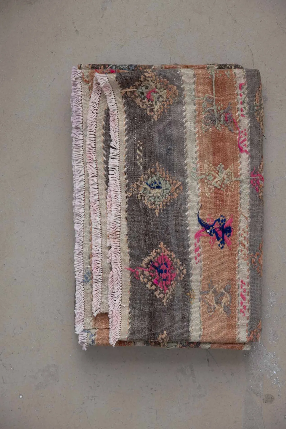 Unikt, vintage kelimteppe i ull fra Brandts Indoor. Gulvteppet er et originalt anatolsk teppe, håndlaget i Tyrkia og deretter renset og restaurert. Kelimteppene er derfor helt særegne og unike slik at du kan finne det perfekte gulvteppet som ingen andre har. Når en skal gå til innkjøp av gulvtepper er det lurt å velge et teppe som tåler en støyt. Den grove veven, fargekombinasjonene og mønsteret gjør at teppet er godt egnet i rom med mye trafikk, da flekker ikke vil synes så godt. Teppene har en naturlig evne til å motstå smuss og er bærekraftige, naturlige og biologisk nedbrytbare. De naturlige egenskapene til ull gjør teppet anti-allergisk og brannbestandig, noe som bidrar til å skape et trygt og sunt innemiljø. Vær oppmerksom på at det kan forekomme mindre flekker eller reparasjoner på teppene siden de er vintage og restaurert. Tips! Gå til innkjøp av et anti-skli underlagsteppe, så ligger teppet stødig og rett på gulvet.