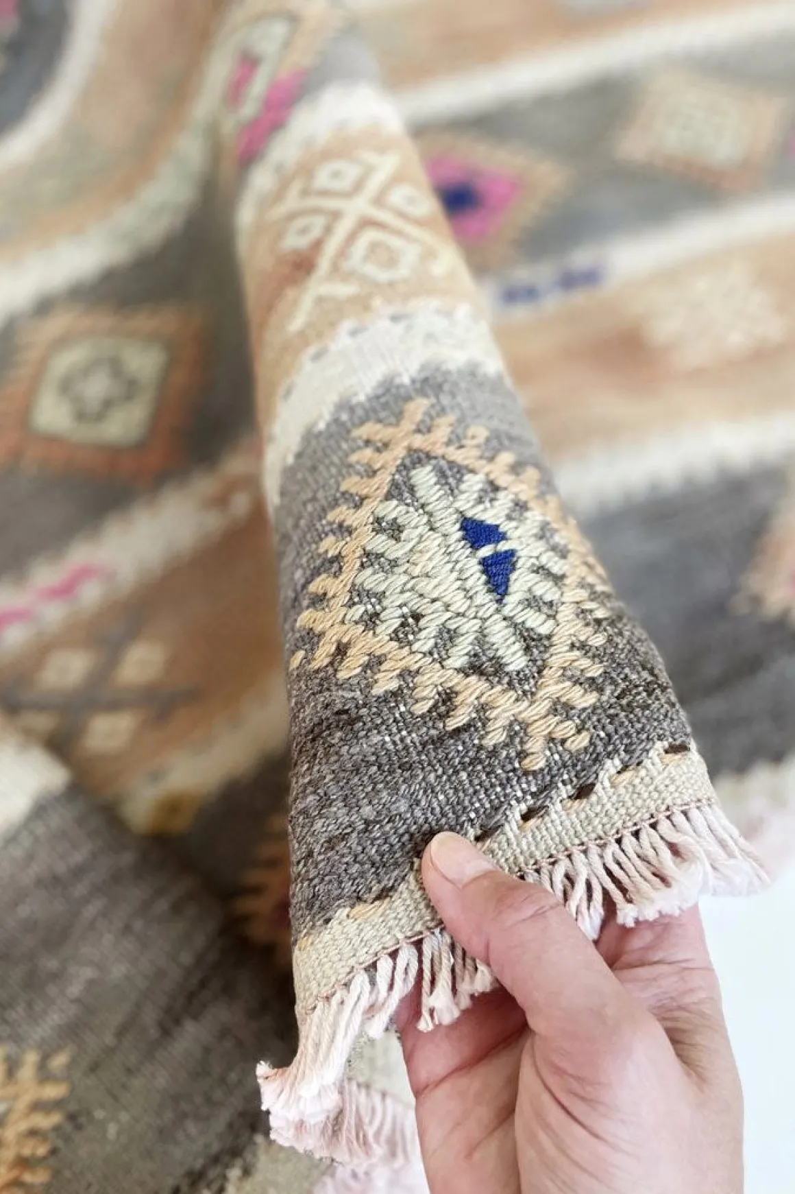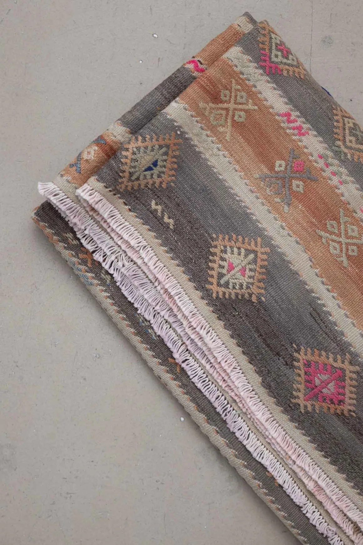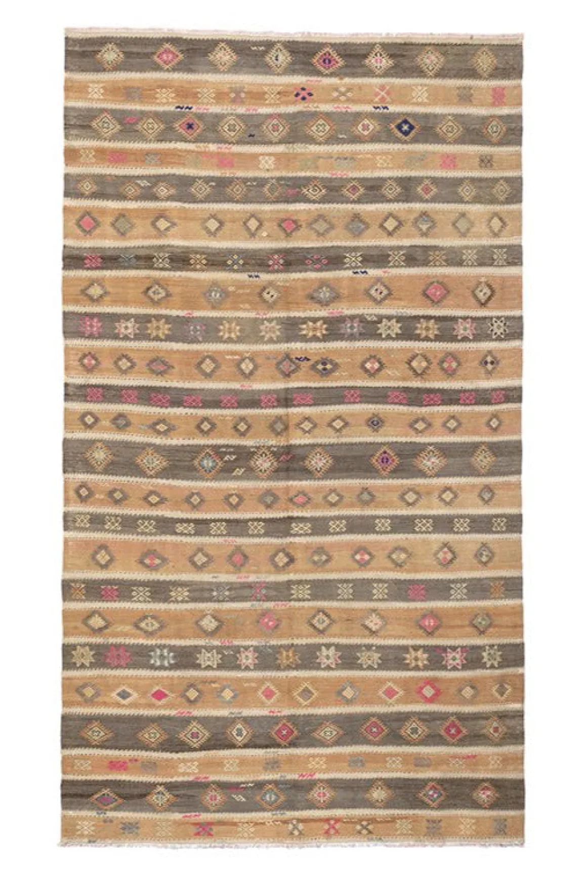 Unikt, vintage kelimteppe i ull fra Brandts Indoor. Gulvteppet er et originalt anatolsk teppe, håndlaget i Tyrkia og deretter renset og restaurert. Kelimteppene er derfor helt særegne og unike slik at du kan finne det perfekte gulvteppet som ingen andre har. Når en skal gå til innkjøp av gulvtepper er det lurt å velge et teppe som tåler en støyt. Den grove veven, fargekombinasjonene og mønsteret gjør at teppet er godt egnet i rom med mye trafikk, da flekker ikke vil synes så godt. Teppene har en naturlig evne til å motstå smuss og er bærekraftige, naturlige og biologisk nedbrytbare. De naturlige egenskapene til ull gjør teppet anti-allergisk og brannbestandig, noe som bidrar til å skape et trygt og sunt innemiljø. Vær oppmerksom på at det kan forekomme mindre flekker eller reparasjoner på teppene siden de er vintage og restaurert. Tips! Gå til innkjøp av et anti-skli underlagsteppe, så ligger teppet stødig og rett på gulvet.