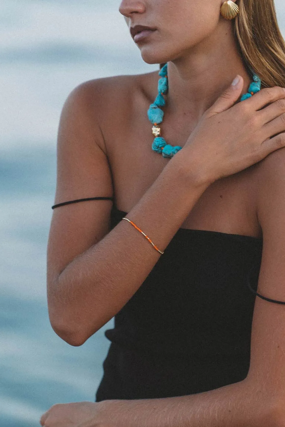 La Mer-halskjedet fra Anni Lu og Il Mare-kolleksjonen er inspirert av havets mystikk og skjønnhet. Med en kombinasjon av naturlige steiner, perler og skjellinspirerte detaljer bringer det tankene til bølger, solnedganger og strandens skatter. Et unikt smykke som tilfører antrekket ditt en følelse av havets magi.