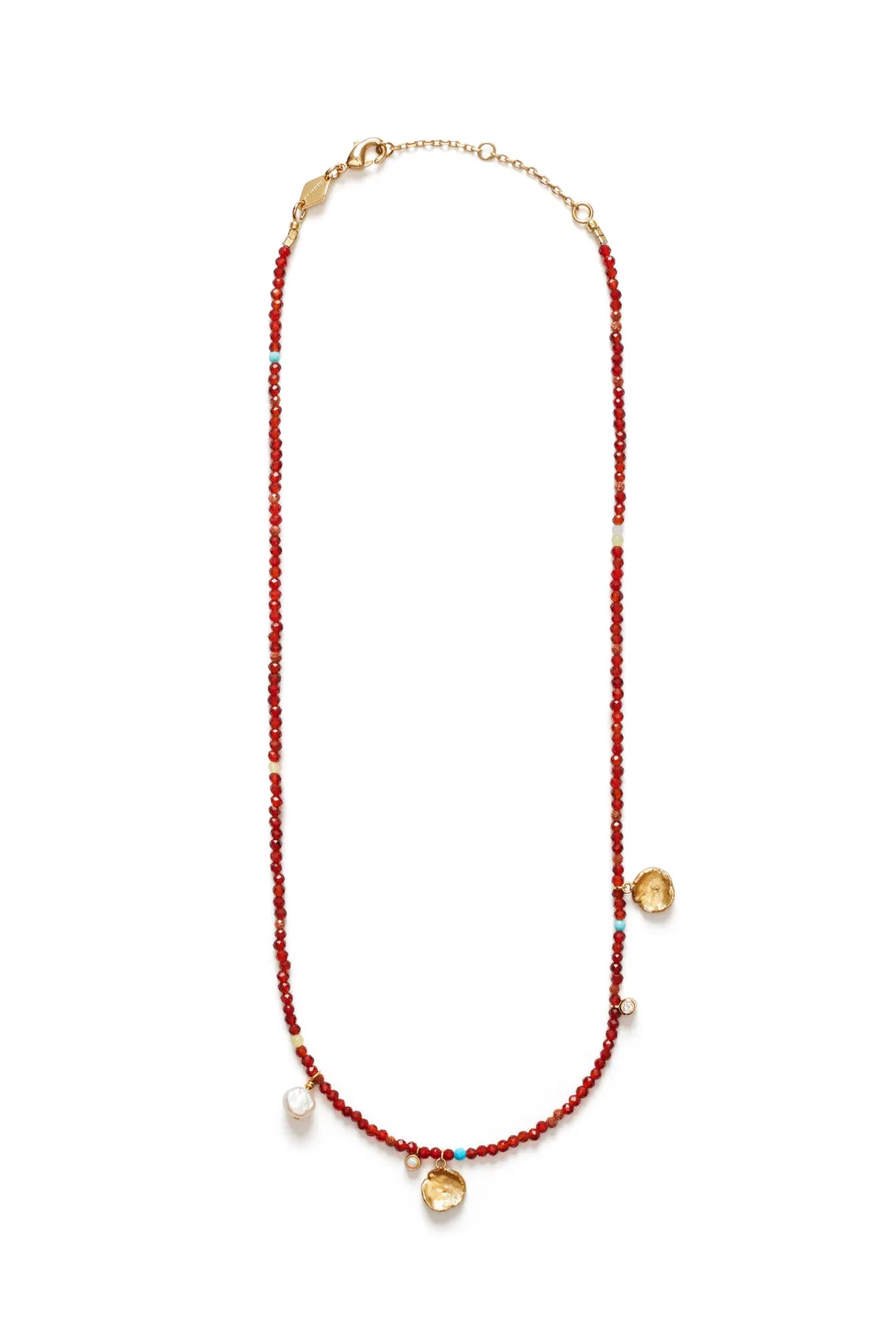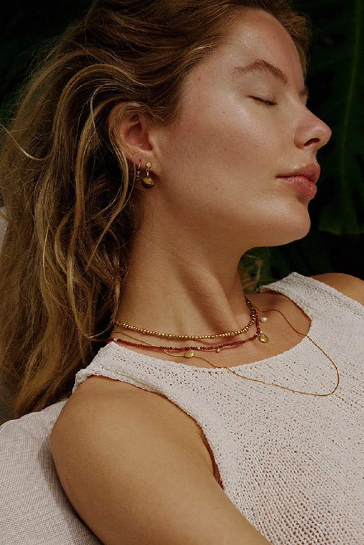 Maroon Harmony halskjede fra Anni Lu. Halskjedet er en delikat kombinasjon av 18 karat gullbelagt messing og en vakker miks av edelstener og perler. Anni Lu er kjent for sine fargerike og lekne kombinasjoner, og gir deg muligheten til å mikse og matche for å skape et personlig uttrykk. Som en del av Club Mirage-kolleksjonen, henter dette halskjedet inspirasjon fra 70-tallets avslappede og kreative atmosfære, og tilfører en unik balanse mellom sofistikerte detaljer og livlige farger.