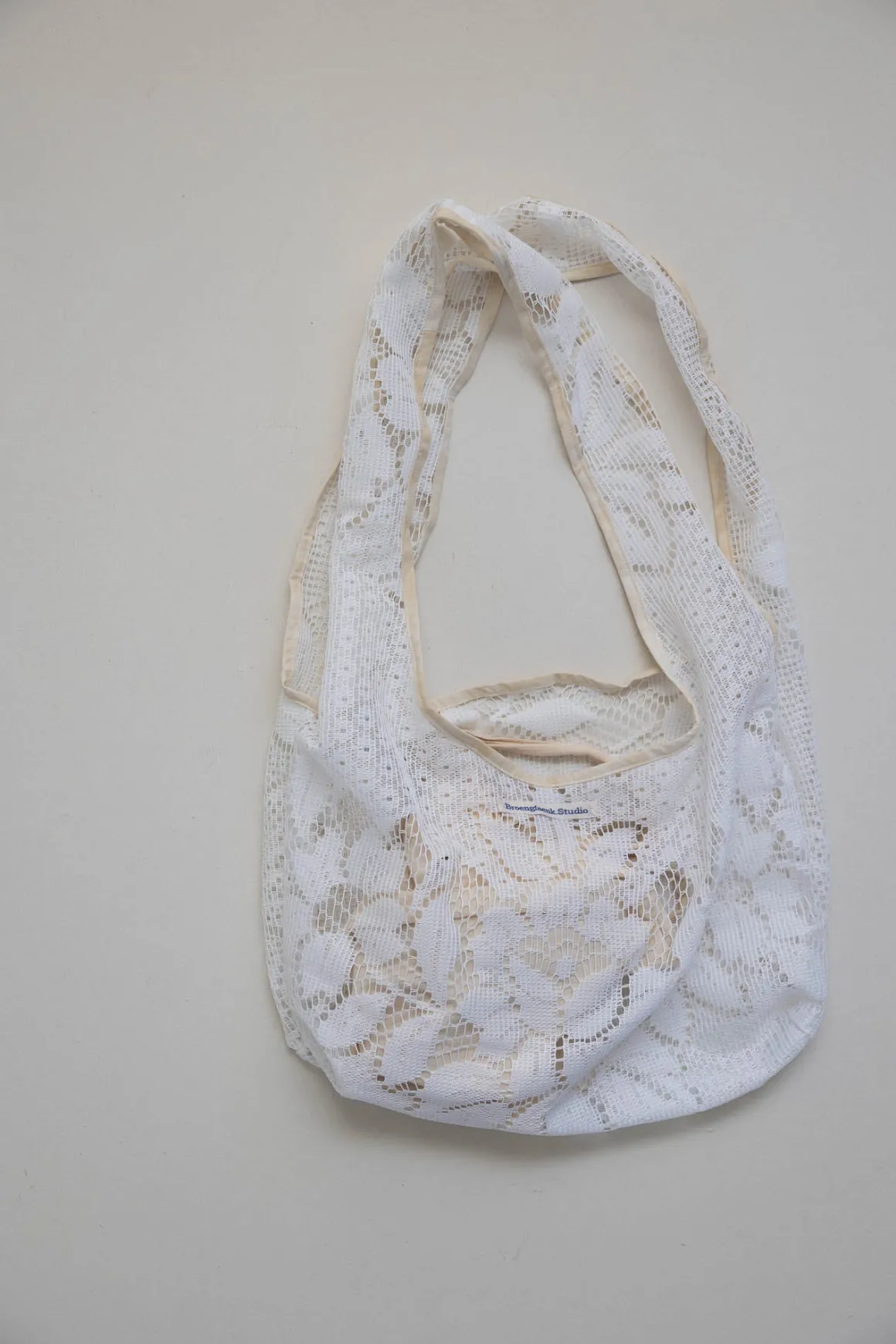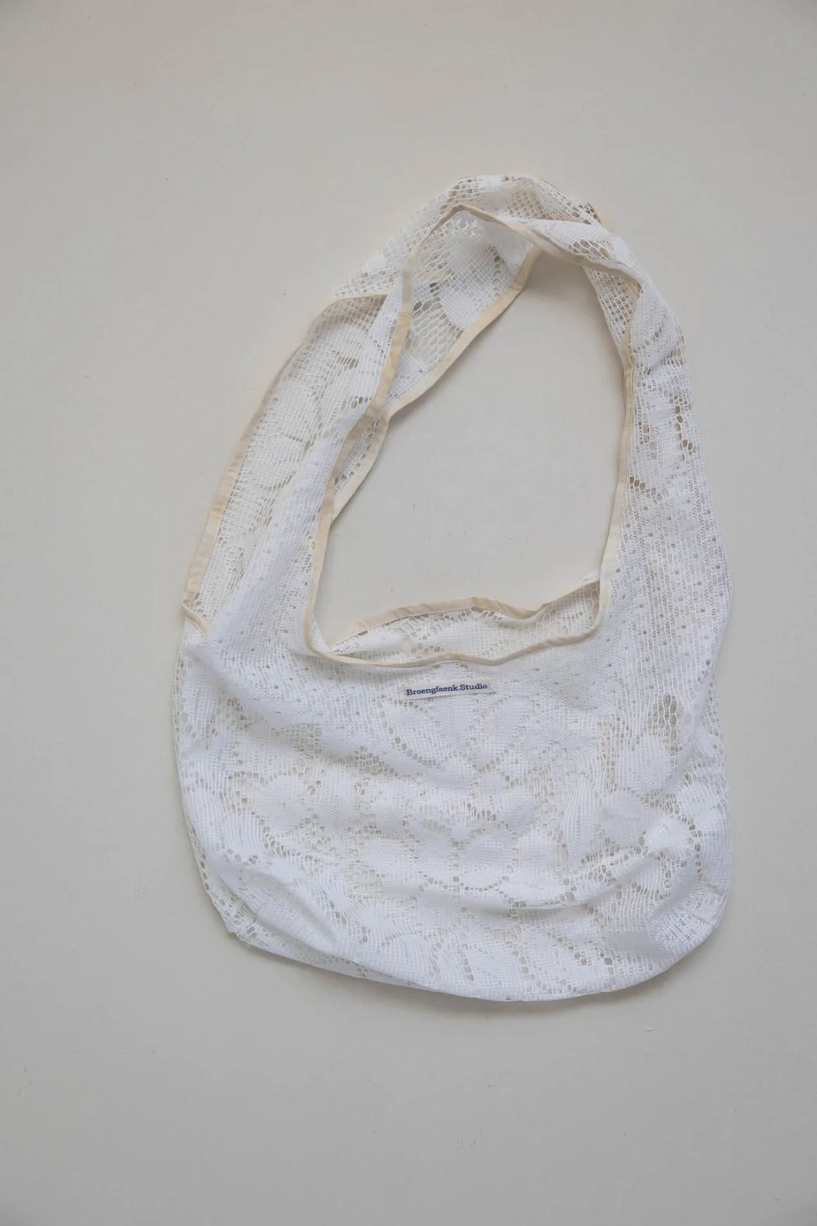 Unikt handlenett fra danske Broeng Fænk Studio laget av gjenbrukte vintage tekstiler som gardiner og duker, med håndsydde detaljer og plantefarget kantebånd. Nettet er lett og dekorativt, perfekt til små ærend eller som ekstra veske, men tåler ikke tung last. Blonder har fått ny aktualitet – og dette nettet kombinerer stilen med bærekraftig produksjon og nostalgisk sjarm. Det følger med en praktisk bomullspose som kan brukes inni nettet.