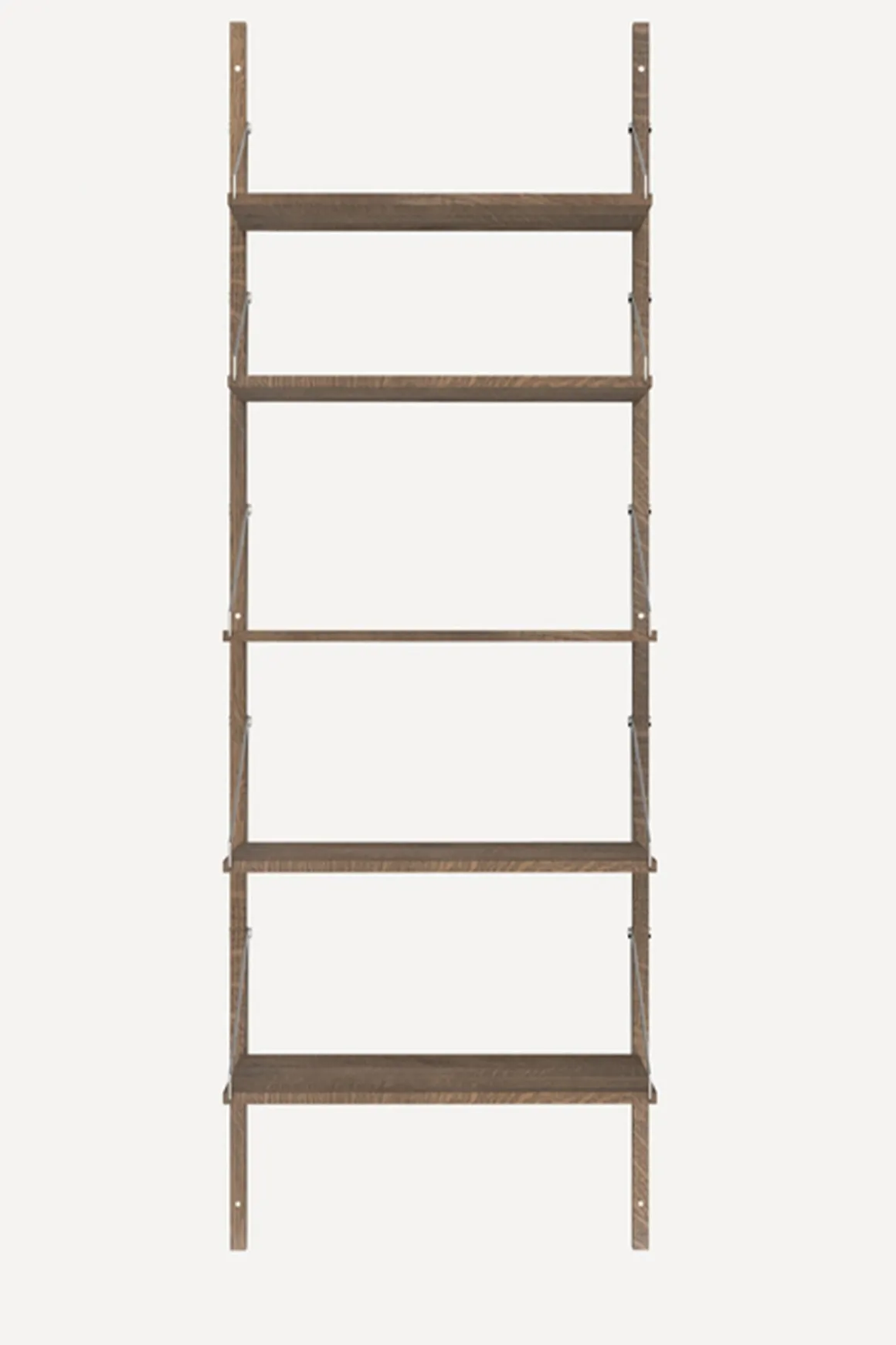 Velkjente Library Shelf komplett hyllesystem fra Frama i vakker, mørkoljet, heltre eik. Karakterisert av et modulært system og festet med solide stålskruer-og braketter på solide skinner i eik, kan hyllene enkelt plasseres og styles om på en rekke måter. Dette allsidige hyllesystemet egner seg til ethvert rom med sitt minimalistiske og stramme design, og kombinasjonen av rustfritt stål og lun, mørkoljet eik passer perfekt inn i de skandinaviske hjem. Library Shelf er enkel å montere, og hver enkelt hylle kan holde ca. 15 kg (avhengig av veggmateriale og montering). Systemet er svært fleksibelt, og hver hylle kan flyttes rundt og tilpasses med tilleggsprodukter fra samme serie.