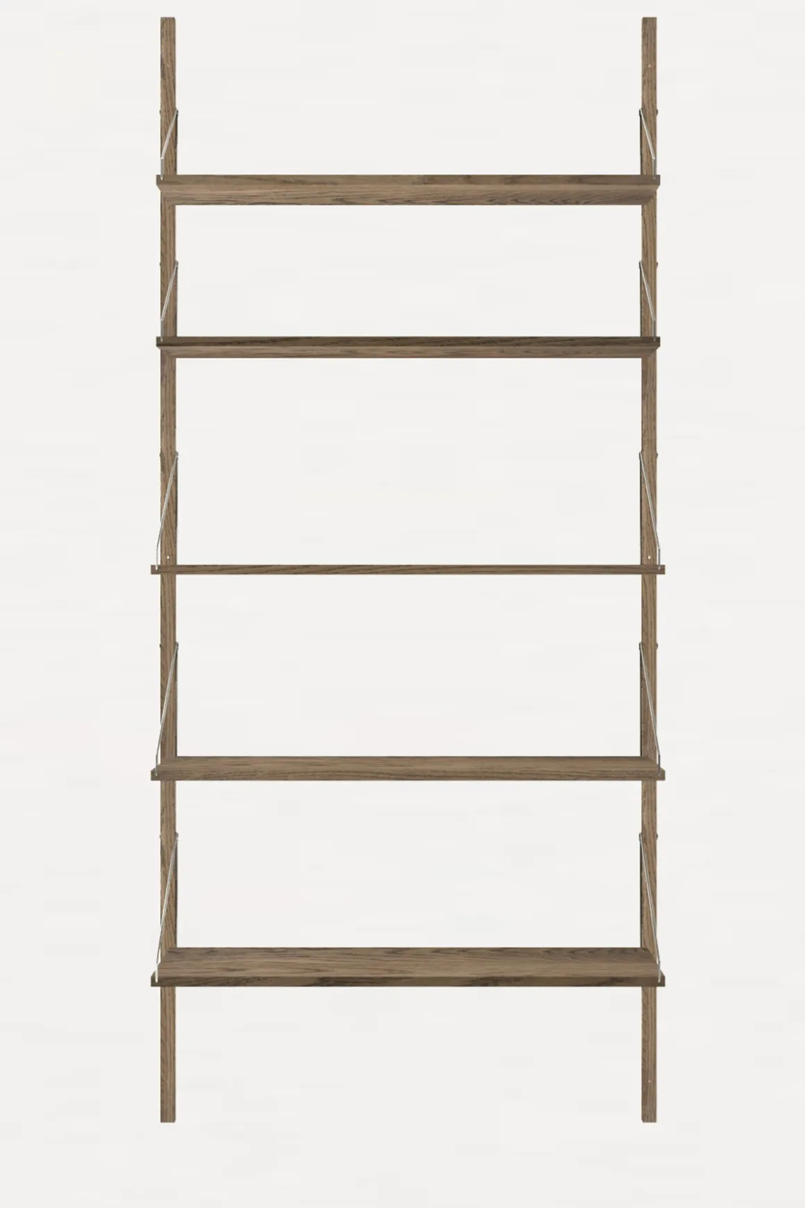 Velkjente Library Shelf komplett hyllesystem fra Frama i vakker, mørkoljet, heltre eik. Karakterisert av et modulært system og festet med solide stålskruer-og braketter på solide skinner i eik, kan hyllene enkelt plasseres og styles om på en rekke måter. Dette allsidige hyllesystemet egner seg til ethvert rom med sitt minimalistiske og stramme design, og kombinasjonen av rustfritt stål og lun, mørkoljet eik passer perfekt inn i de skandinaviske hjem. Library Shelf er enkel å montere, og hver enkelt hylle kan holde ca. 15 kg (avhengig av veggmateriale og montering). Systemet er svært fleksibelt, og hver hylle kan flyttes rundt og tilpasses med tilleggsprodukter fra samme serie.