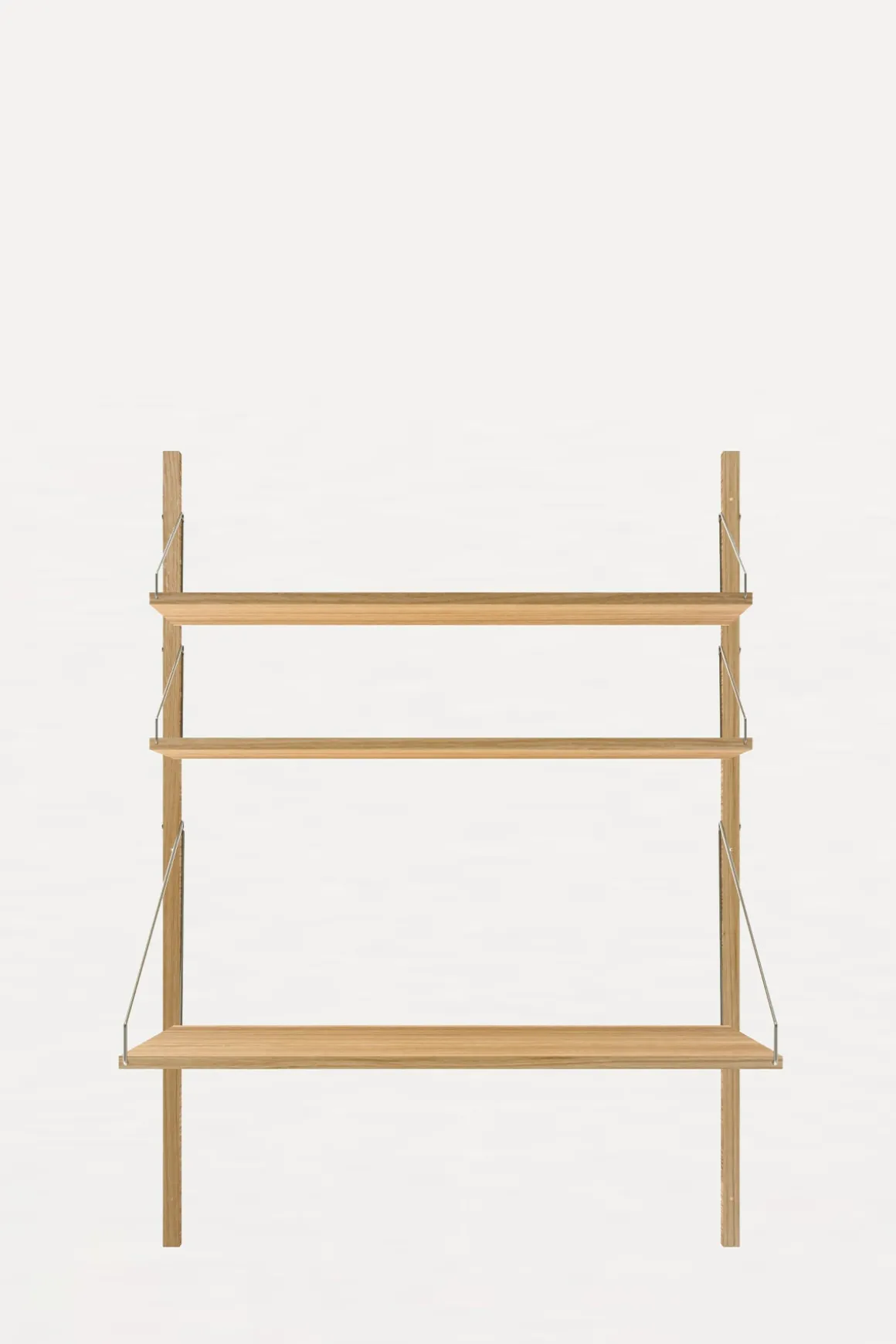 Velkjente Library Shelf komplett hyllesystem med en bredere hylle/kontorpult fra Frama i naturlig, oljet, heltre eik. Karakterisert av et modulært system og festet med solide stålskruer-og braketter på solide skinner i eik, kan hyllene enkelt plasseres og styles om på en rekke måter. Dette allsidige hyllesystemet egner seg til ethvert rom med sitt minimalistiske og stramme design, og kombinasjonen av rustfritt stål og lun, oljet eik passer perfekt inn i de skandinaviske hjem. Library Shelf er enkel å montere, og hver enkelt hylle kan holde ca. 15 kg (avhengig av veggmateriale og montering). Systemet er svært fleksibelt, og hver hylle kan flyttes rundt og tilpasses med tilleggsprodukter fra samme serie.