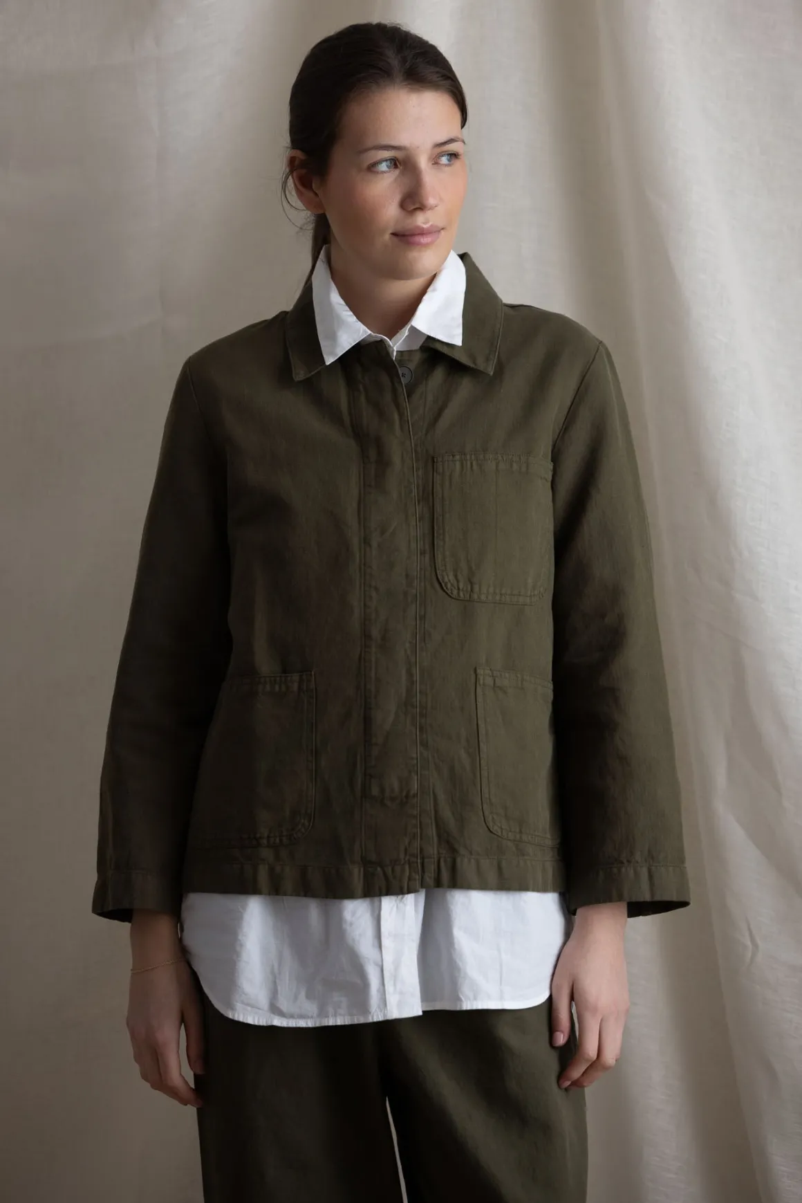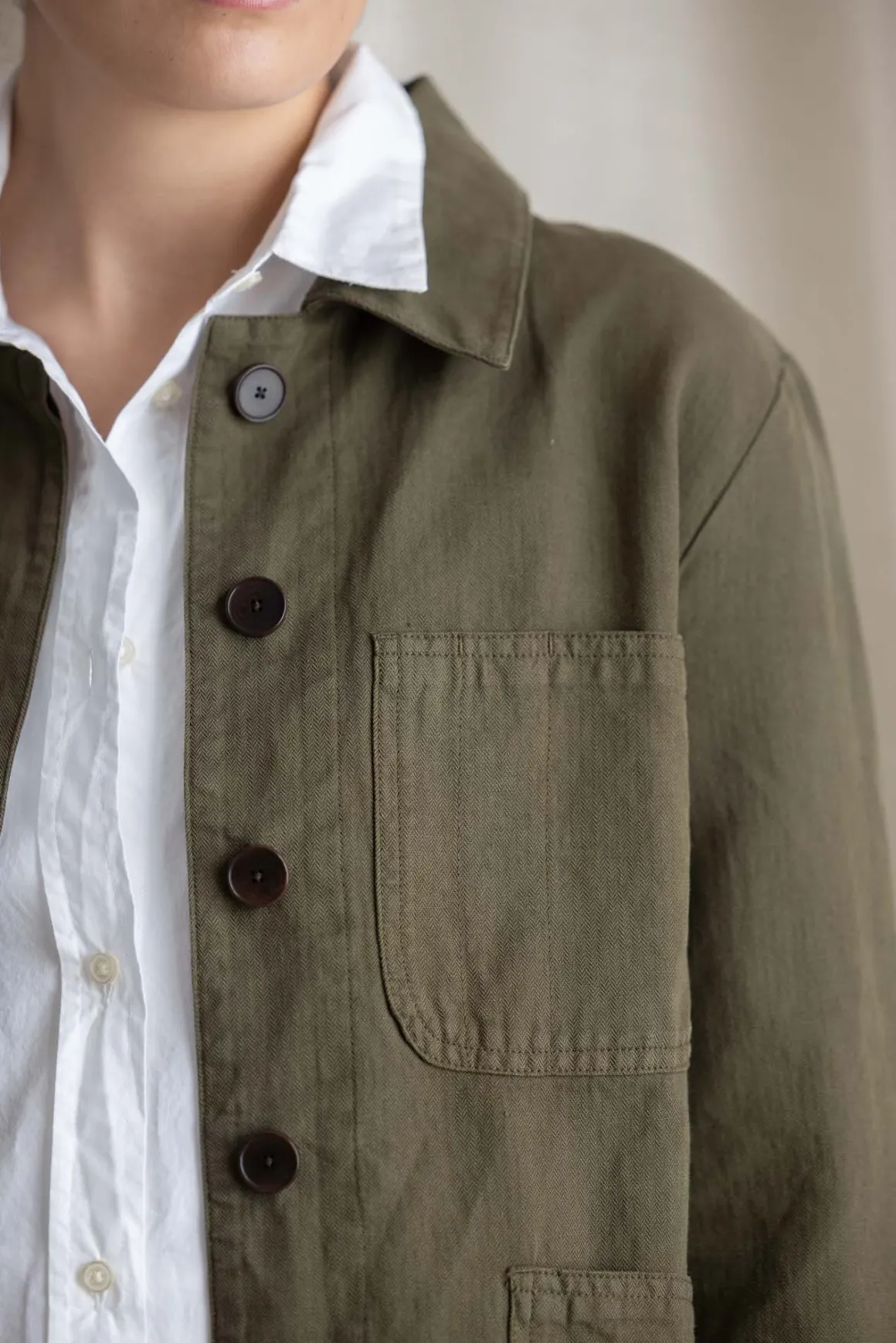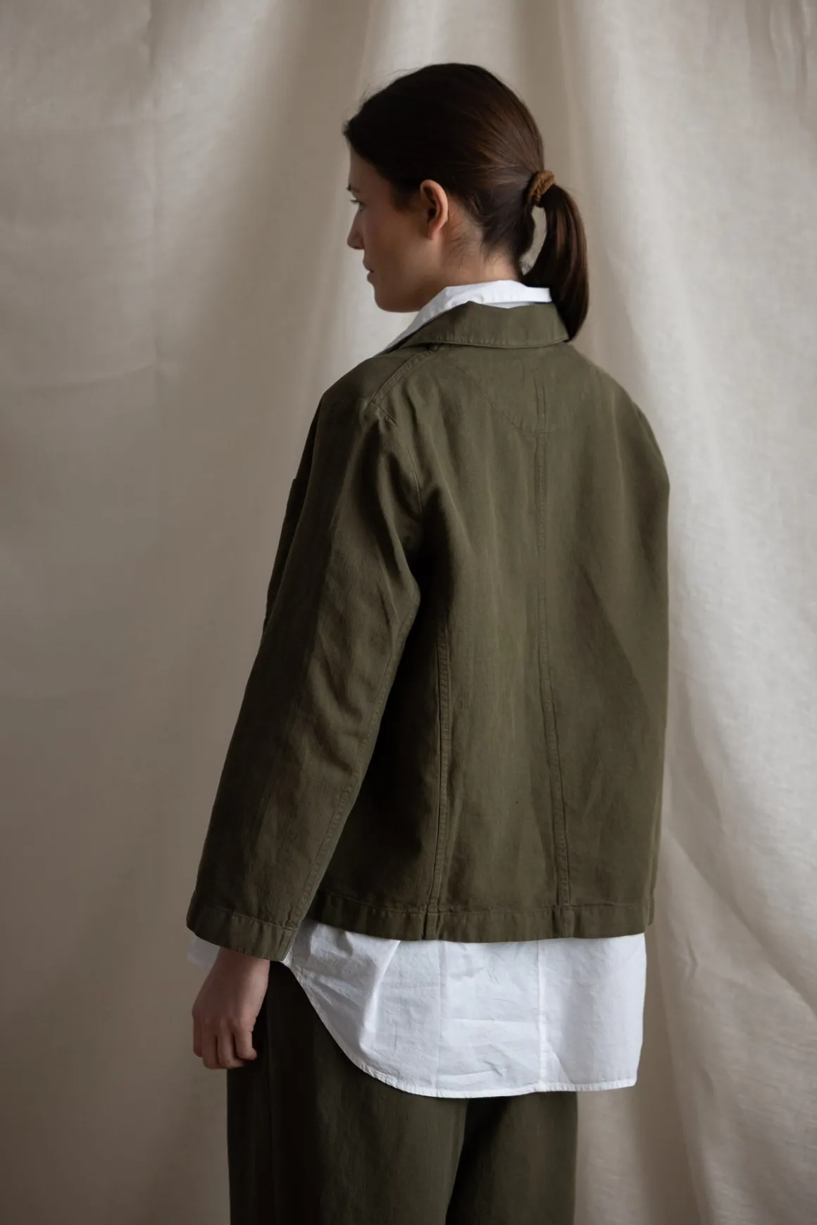 Cotton Linen Herringbone Jacket fra TOAST er en stilren jakke i en myk blanding av bomull og lin, vevd med en diskret fiskebensstruktur. Synlige sømmer skaper et panelert uttrykk, mens de påsydde lommene og skjulte hornknappene gir et nedtonet, men sofistikert preg. Plagget er garment-dyed, noe som gir naturlige nyansevariasjoner og et unikt utseende. Bruk alene til en skjorte eller bruk med matchende jakke.
