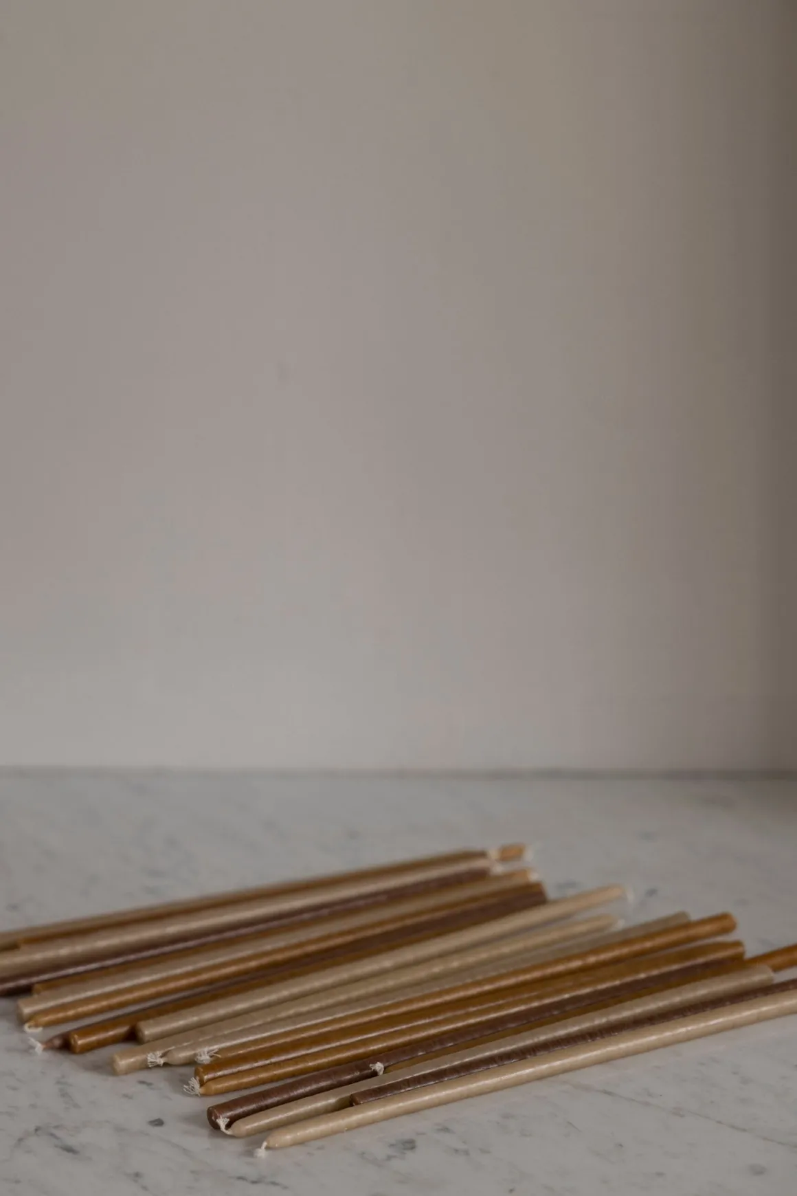 20 pk med vakre kertelys fra Maison Pechavy i beige. Denne bunten med håndverkslys er et resultat av deres samarbeid med en av de siste stearinlys-produsentene i Frankrike som jobber for å opprettholde gamle tradisjoner og metoder. De u-formede bomullsvekene plasseres på pinner festet til trerammer og blir deretter dyppet i voks. Resultatet er fine, koniske lys som forfines mot toppen. Fargepigmentene drysses inn i den smeltede voksen og gir dype, livlige farger. Kvalitetslysene fra Maison Pechavy brenner langsomt slik at de ikke avgir røyk. Disse lysene har en diameter på 0,8 -1 cm og kalles kertelys. Ønsker du å bruke kertelysene i en vanlig lysestake til kronelys, kan man bruke adapterne fra samme merke som gjør diameteren på åpningen mindre slik at lysene står støtt.