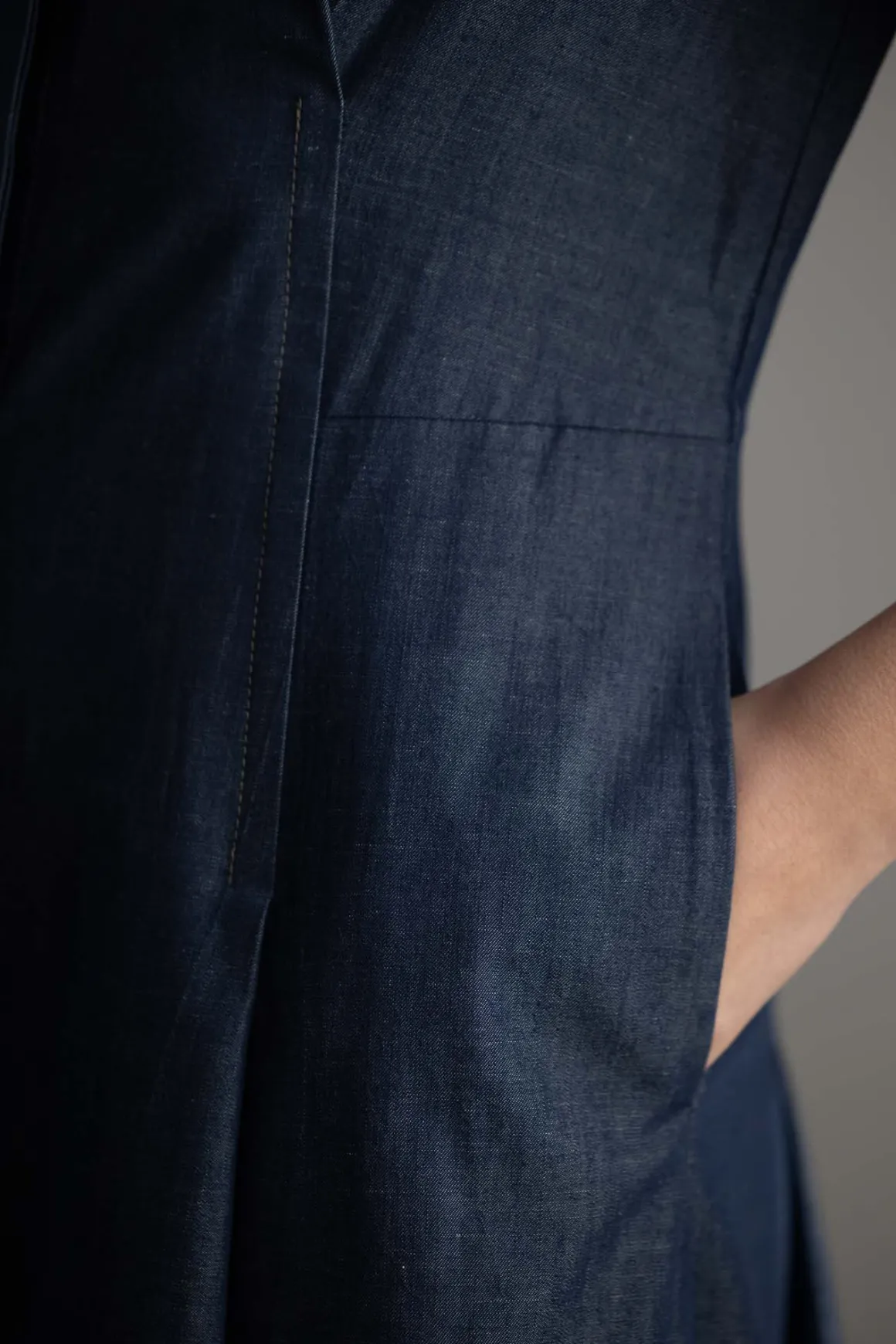 Vince – Denim S/S Shirt Dress. En feminin skjortekjole i denim med en flatterende, innsvingt passform. Skjulte knapper hele veien ned gir et rent uttrykk og skaper en elegant splitt foran. Kjolen har sidelommer, klassisk krage og motlegg i livet som gir en fin form og bevegelse. En allsidig hverdagsfavoritt som enkelt kan styles opp eller ned.