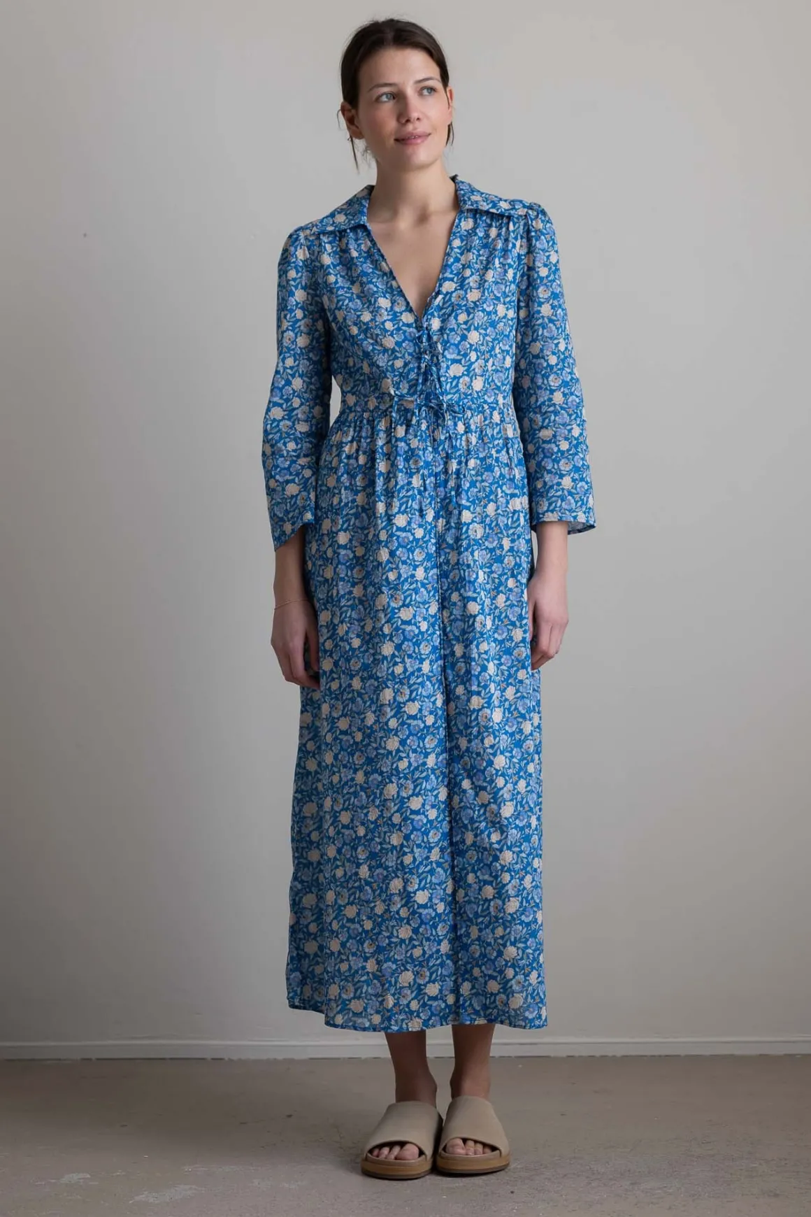 En drøm av en kjole fra Rixo. Franchi-kjolen er lett og luftig i tynn bomullsvoile, med et delikat blomsterprint som forener bohemsk sjarm og vintageinspirert silhuett. Tre knytebånd foran og ett bak gir mulighet til å justere passformen slik du ønsker, da båndene er festet i sidene. En skjult knappestolpe fra livet og ned skaper et rent uttrykk, mens den dype frontsplitten tilfører både bevegelse og letthet. Smale ermer uten mansjetter, rynket midje og klassisk krage gir en feminin og tidløs form.