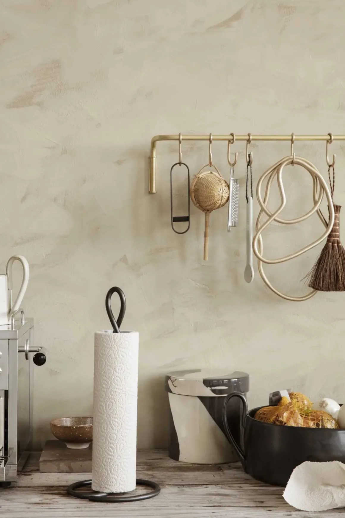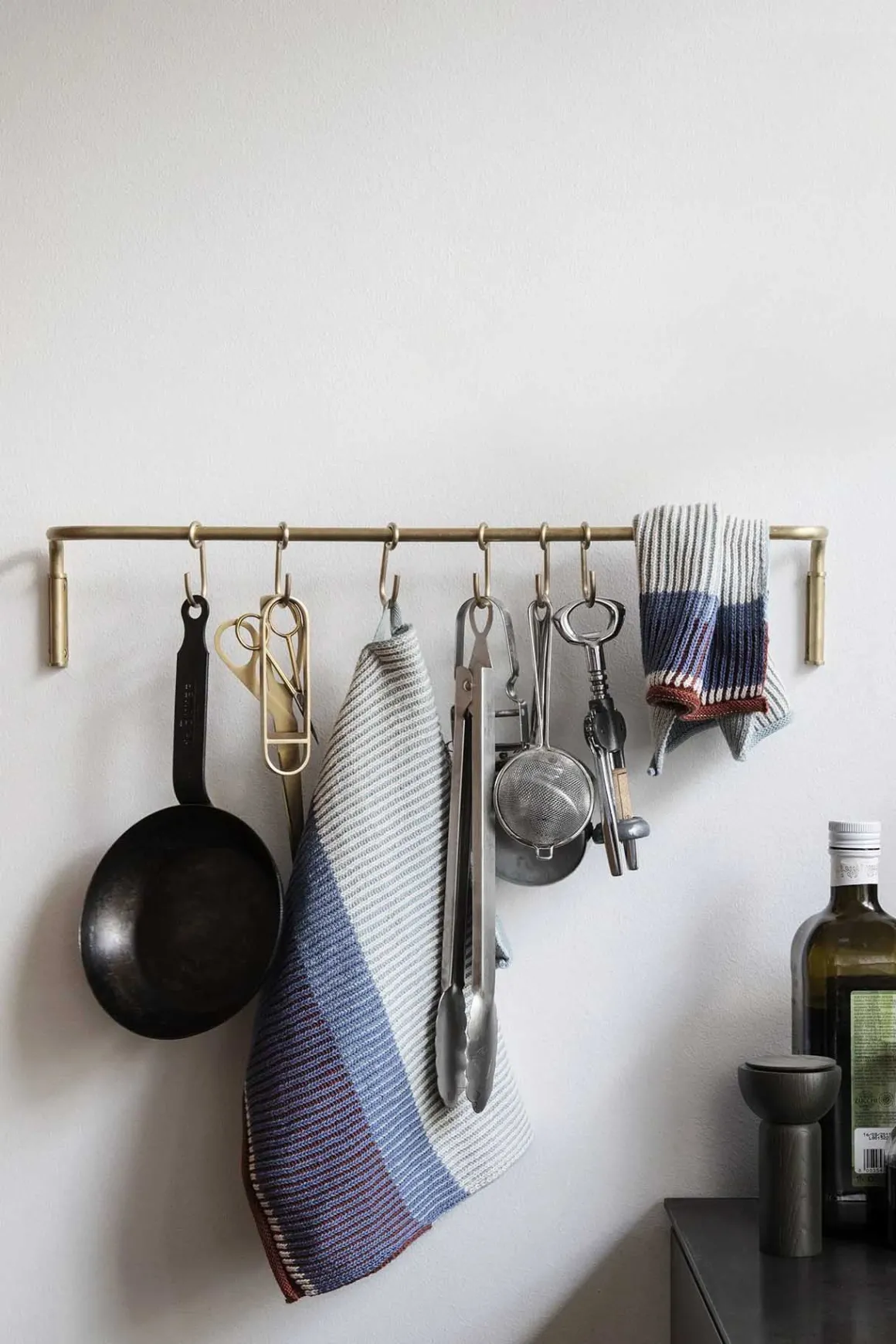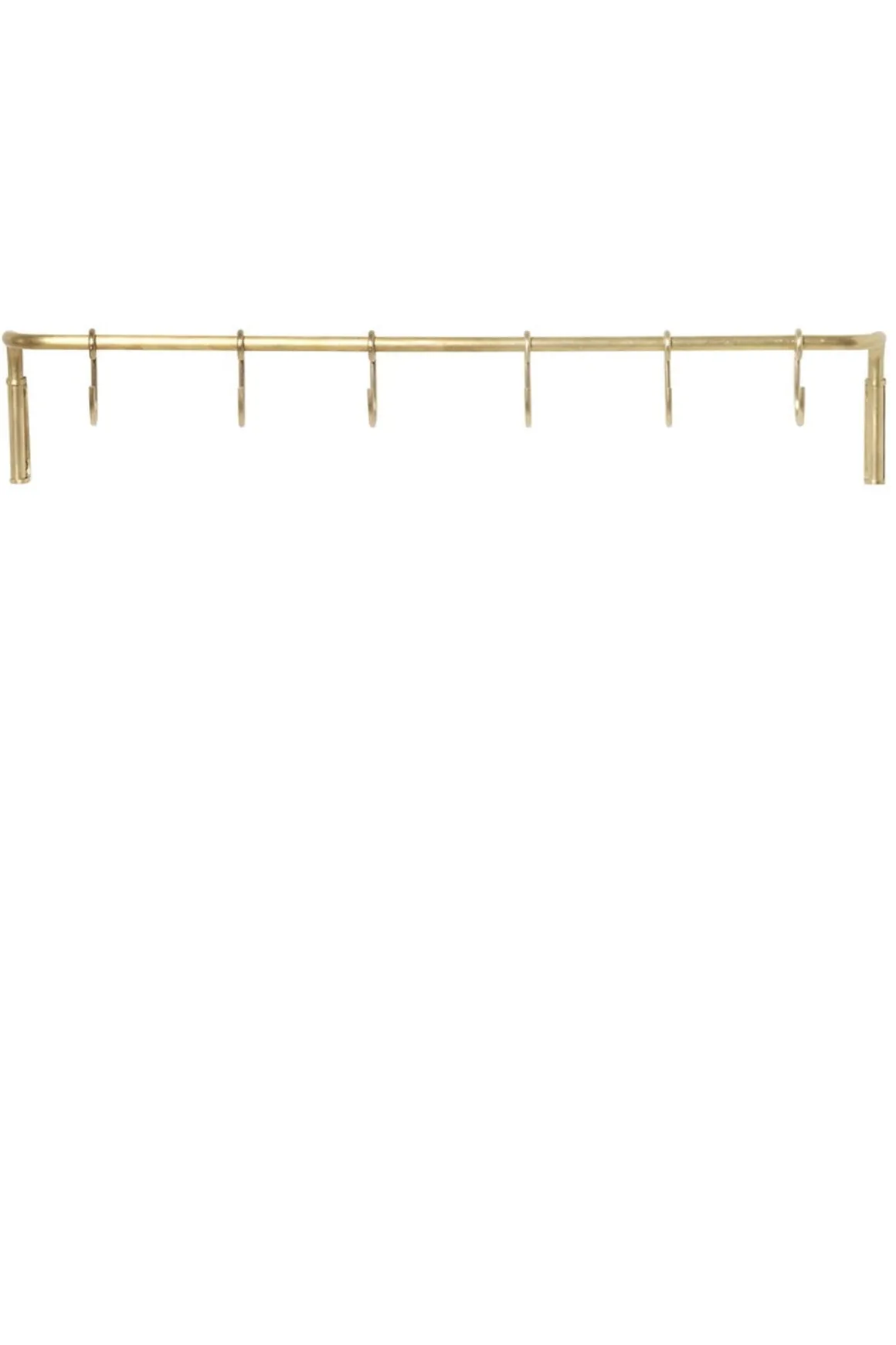 Enkel og stilren knaggrekke i messing fra Ferm Living. Knaggrekken gir deg en smart oppbevaringsmulighet for kjøkkenredskaper og tekstiler for eksempel. Den gir deg mulig her for ekstra benkeplass og mer oversikt, samtidig som den blir en kul del av interiøret. Bruk krokene for å frigjøre plass – bruk en av krokene til å henge dekor eller noe annet flott på for å mikse opp uttrykket til kjøkkenstangen. Laget av pulverlakkert metall.
