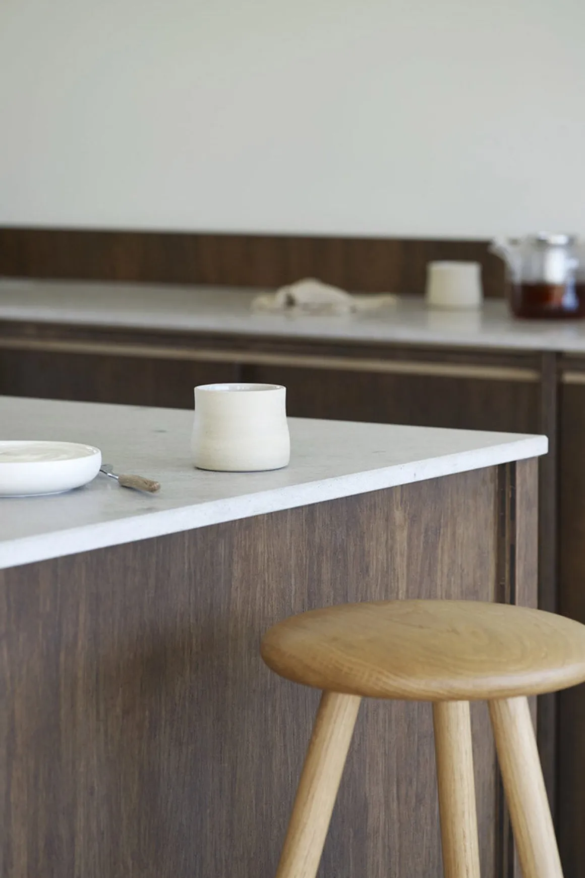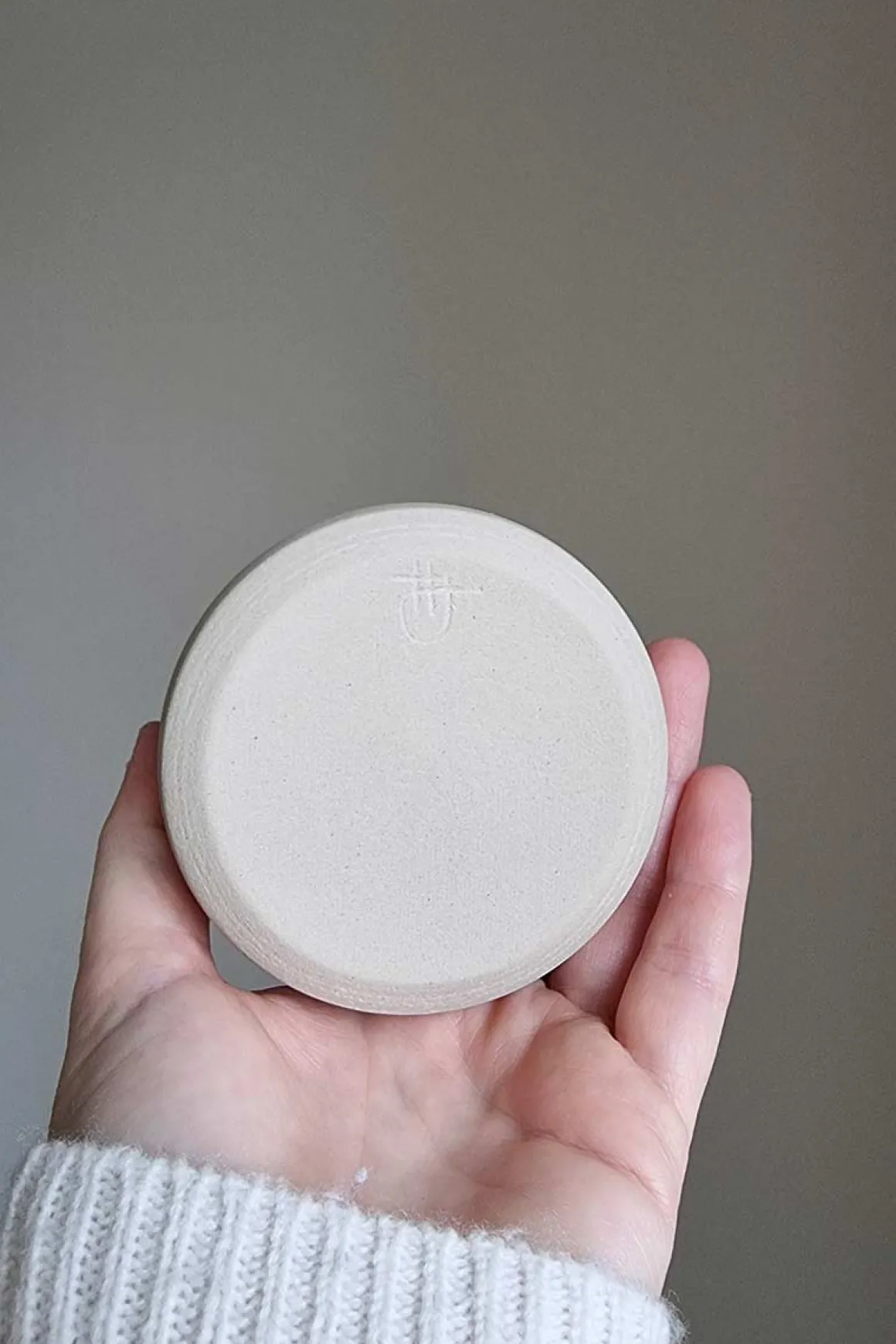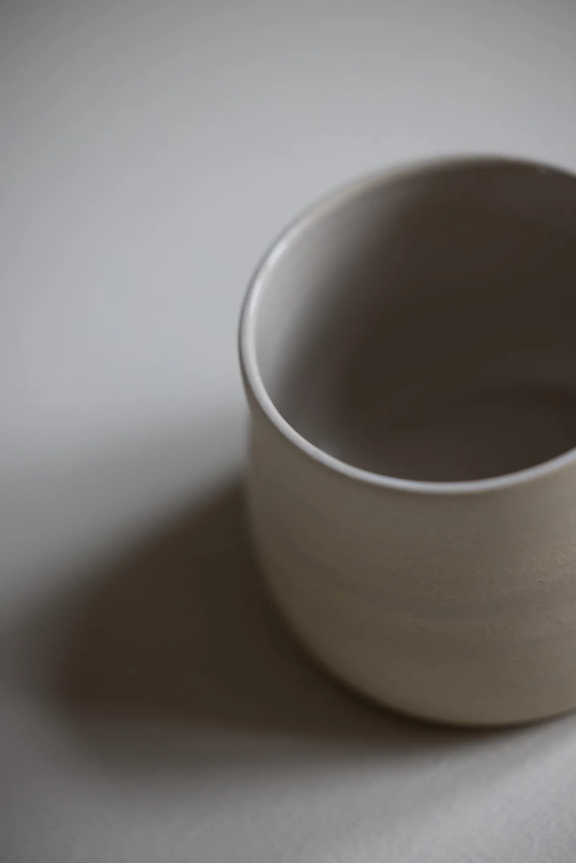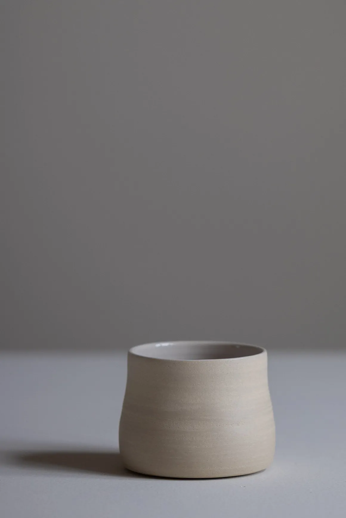Håndlaget kopp i keramikk fra keramiker Helene Jørgensen. Koppen er dreid for hånd med en matt, uglassert utside som fremhever leirens naturlige overflate. Innsiden er glasert med en blank, gjennomskinnelig glasur som skaper en myk kontrast. Koppen er uten hank og ligger godt i hånden, formet for å holde tett og kjenne varmen fra drikken. Hver kopp er unik, med små variasjoner i form og overflate. Jernprikker og fargevariasjoner kan forekomme, som er et naturlig spor av materialet og brenningsprosessen.