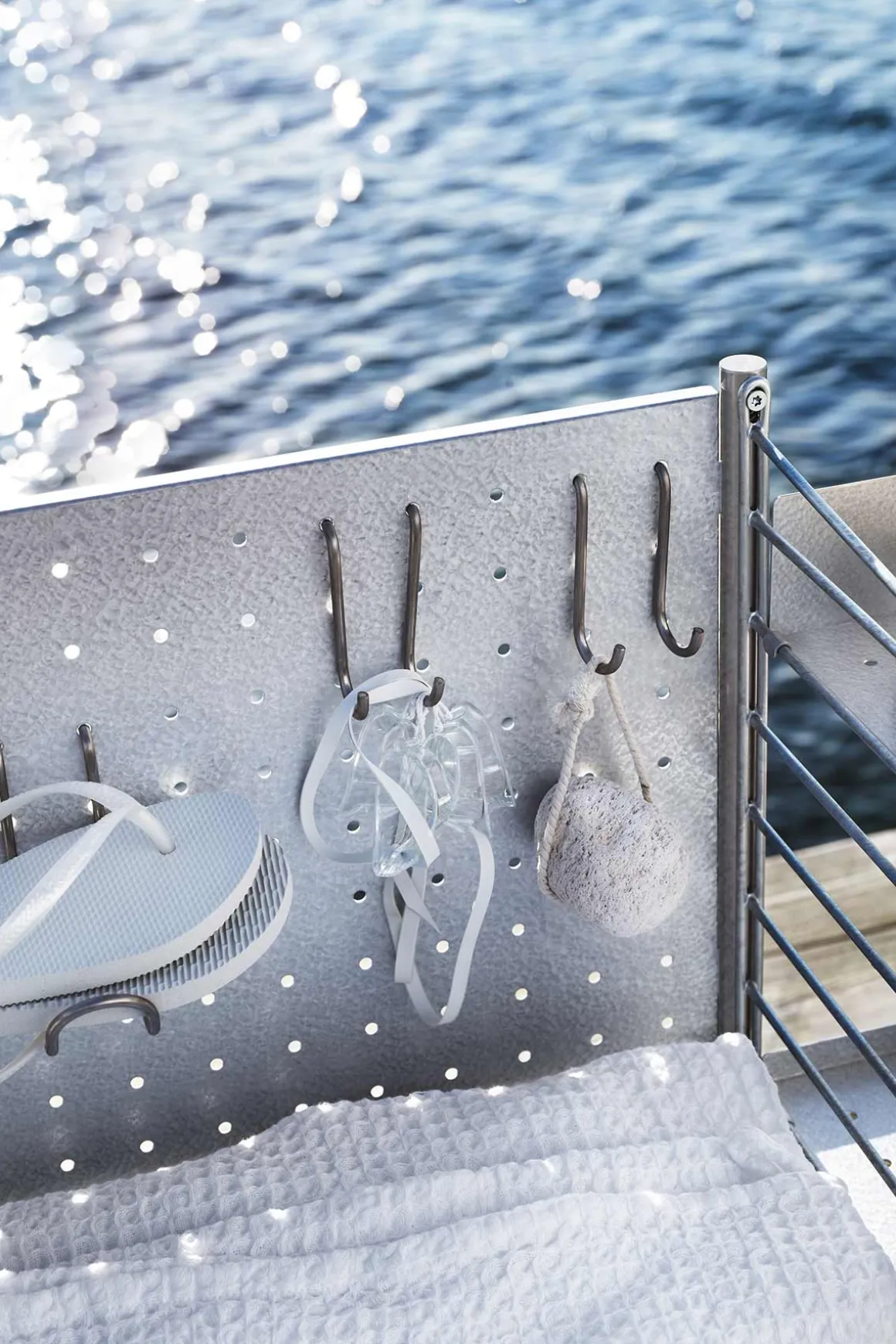 Den vertikale kroken er utviklet for bakplaten for å optimalisere den frittstående utendørs-hyllen. Kroken hjelper deg med å holde rede på hageredskaper, grillverktøy og andre utendørsaktiviteter. Kroken måler høyde 10 cm og dybde 3,5 cm (når kroken er montert på bakplaten). Kroken er laget av rustfritt stål og tåler alle slags vær. Hver pakke inneholder 4 kroker.