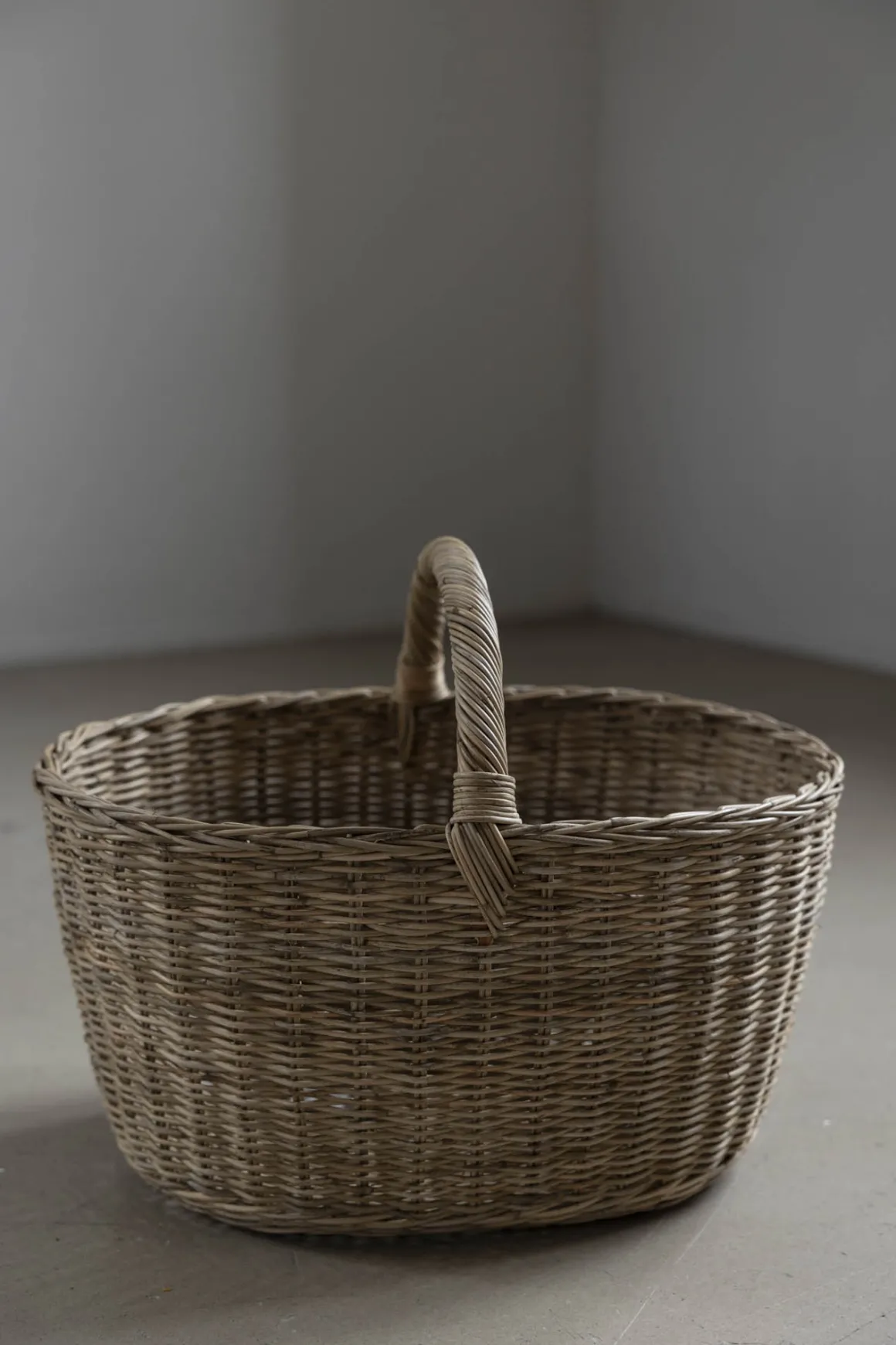 Stor oval shoppingkurv i grå rotting med bærehank fra Bruka. Bruk i stedet for handlepose i butikken, til piknik, sopptur, stranda ++ eller ha stående fremme til strikketøy og magasiner.