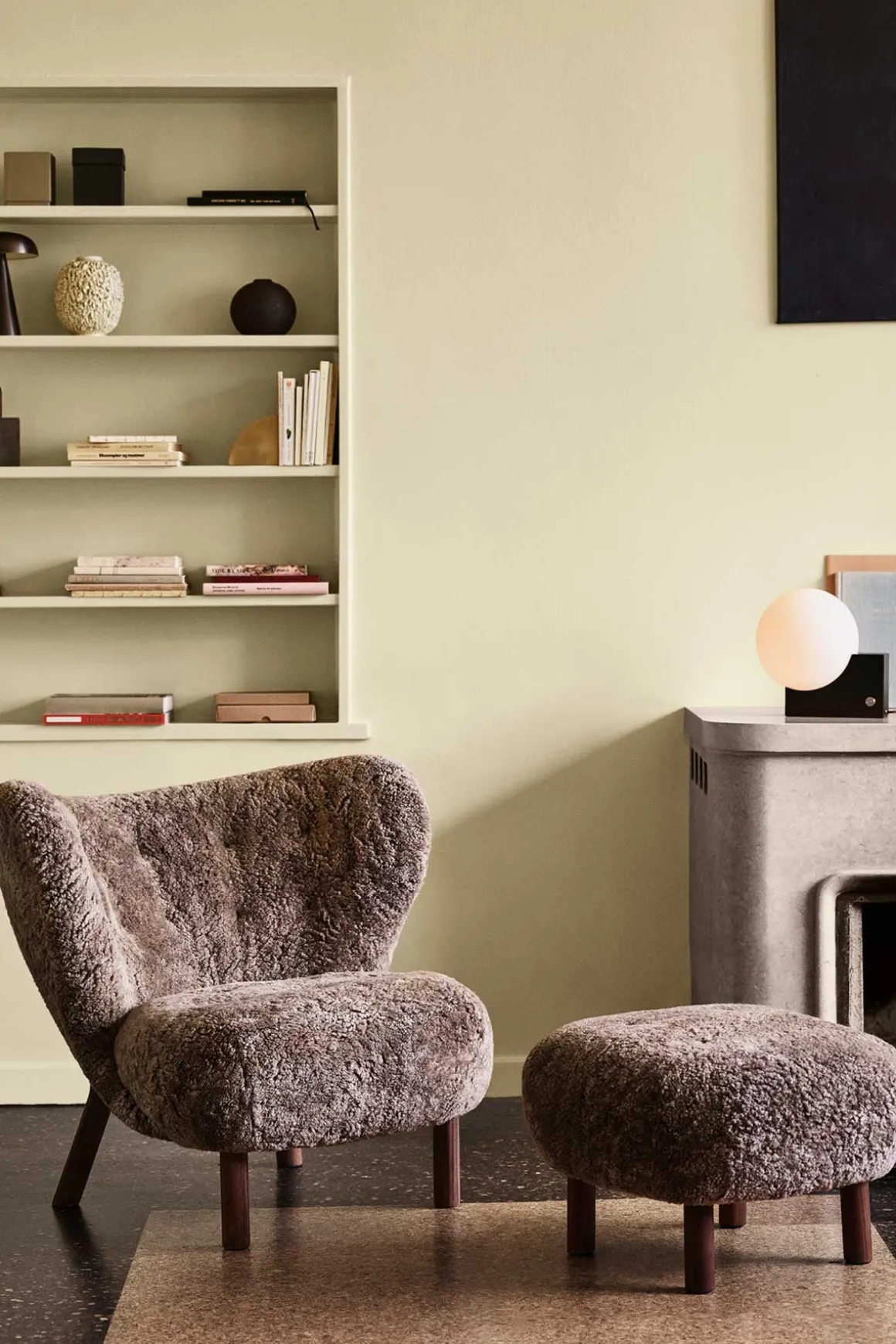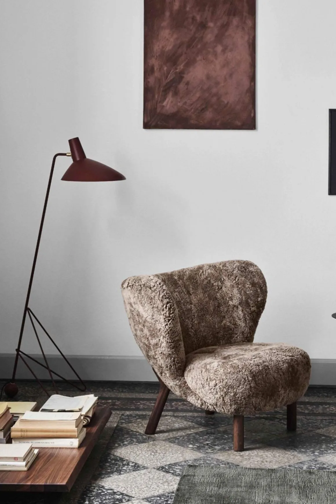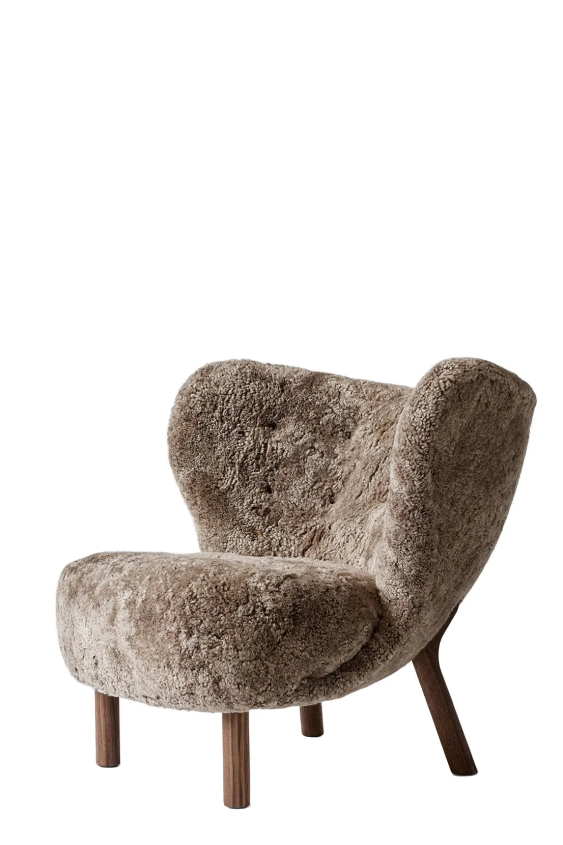 Little Petra Stol fra u0026amp;Tradition, designet av arkitekten Viggo Boesen i 1938. Little Petra ble øyeblikkelig en slager da den ble introdusert i 1938 på Copenhagen Cabinetmakers Guild Exhibition. Stolen er sterkt assosiert med starten på den danske funkis-stilen, og er en av få designs fra Boesen. Little Petra er overraskende allsidig og er i stand til å passe inn i alle slags rom, interiørstiler og miljøer. Denne versjonen har trekk i mørkt saueskinn med ben av valnøtt. En designklassiker som holder seg like moderne år etter år.