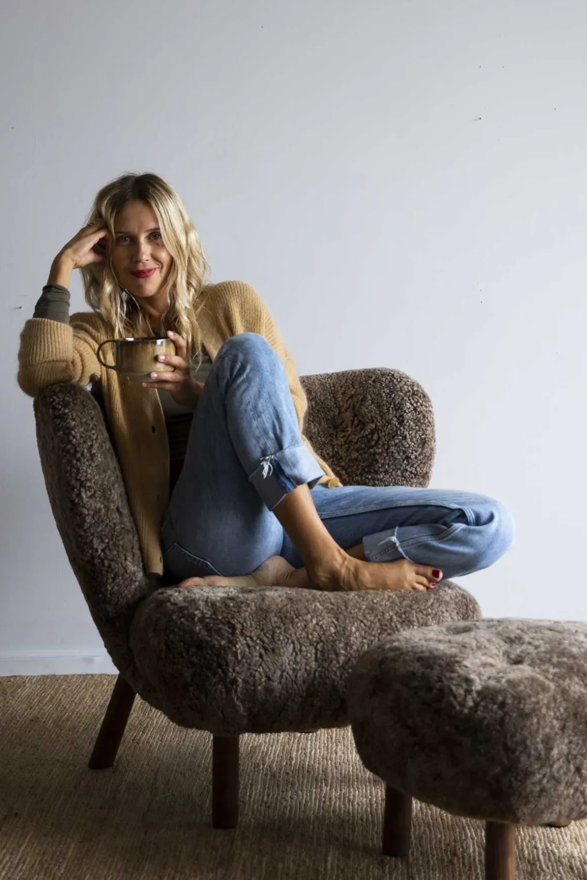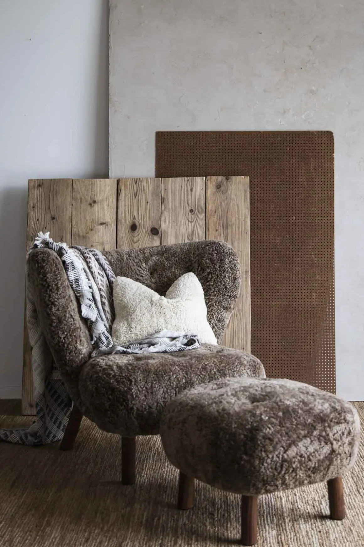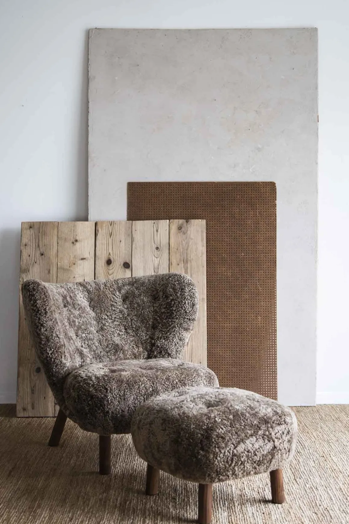 Little Petra Stol fra u0026amp;Tradition, designet av arkitekten Viggo Boesen i 1938. Little Petra ble øyeblikkelig en slager da den ble introdusert i 1938 på Copenhagen Cabinetmakers Guild Exhibition. Stolen er sterkt assosiert med starten på den danske funkis-stilen, og er en av få designs fra Boesen. Little Petra er overraskende allsidig og er i stand til å passe inn i alle slags rom, interiørstiler og miljøer. Denne versjonen har trekk i mørkt saueskinn med ben av valnøtt. En designklassiker som holder seg like moderne år etter år.