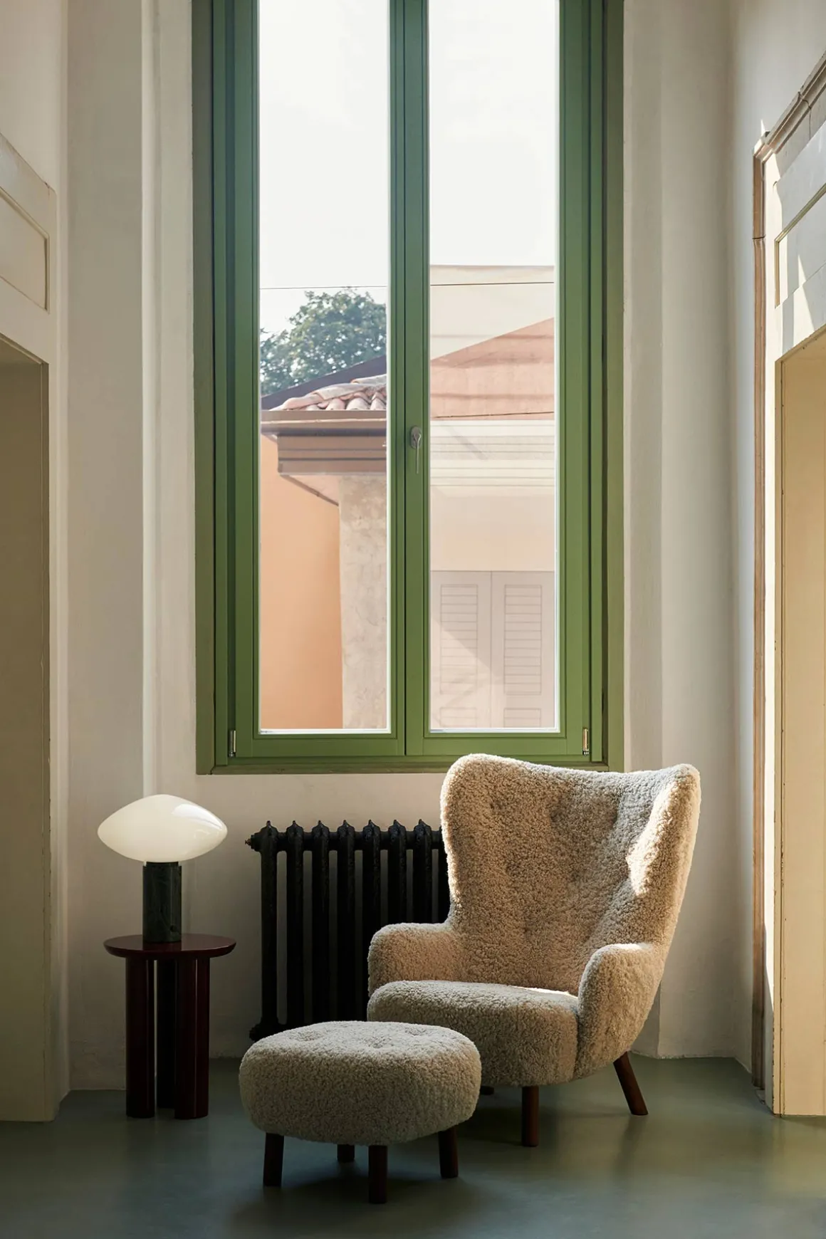 Petra Lounge Chair fra u0026amp;Tradition, basert på designet av arkitekten Viggo Boesen i 1938. Lenestolen Petra følger den store suksessen til Lille Petra, oppkalt etter Boesens svigermor, Petra – som var en liten kvinne med en stor personlighet, hvor hennes tilstedeværelse lå i den omfavnende kroppen til lenestolens design. Petra bærer nå den samme dristige karakteren og estetikken, men i en større form med en høyere, vinget ryggstøtte som omfavner kroppen og gir enestående komfort. Rammen er laget av massiv bøk og kryssfiner og deretter dekket med HR-skum og polyestervatt. Bena i heltre valnøtt og er dreid og CNC-frest. Petra ble øyeblikkelig en slager da den ble introdusert i 1938 på Copenhagen Cabinetmakers Guild Exhibition. Stolen er sterkt assosiert med starten på den danske funkis-stilen, og er en av få designs fra Boesen. Petra er overraskende allsidig og er i stand til å passe inn i alle slags rom, interiørstiler og miljøer. Denne versjonen har trekk i lyst saueskinn med ben av valnøtt. En designklassiker som holder seg like moderne år etter år.