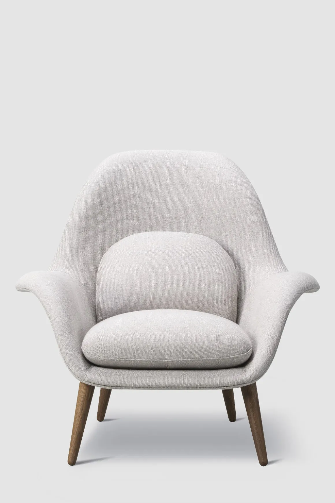 Swoon 1770 lenestol i ullstoffet Sunniva 717 fra Fredericia. Stolen er designet av Space Copenhagen som har klart å kombinere fantastisk sittekomfort med stilsikkert og varig design. Swoon har en organisk form med svært god støtte til ryggen og inviterer til umiddelbar avslapning, samtidig som designet er minimalistisk og stramt. Lenestolen gjør seg godt i stuen, på soverommet, og også i større resepsjonsområder og salonger. Swoon står utstilt på Bolina – kom gjerne innom for en prat og prøvesitt! Kan også bestilles med Ottoman puff i samme utførelse, for enda bedre komfort. Swoon er tilgjengelig med stolben i lakkert valnøtt, lakkert eik, beiset, røkt eik og sortlakkert eik.