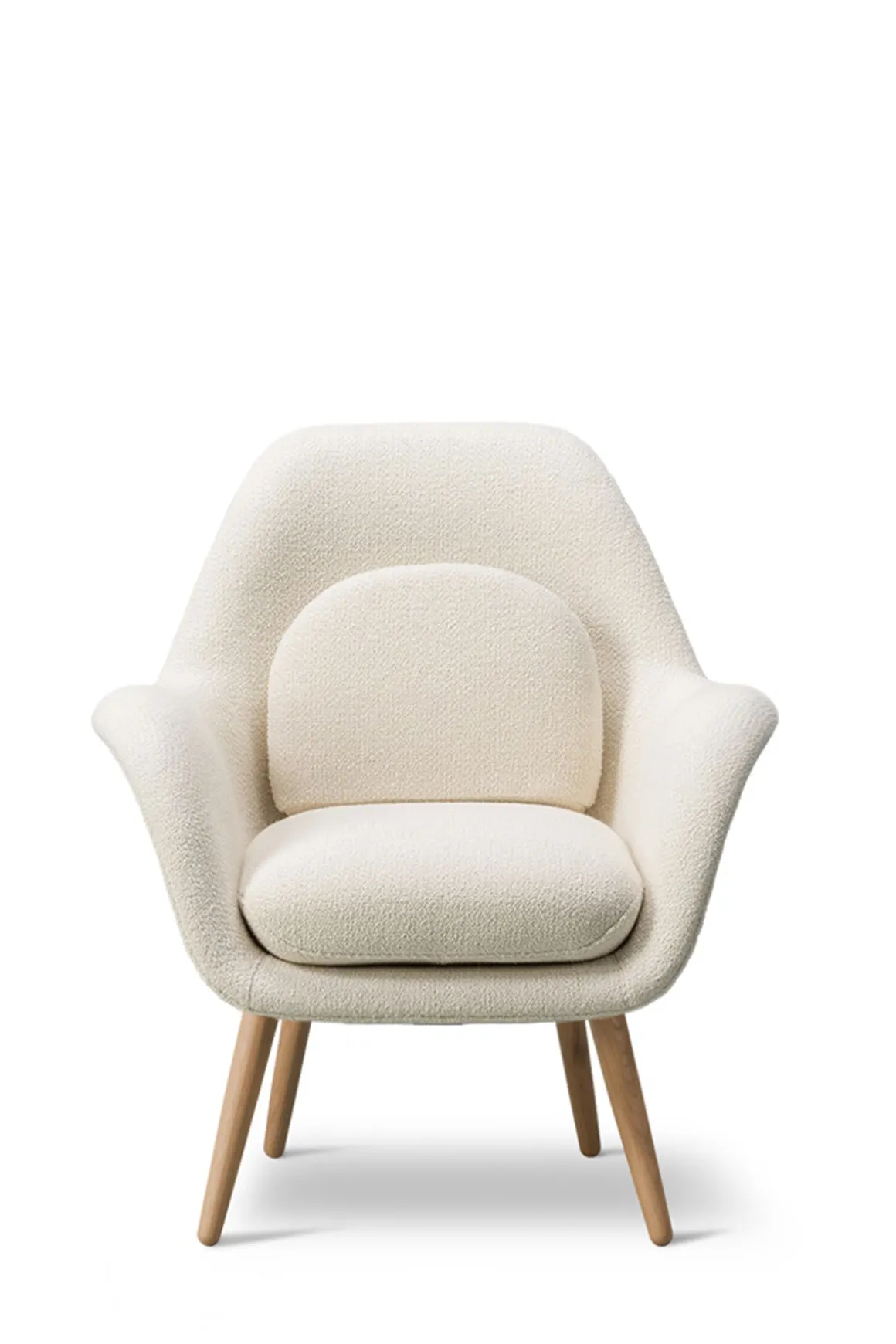 Swoon Petite 1774 lenestol fra Fredericia med base av valnøttre. Utført i det eksklusive stoffet Carlotto 200, et slitesterkt og ultramykt tekstil i off-white ullblanding med himmelsk bouclé tekstur. Med det enestående trekket som smelter sammen armlenene, setet og ryggen, i tillegg til støttende, myke puter, har du en moderne og skulpturell stol som passer i alle hjem. Swoon Lounge Petit er en nettere og hakket mer oppreist versjon av sin ikoniske forgjenger Swoon Lounge. Petite versjonen inviterer til total avslapning med sitt imøtekommende design og optimale sittekomfort med god ryggstøtte. Dette er en skandinavisk klassiker du vil få glede av i mange år fremover. I tillegg til diverse tekstiler kan du velge mellom base i flere materialer og stiler. Kom gjerne innom Bolina på Stabekk, hvor vi står klare med tekstilprøver og kan hjelpe deg med å designe din helt egen ‘drømme Swoon’.