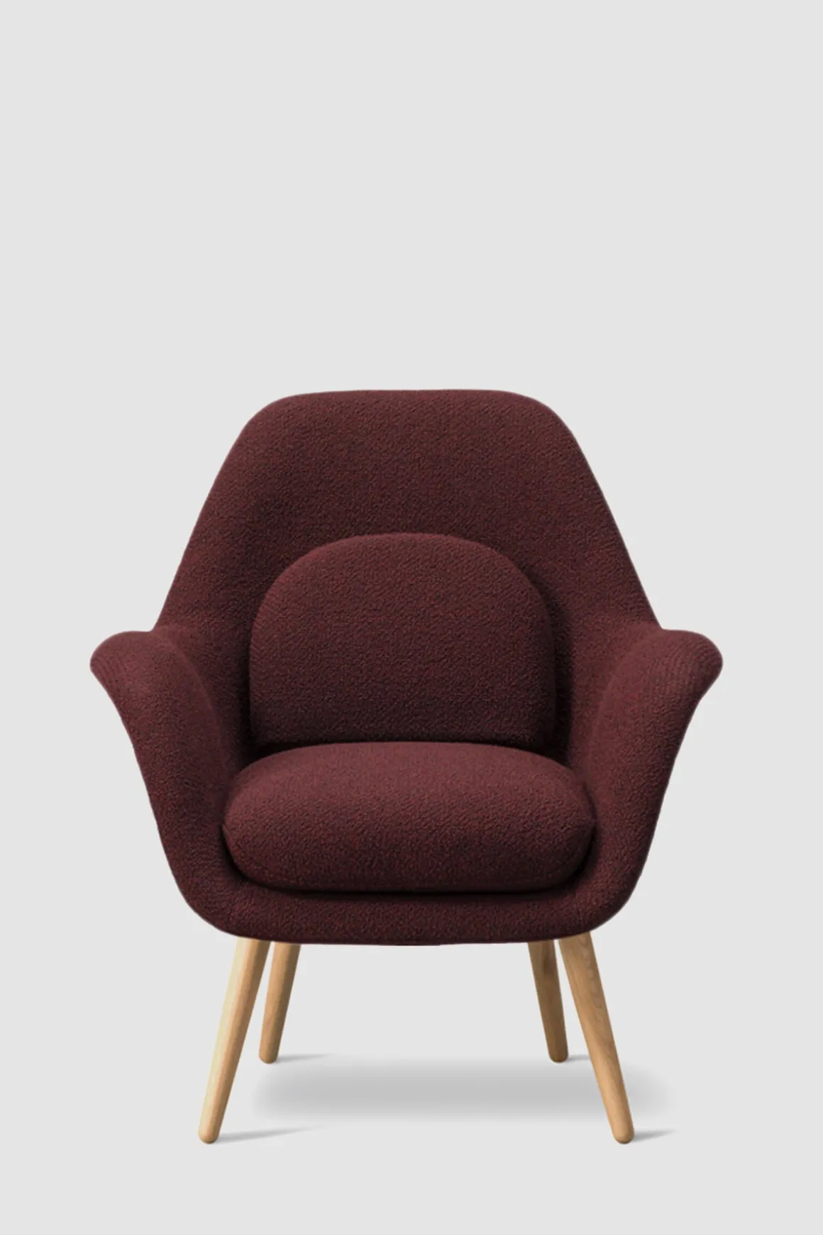 Swoon Petite 1774 lenestol fra Fredericia med base av oljet eik. Utført i det eksklusive stoffet Carlotto 500, et slitesterkt og mykt tekstil i mørkerød ullblanding med himmelsk bouclé tekstur. Det enestående trekket smelter sammen armlenene, setet og ryggen til et flott skall. Med tillegget av støttende, myke puter, har du en moderne og skulpturell stol som passer i alle hjem. Swoon Lounge Petit er en nettere og hakket mer oppreist versjon av sin ikoniske forgjenger Swoon Lounge. Petite versjonen inviterer til total avslapning med sitt imøtekommende design og optimale sittekomfort med god ryggstøtte. Dette er en skandinavisk klassiker du vil få glede av i alle rom. I tillegg til diverse tekstiler kan du velge mellom base i flere materialer og stiler. Kom gjerne innom Bolina på Stabekk, hvor vi står klare med tekstilprøver og kan hjelpe deg med å designe din helt egen ‘drømme Swoon’.