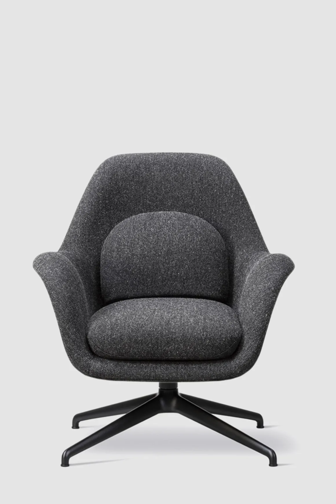 Swoon Petite 1776 svingstol har ben i sort stål og er utført i det eksklusive stoffet Hallingdal 180, et slitesterkt og mykt stoff i koksgrå ull- og viskoseblanding. Med det enestående trekket som smelter sammen armlenene, setet og ryggen, i tillegg til støttende, myke puter, har du en moderne og skulpturell stol som passer i alle hjem. Swoon Lounge Petit er en nettere og hakket mer oppreist versjon av sin ikoniske forgjenger Swoon Lounge. Petite versjonen inviterer til total avslapning med sitt imøtekommende design og optimale sittekomfort. Dette er en skandinavisk klassiker du vil få glede av i stuen, på kontoret eller ved spisebordet. I tillegg til diverse tekstiler kan du velge mellom baser i flere materialer og stiler. Kom gjerne innom Bolina på Stabekk, hvor vi står klare med tekstilprøver og kan hjelpe deg med å designe din helt egen ‘drømme Swoon’.