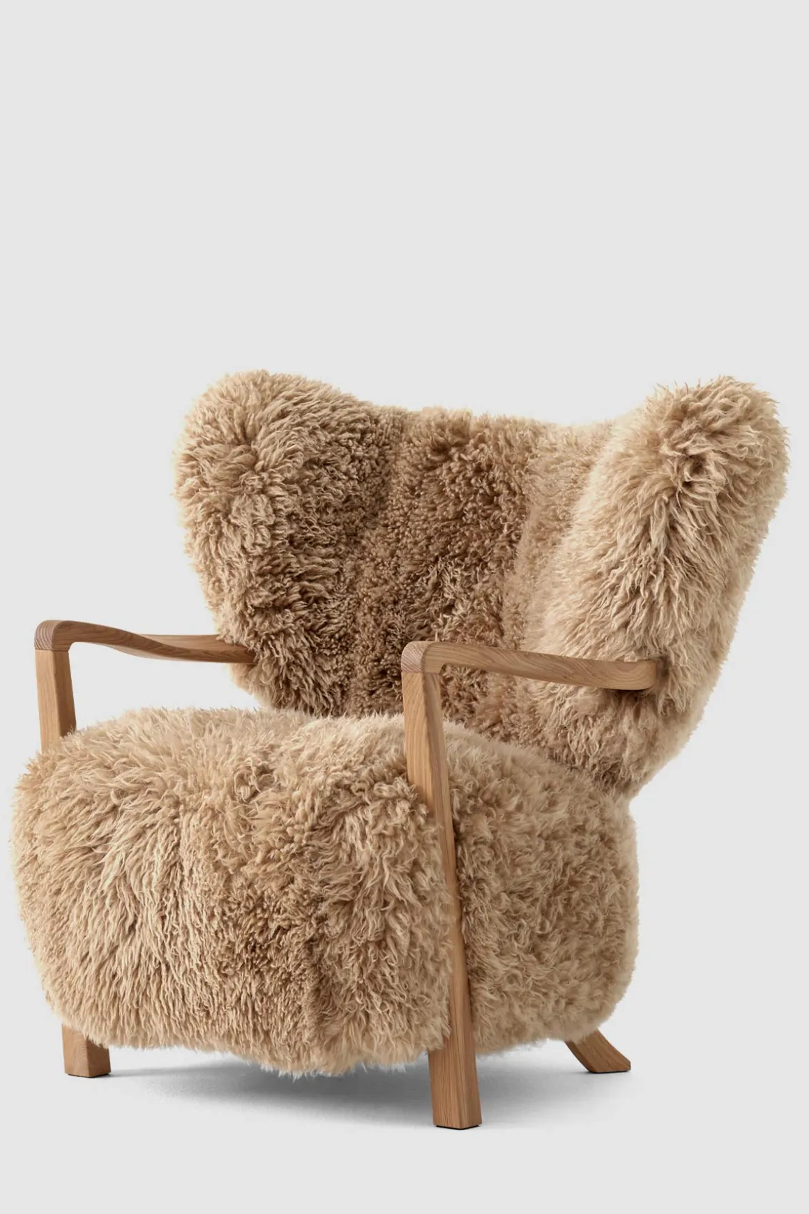 Finn roen med Wulff lenestol fra u0026amp;Tradition. Wulff er en polstret loungestol som hyller de håndlagde designene fra 1930-tallet. Stolrammen er laget av massiv bøk og kryssfiner og deretter dekket med HR-skum og polyestervatt. Bena i heltre eik er dreid, CNC-frest og oljet. Stolen har et luksuriøst, mykt trekk av langhåret saueskinn som dekker setet og ryggstøtten. Wulff står for overlegent håndverk og enestående komfort. Loungestolens arkitektoniske form vil gi et stilig uttrykk til ethvert interiør og vil være et velkomment møbel i stua eller på soverommet. Man kan også kjøpe matchende puff til hvis man ønsker det.