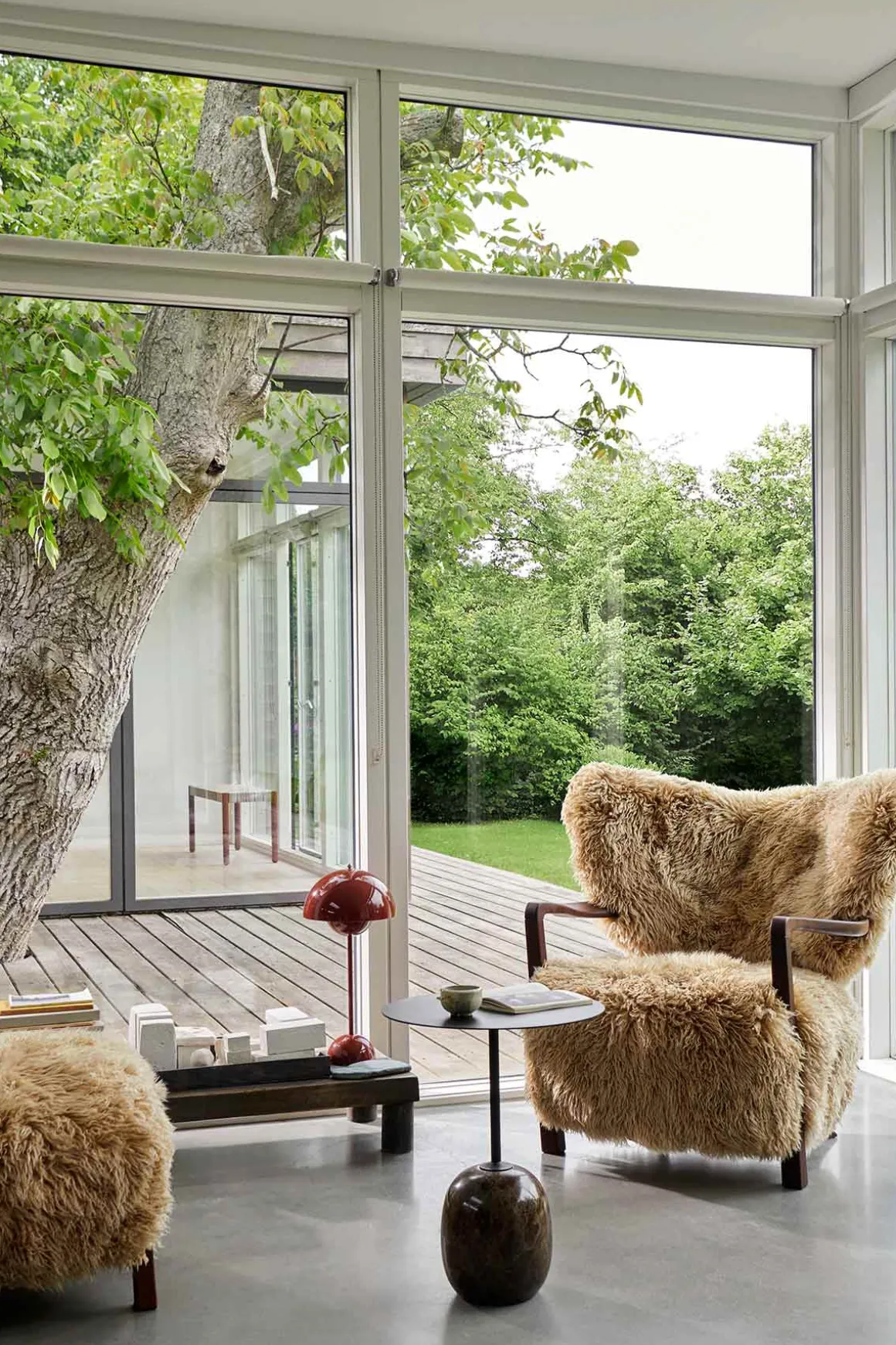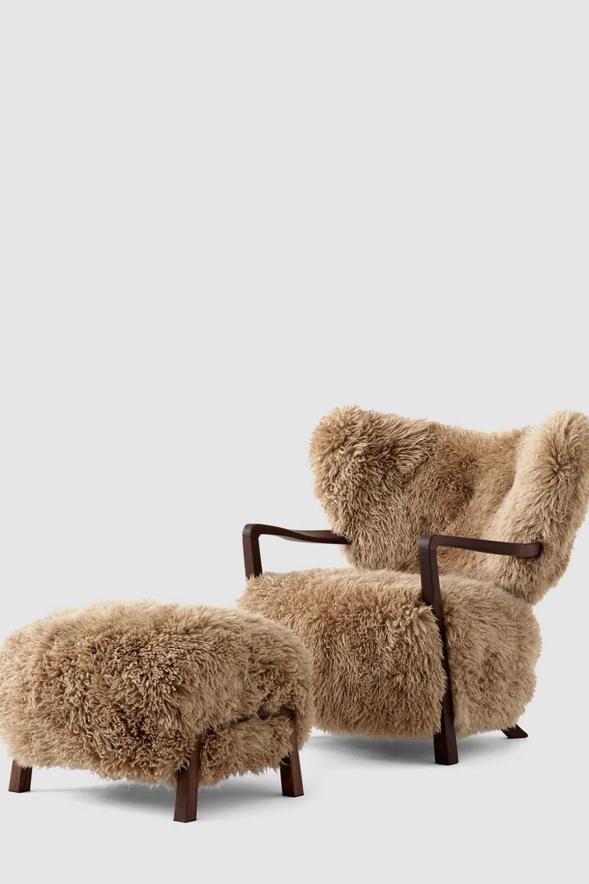 Finn roen med Wulff lenestol fra u0026amp;Tradition. Wulff er en polstret loungestol som hyller de håndlagde designene fra 1930-tallet. Stolrammen er laget av massiv bøk og kryssfiner og deretter dekket med HR-skum og polyestervatt. Bena i heltre valnøtt er dreid, CNC-frest og oljet. Stolen har et luksuriøst, mykt trekk av langhåret saueskinn som dekker setet og ryggstøtten. Wulff står for overlegent håndverk og enestående komfort. Loungestolens arkitektoniske form vil gi et stilig uttrykk til ethvert interiør og vil være et velkomment møbel i stua eller på soverommet. Man kan også kjøpe matchende puff til hvis man ønsker det.
