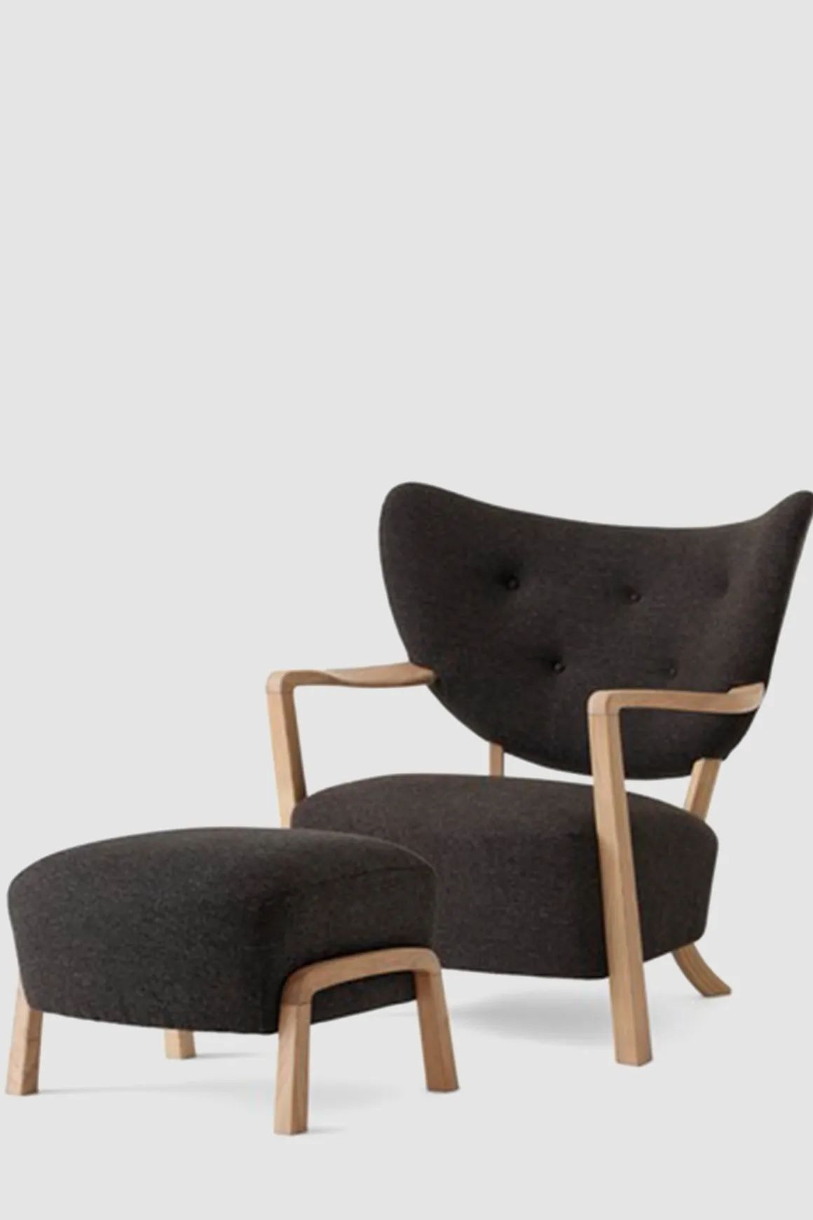 Finn roen med Wulff lenestol og puff fra u0026amp;Tradition. Wulff er en polstret loungestol som hyller de håndlagde designene fra 1930-tallet. Stolrammen er laget av massiv bøk og kryssfiner og deretter dekket med HR-skum og polyestervatt. Bena i heltre eik er dreid, CNC-frest og oljet. Stolen har et luksuriøst, mykt trekk som dekker setet og ryggstøtten. Stolen er trukket i stoffet Hallingdal; et grovtvevet og