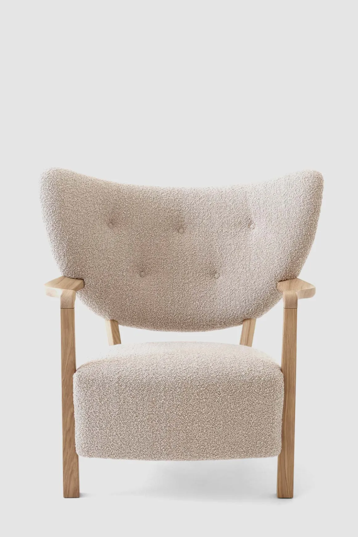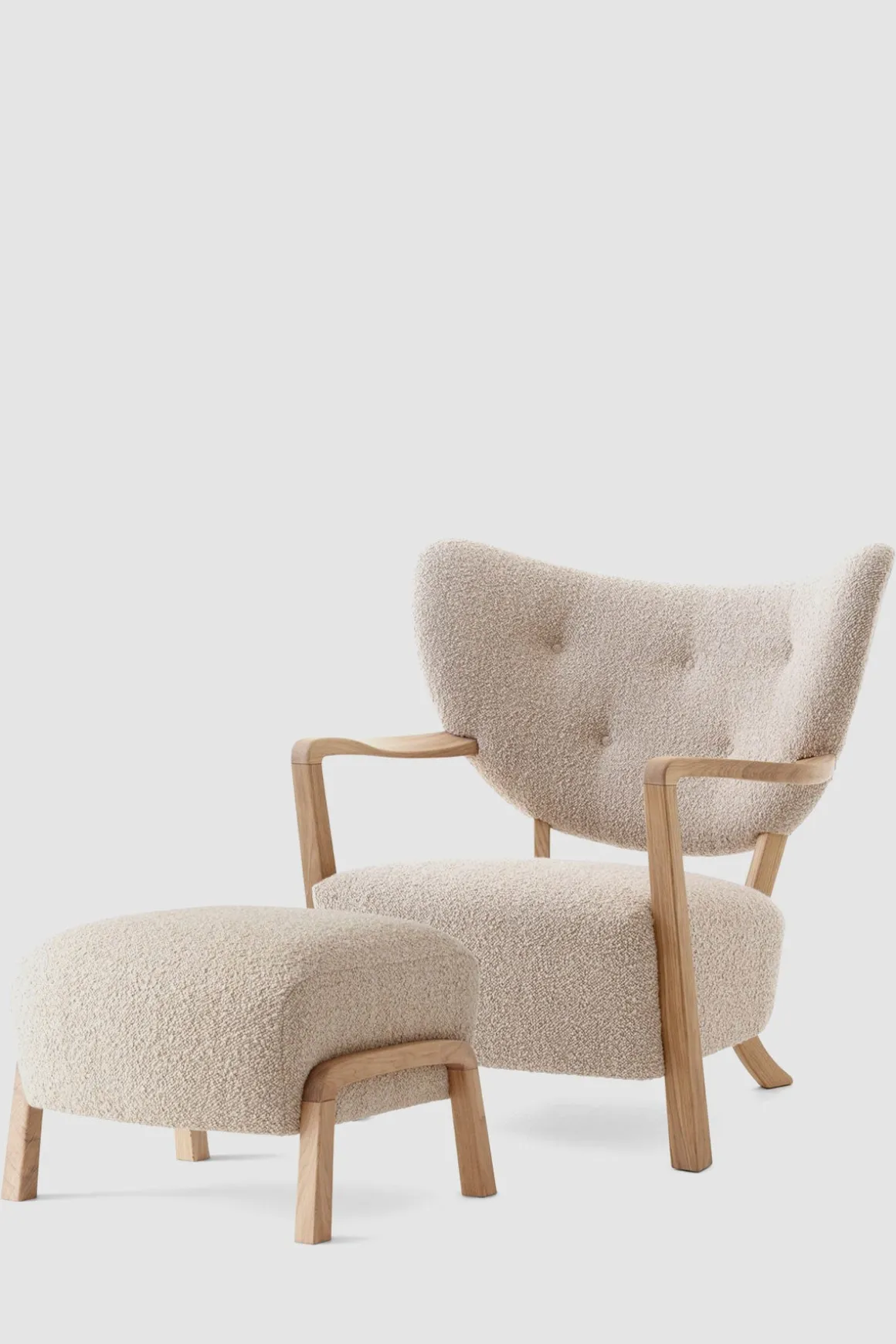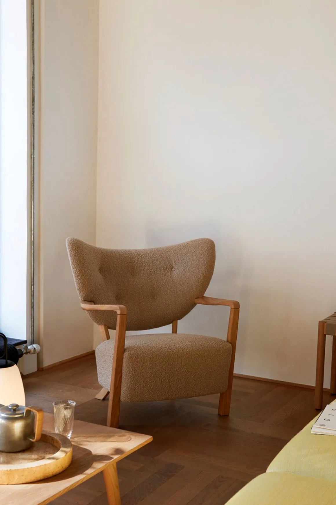 Finn roen med Wulff lenestol og puff fra u0026amp;Tradition. Wulff er en polstret loungestol som hyller de håndlagde designene fra 1930-tallet. Stolrammen er laget av massiv bøk og kryssfiner og deretter dekket med HR-skum og polyestervatt. Bena i heltre eik er dreid, CNC-frest og oljet. Stolen har et luksuriøst, mykt trekk som dekker setet og ryggstøtten. Stolen er trukket i stoffet Karakorum; et boucléstoff med små løkker som kruser overflaten og tilfører bevegelse og personlighet. Wulff står for overlegent håndverk og enestående komfort. Loungestolens arkitektoniske form vil gi et stilig uttrykk til ethvert interiør og vil være et velkomment møbel i stua eller på soverommet. Den tilhørende puffen er håndlaget med ben av solid eik og kommer i samme møbeltrekk som loungestolen. Bruk den enten som fotskammel til Wulff-stolen eller som en sjarmerende loungekrakk alene.
