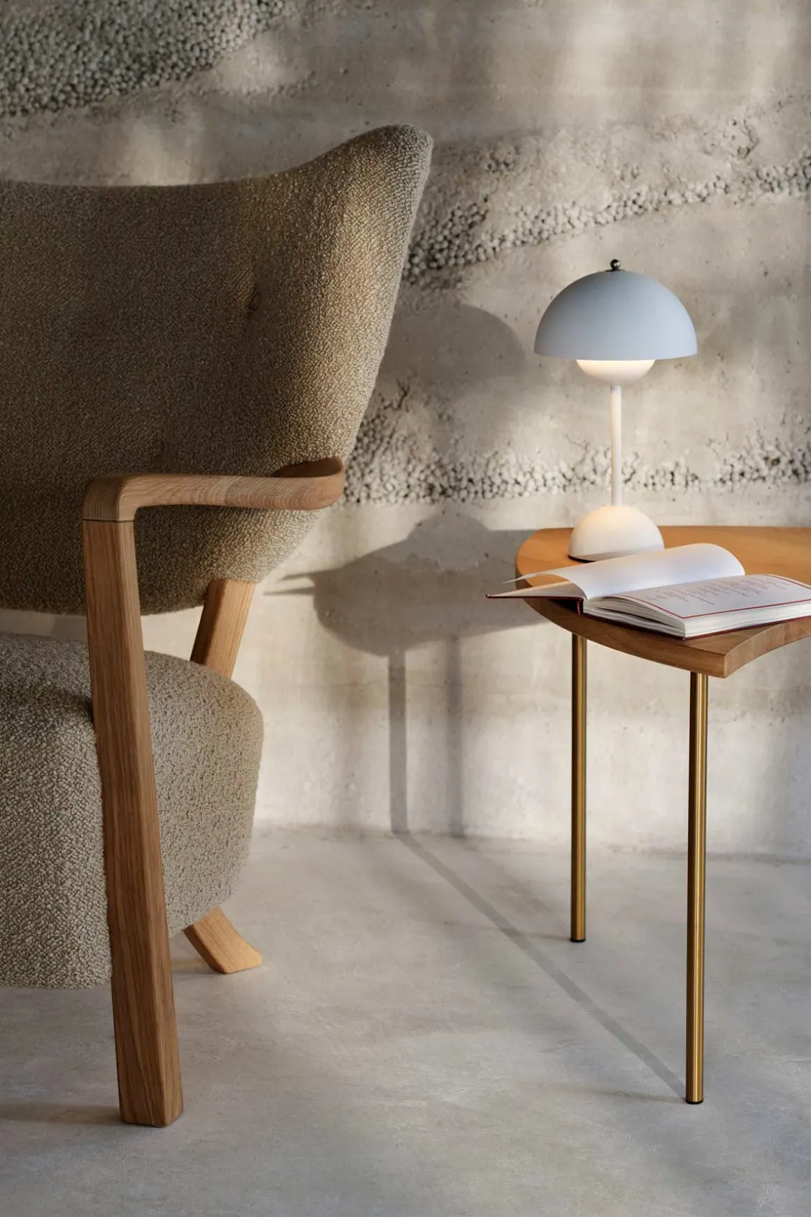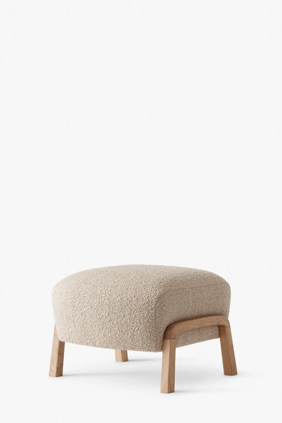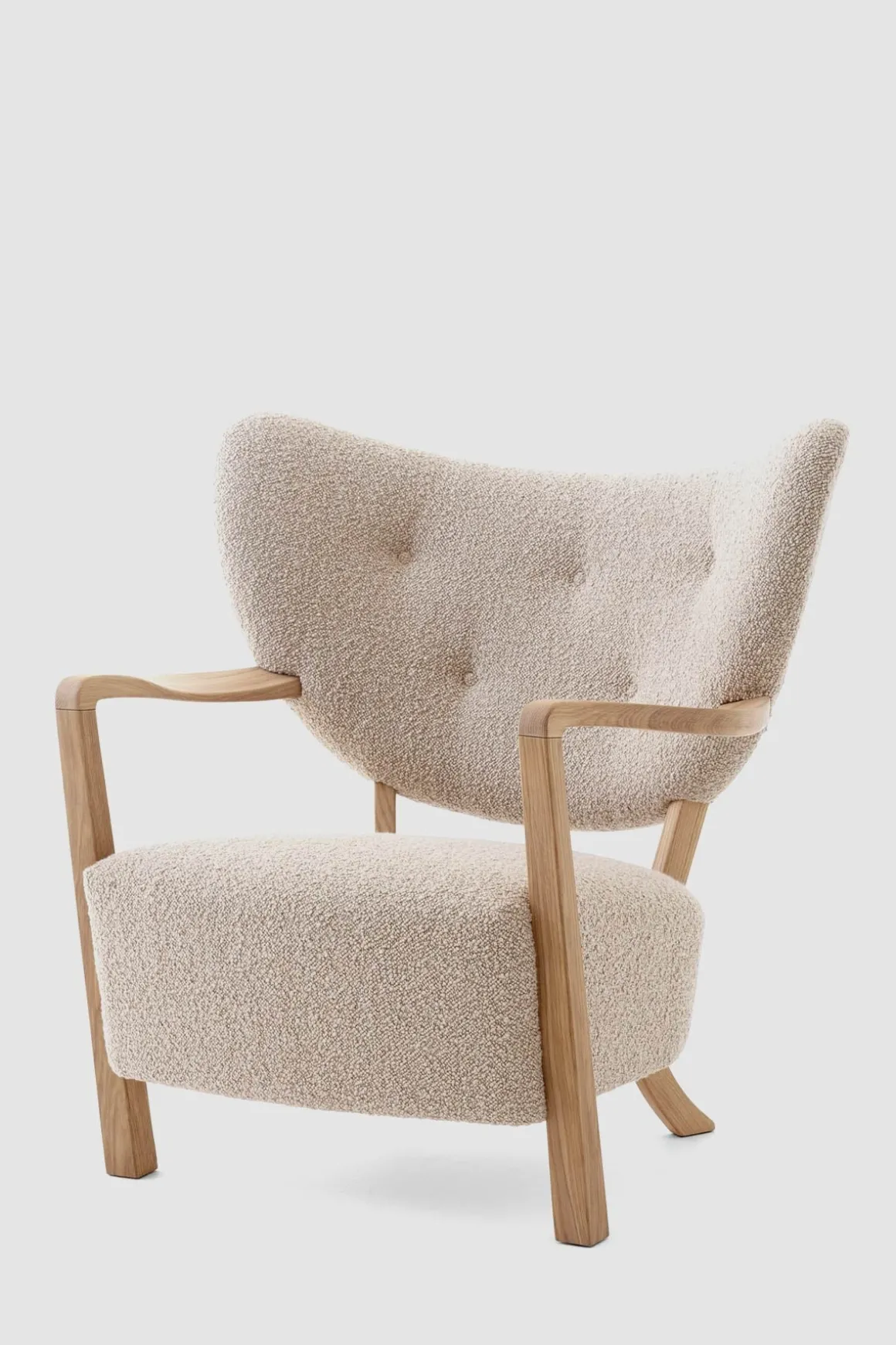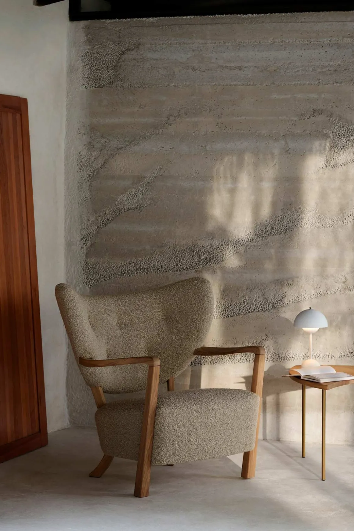 Finn roen med Wulff lenestol og puff fra u0026amp;Tradition. Wulff er en polstret loungestol som hyller de håndlagde designene fra 1930-tallet. Stolrammen er laget av massiv bøk og kryssfiner og deretter dekket med HR-skum og polyestervatt. Bena i heltre eik er dreid, CNC-frest og oljet. Stolen har et luksuriøst, mykt trekk som dekker setet og ryggstøtten. Stolen er trukket i stoffet Karakorum; et boucléstoff med små løkker som kruser overflaten og tilfører bevegelse og personlighet. Wulff står for overlegent håndverk og enestående komfort. Loungestolens arkitektoniske form vil gi et stilig uttrykk til ethvert interiør og vil være et velkomment møbel i stua eller på soverommet. Den tilhørende puffen er håndlaget med ben av solid eik og kommer i samme møbeltrekk som loungestolen. Bruk den enten som fotskammel til Wulff-stolen eller som en sjarmerende loungekrakk alene.