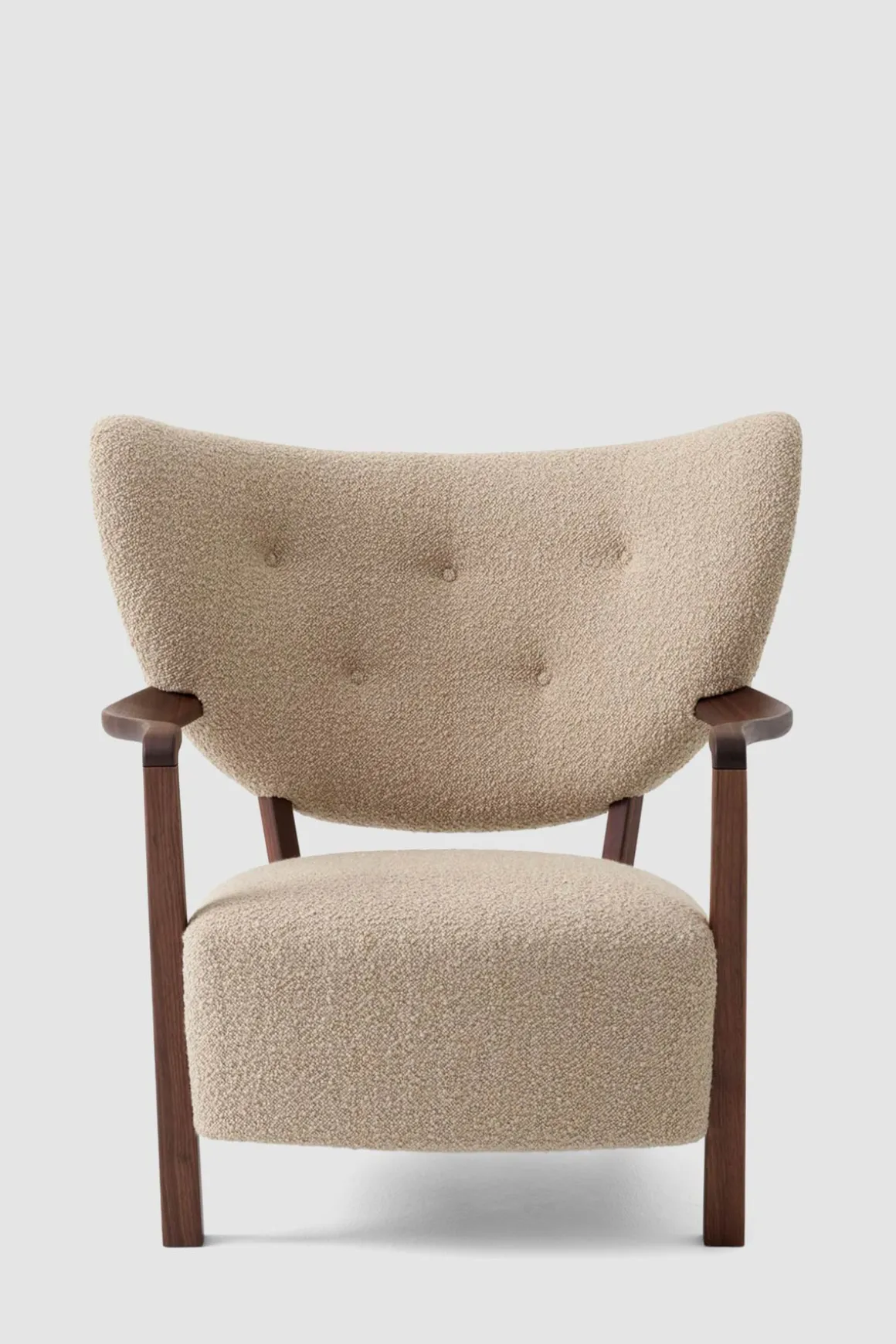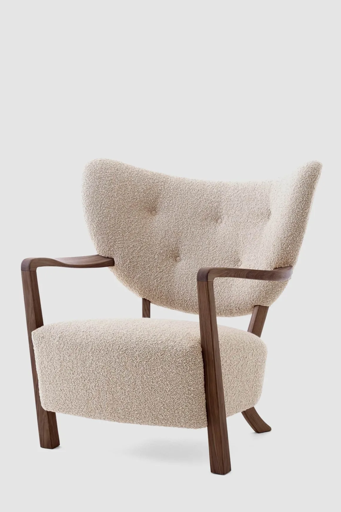 Finn roen med Wulff lenestol og puff fra u0026amp;Tradition. Wulff er en polstret loungestol som hyller de håndlagde designene fra 1930-tallet. Stolrammen er laget av massiv bøk og kryssfiner og deretter dekket med HR-skum og polyestervatt. Bena i heltre valnøtt er dreid, CNC-frest og oljet. Stolen har et luksuriøst, mykt trekk som dekker setet og ryggstøtten. Stolen er trukket i stoffet Karakorum; et boucléstoff med små løkker som kruser overflaten og tilfører bevegelse og personlighet. Wulff står for overlegent håndverk og enestående komfort. Loungestolens arkitektoniske form vil gi et stilig uttrykk til ethvert interiør og vil være et velkomment møbel i stua eller på soverommet. Den tilhørende puffen er håndlaget med ben av solid valnøtt og kommer i samme møbeltrekk som loungestolen. Bruk den enten som fotskammel til Wulff-stolen eller som en sjarmerende loungekrakk alene.