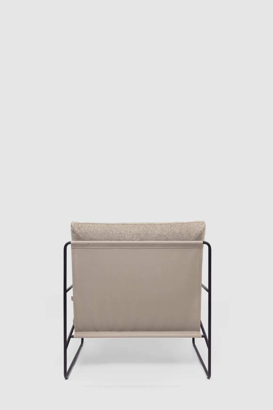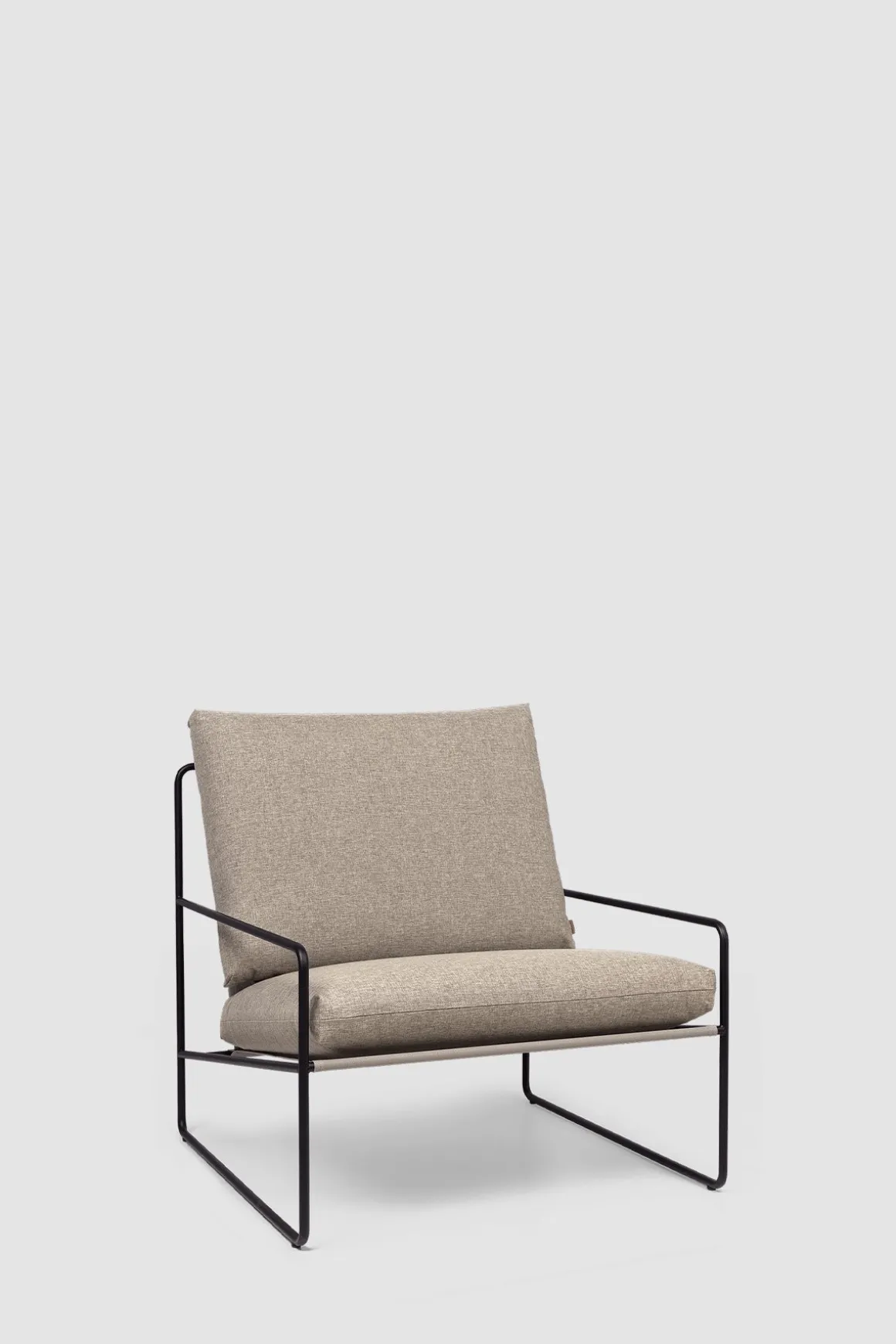 klassisk profil fra Ferm Living. Vår og sommer betyr avslapning og kvalitetstid tilbrakt utendørs. Kombiner gjerne stolen med 2 eller 3-seter sofa fra Desert-serien, og skap et innbydende salongområde hvor det er god plass til å sole seg, lese bøker og underholde venner og familie. Med det uforutsigbare været i tankene, er Desert Stolen designet for utendørs bruk og er komplettert med koselige sofaputer som er både vann- og UV-bestandige. Stolen kommer i et sandfarget trekk med sort ramme. Stilfull, minimalistisk og komfortabel.