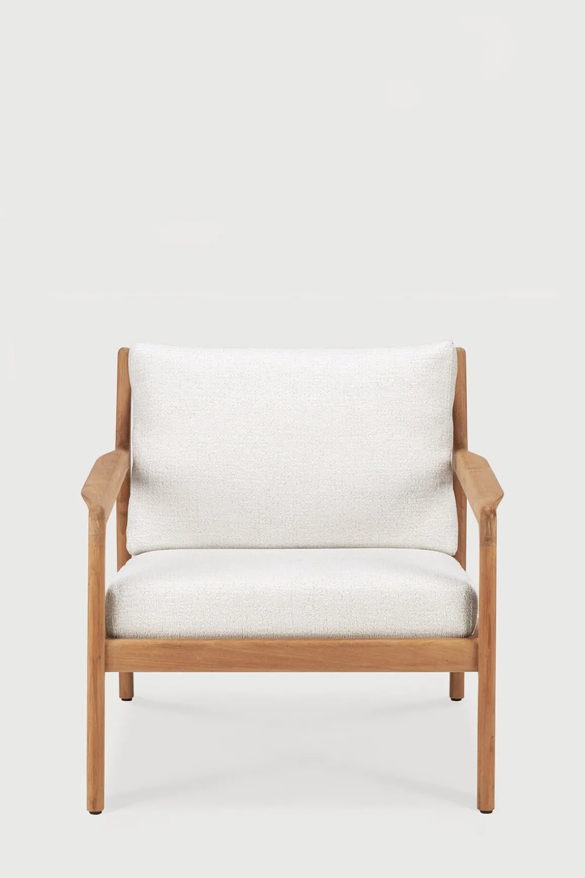Jack-utestol i teak fra Ethnicraft. Lounge-stolen er enkel med moderne detaljer og solid konstruksjon. Det avslappede og myke uttrykket inviterer deg til komplett avslapning, og sittekomforten sørger for at man aldri vil reise seg opp igjen. De behagelige putene har fyll av hurtigtørkende skum og er trukket med stoff av ypperste kvalitet, vevd i Belgia. Perfekt til ditt uterom hjemme eller på hytta. Kombiner med andre møbler fra Jack-serien for en komplett look.