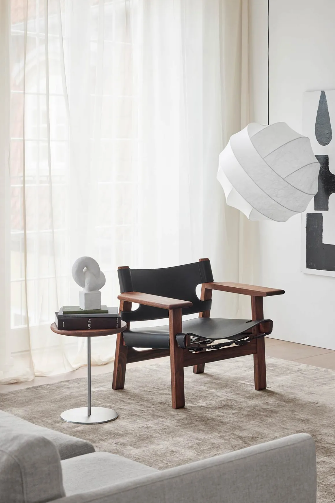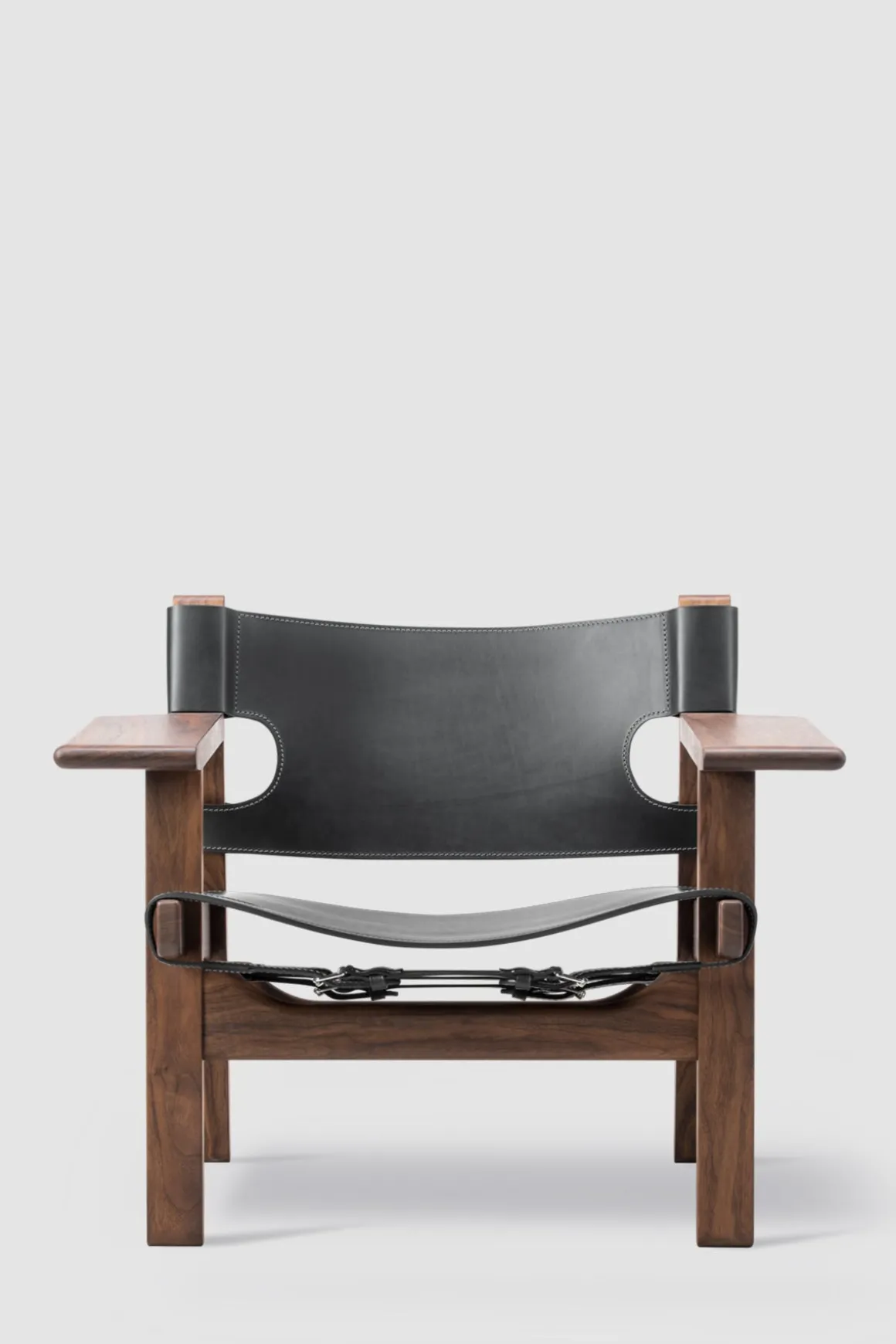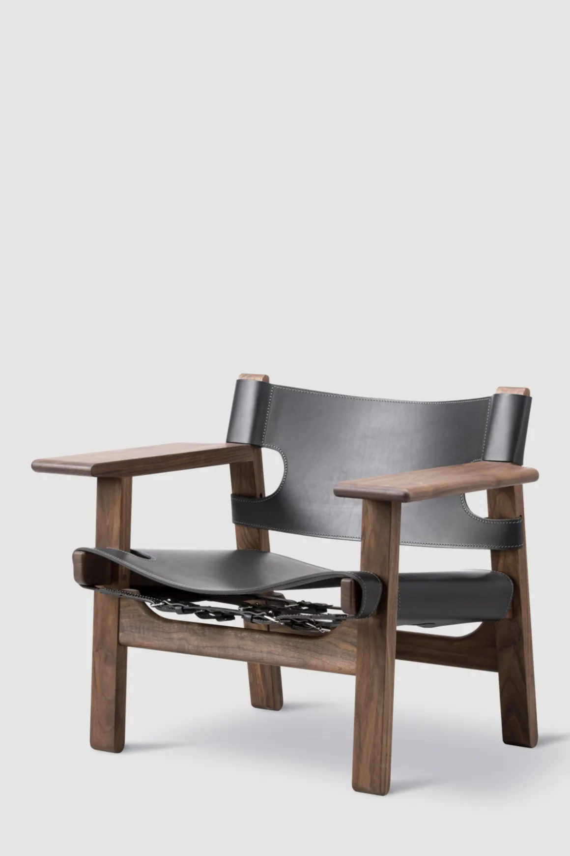 Ikoniske Spanish Chair i ny drakt med stilrent sort skinn og understell i eksklusiv, oljet, amerikansk valnøtt fra danske Fredericia. Funksjonsdrevet design, nøysomt håndverk, naturlige materialer og vakre, gjennomtenkte detaljer, gjør Spanish Chair til en moderne designklassiker som er like aktuell i dag som da den først ble designet. Børge Mogensen tegnet spanskestolen etter en tur til Spania i 1958 med Hans J. Wegner. Stolen er inspirert av en tradisjonell stol med brede armlener fra området. Han moderniserte formen, men beholdt de karakteristiske, brede armlenene så man lett kan sette fra seg glasset eller kaffekoppen. Materialene brukt i loungestolen er av den høyeste kvalitet og utførelse; fra kvartsaget, massiv eik eller valnøtt, til vegetabilsk farget skinn og messingspenner, som sammen gir stolen et enkelt og sterkt uttrykk. Med tiden vil skinnet strekke seg og man kan ta i bruk messingspennene under for å stramme skinnet tilbake til sin opprinnelige form. Stolen vil etterhvert utvikle en vakker patina som gir karakter, og som bare gjør den finere med tiden. De slitesterke og bærekraftige materialene gjør at stolen har svært lang levetid og kan gå i arv. Spanish Chair kan også fås med cognacfarget eller natur-skinn og understellet kommer i flere utførelser i eik: såpebehandlet, oljet, lysoljet, røkt og oljet, lakkert eller sortlakkert eik.