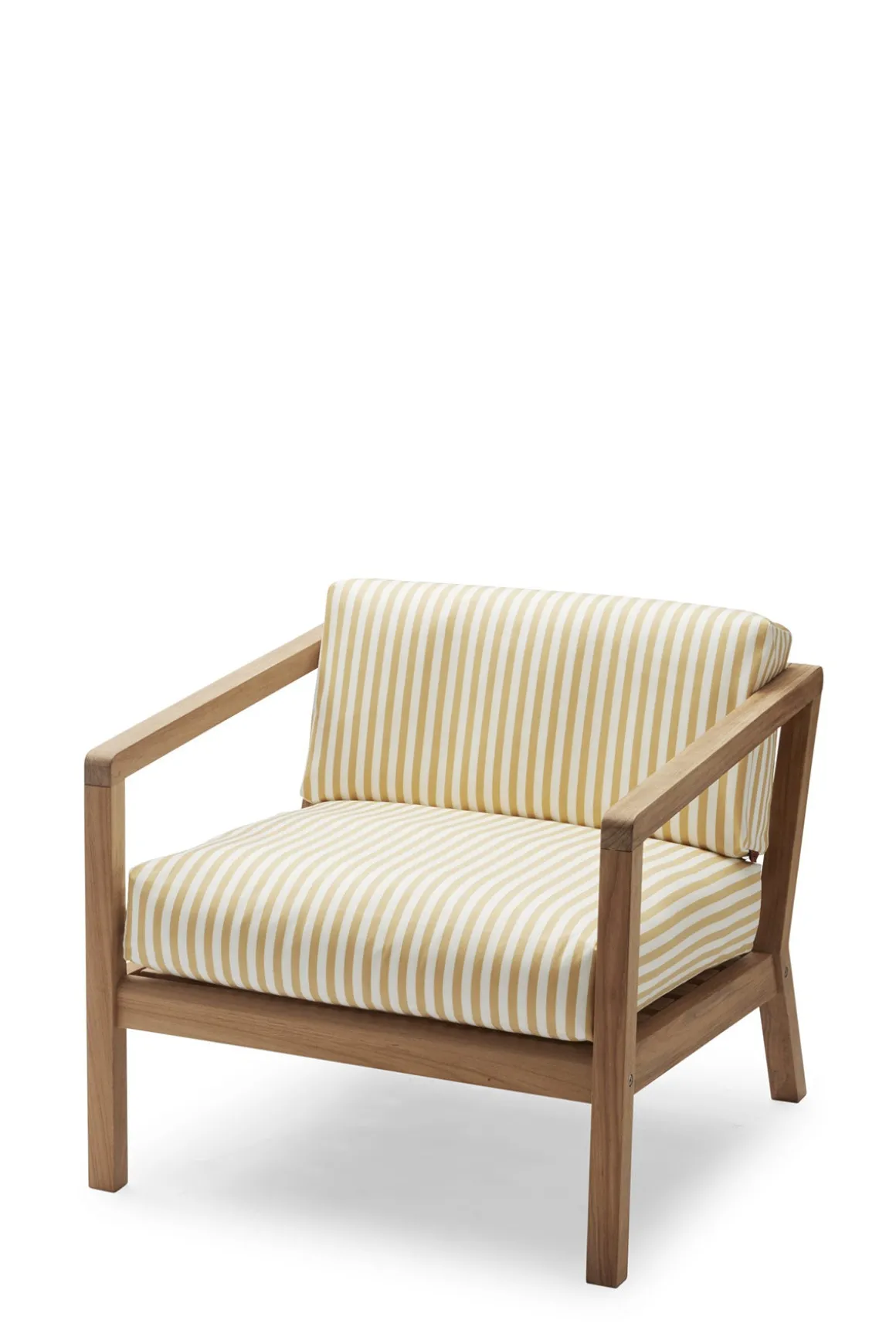 Utestol i teak fra serien Virkelyst, designet av SAYS WHO for Skagerak. Serien er perfekt for avslapning med sine tykke og myke puter. Putene tåler vind og vær, og gir ekstra komfort slik at du kan bli sittende å spise, snakke og kose deg i timesvis. Putene er polstret i eksklusivt Agora Panama-stoff som er et øko-tex-sertifisert og farget akrylstoff. Akrylfiberen skaper et syntetisk, men bomullslignende stoff med funksjoner i verdensklasse for utendørs bruk, noe som gjør det både svært farge-og lysfast, vann-og smussavvisende, muggbestandig og er samtidig fri for skadelige stoffer. De gode putene er fylt med det unike materialet fossflakes; hypoallergenisk, lett å vedlikeholde og opprettholder putens volum og form over lang tid. Selve møbelet er laget av solid og vakker teak. Kombiner gjerne med andre møbler fra Virkelyst-serien for en komplett look.