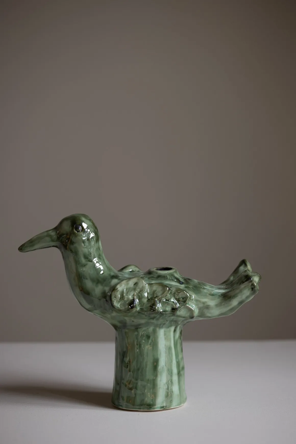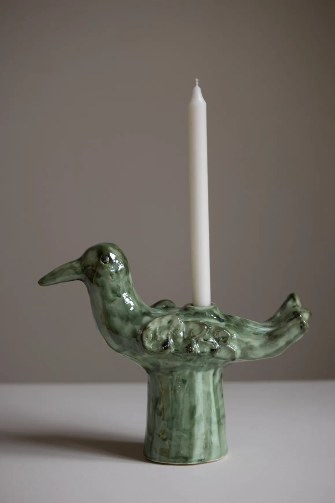 Denne grønne keramikklysestaken av Bela Silva er det perfekte tilskuddet til ethvert bord. Den er en del av Cosas Lindas-kolleksjonen, som henter dyp inspirasjon fra naturen og består av ulike steingodsgjenstander utsmykket med utskårne fisker og fugler.