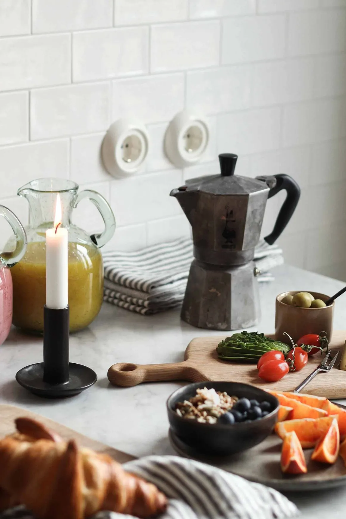 Minimalistisk, håndlaget lysestake i keramikk fra svenske Tell Me More i en matt, mørk gråfarge.