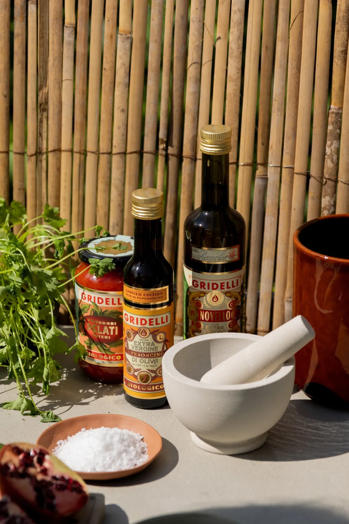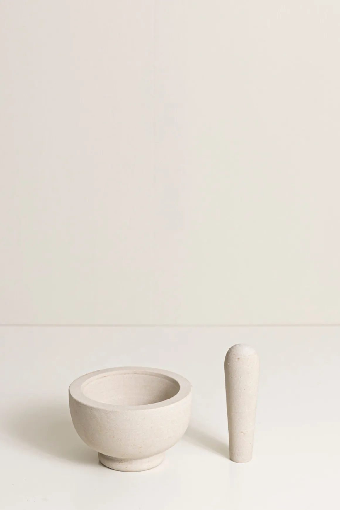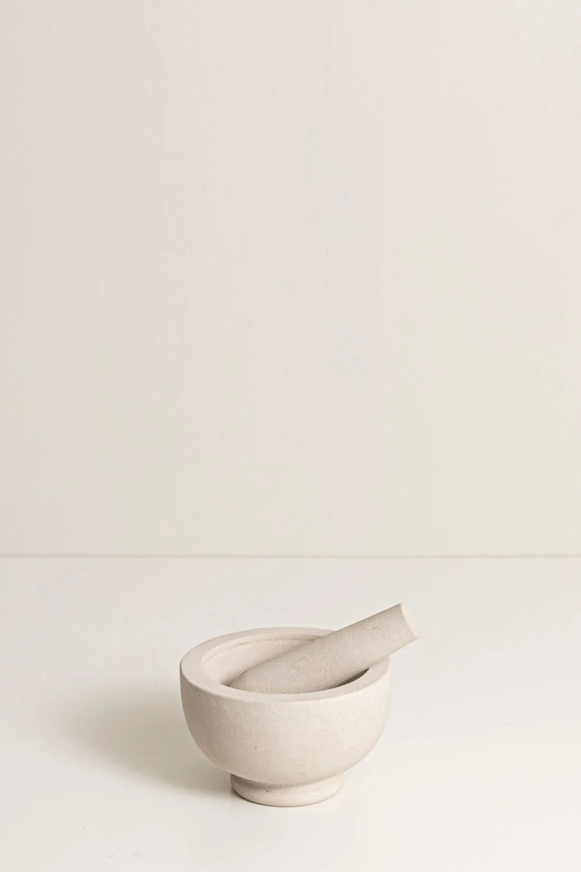 Morter i lyst stentøy fra svenske Bruka Design. En klassiker og must-have på kjøkkenet til knusing av frø, lage dipper, sauser eller krydderblandinger.