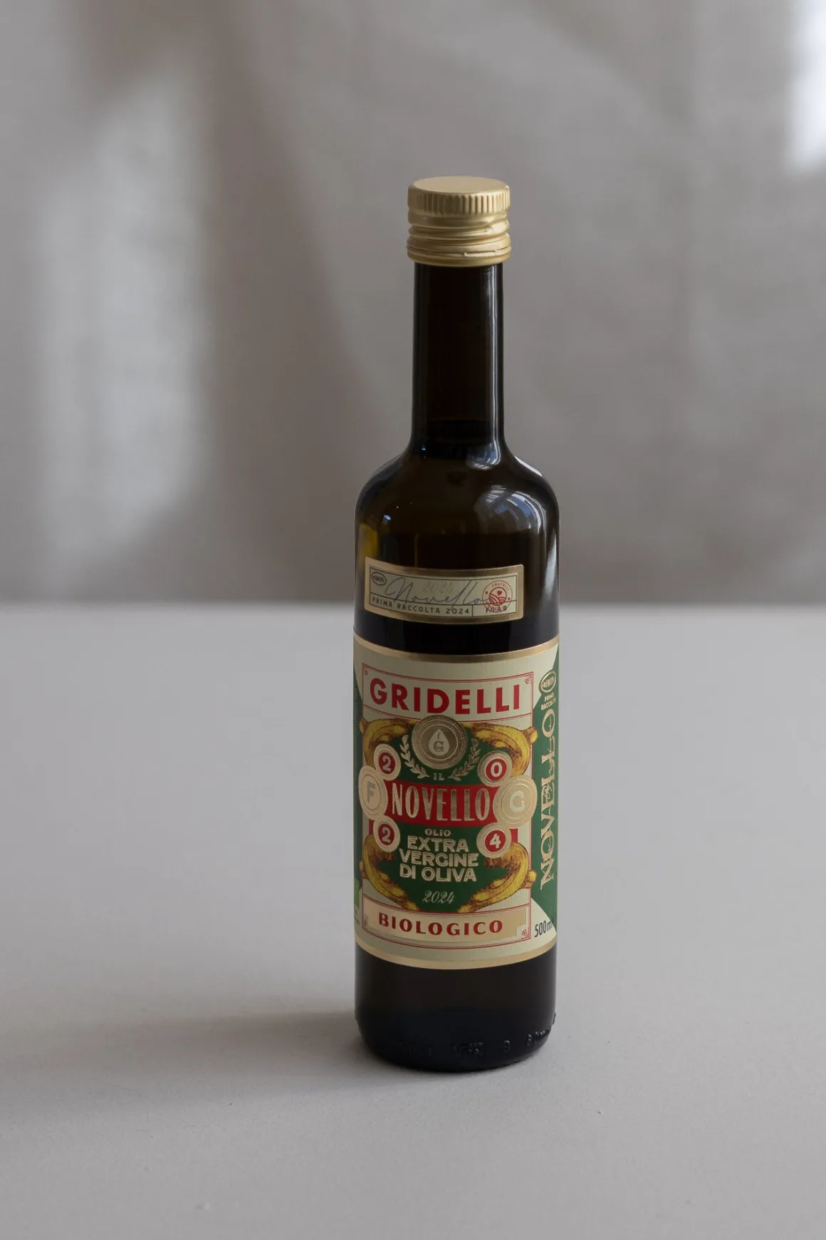 Gridelli Novello er en økologisk ekstra virgin olivenolje av høyeste kvalitet, laget av Correggiolo-oliven som dyrkes på de frodige åsene utenfor Rimini i Emilia-Romagna. Novello refererer til den aller første pressingen fra årets høst, noe som gir oljen en frisk, fruktig smak med en intens grønn karakter. Perfekt til salater, ferskt brød eller som en smakfull topping på varme retter.