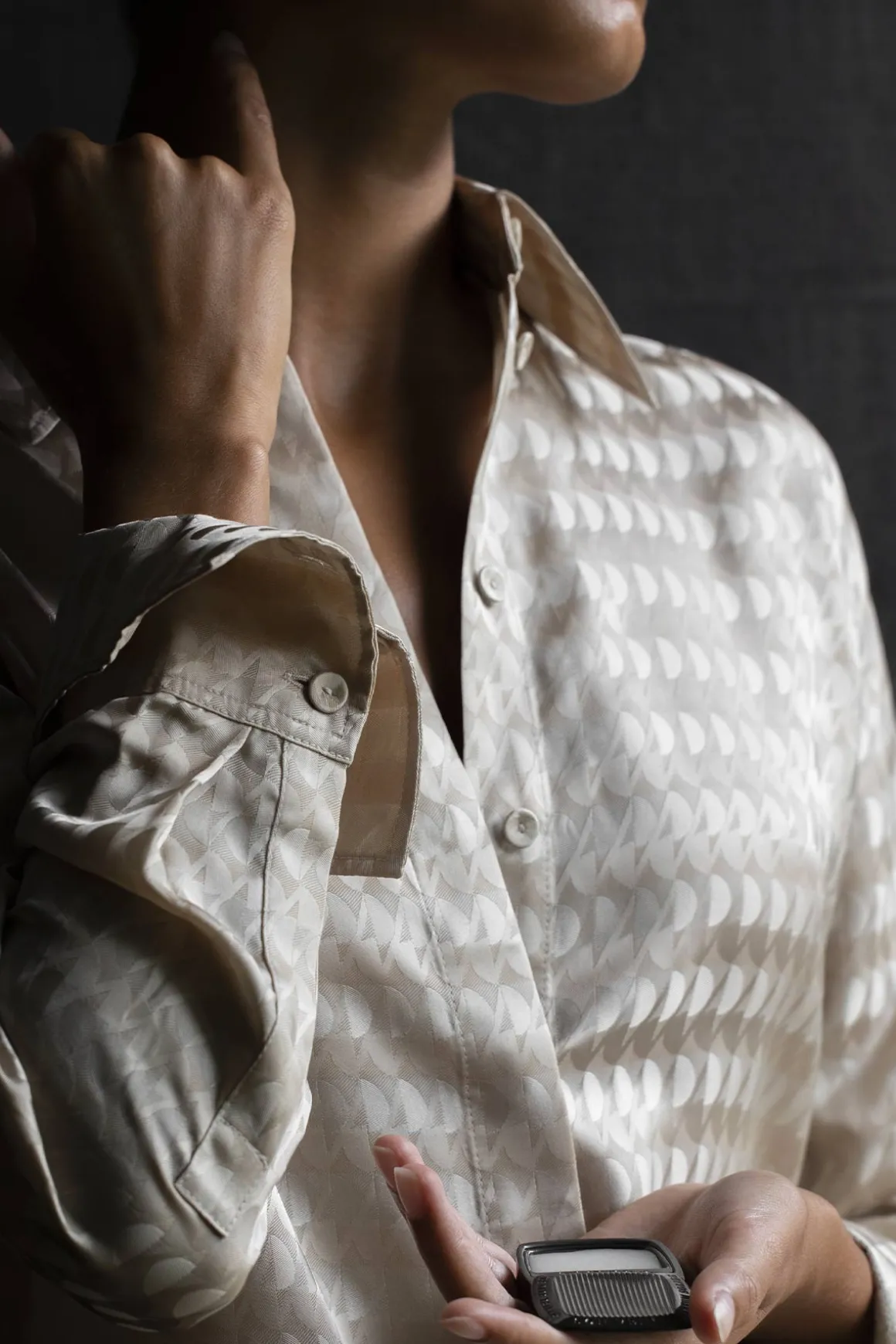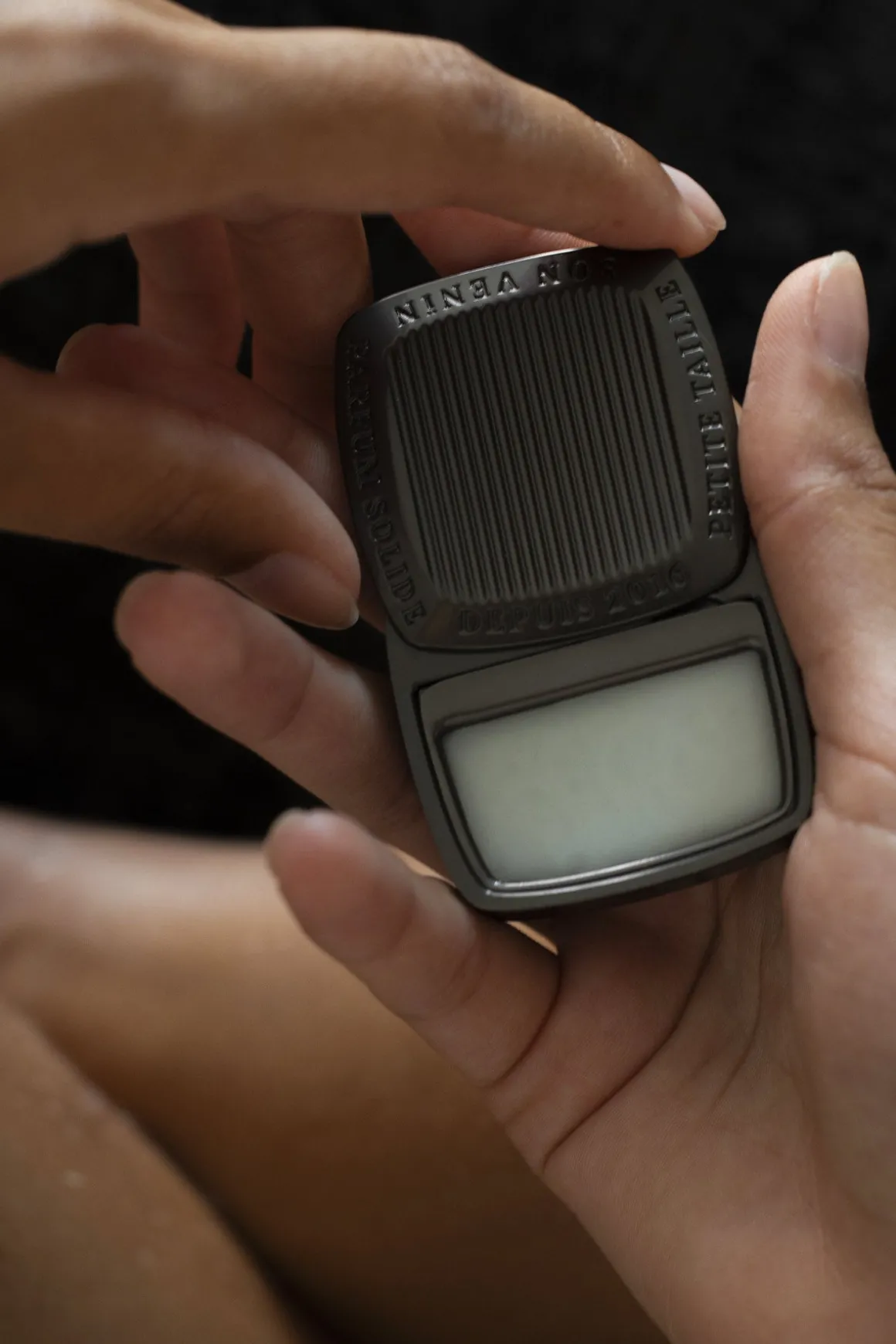 Påfør den solide parfymen på pulspunktene dine, der kroppen din avgir mest varme: på håndleddene, på innsiden av albuene, nederst på nakken, bak ørene og på brystet. Unngå kontakt med øynene. Tips! For å sikre at du tåler parfymen, test produktet på en liten del av huden først. Hvis irritasjon oppstår, avbryt bruken og oppsøk lege.