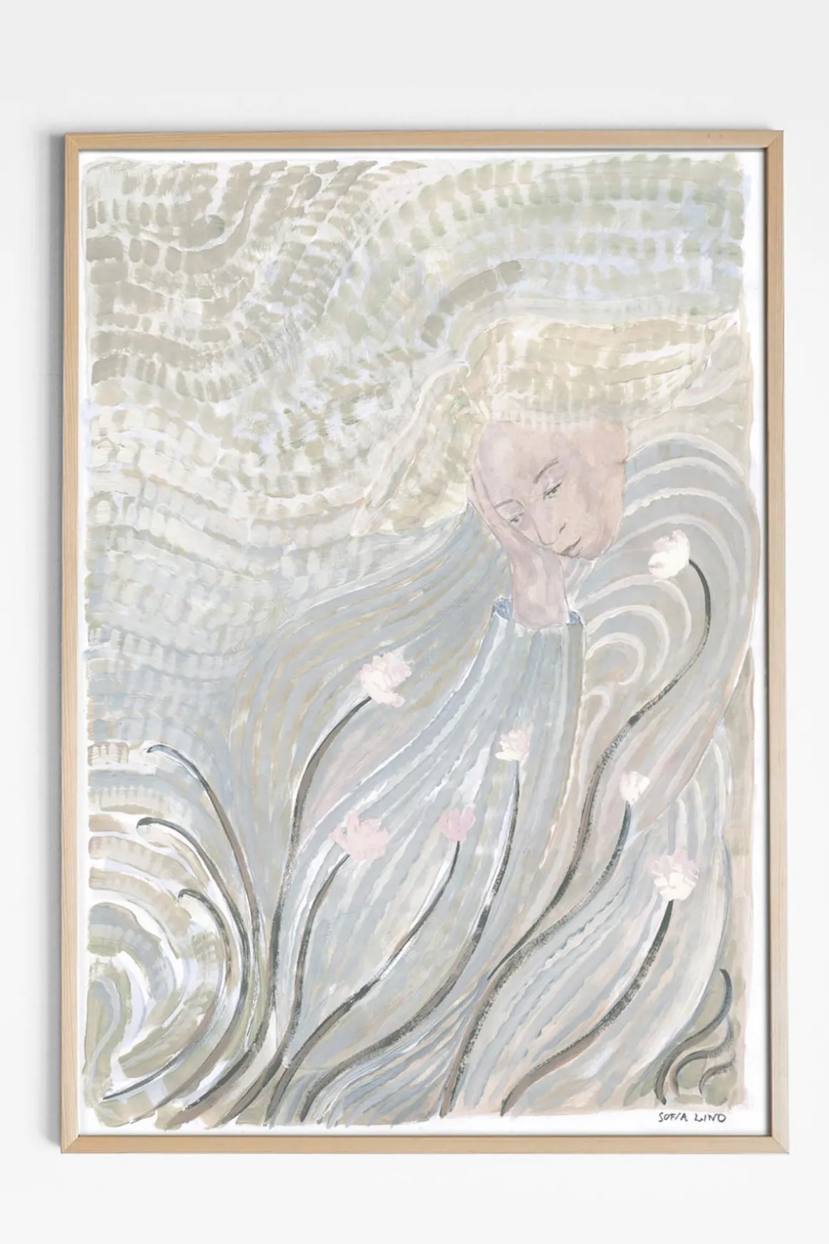 Grow plakat med trykk fra den svenske kunstneren Sofia Lind for Fine Little Day. Hun er kjent for sin bruk av forskjellige mønstre og lar børstestrøk og de originale materialene være synlig i trykket. Med dempede farger og livlige mønstre fanger den oppmerksomheten til seerne.