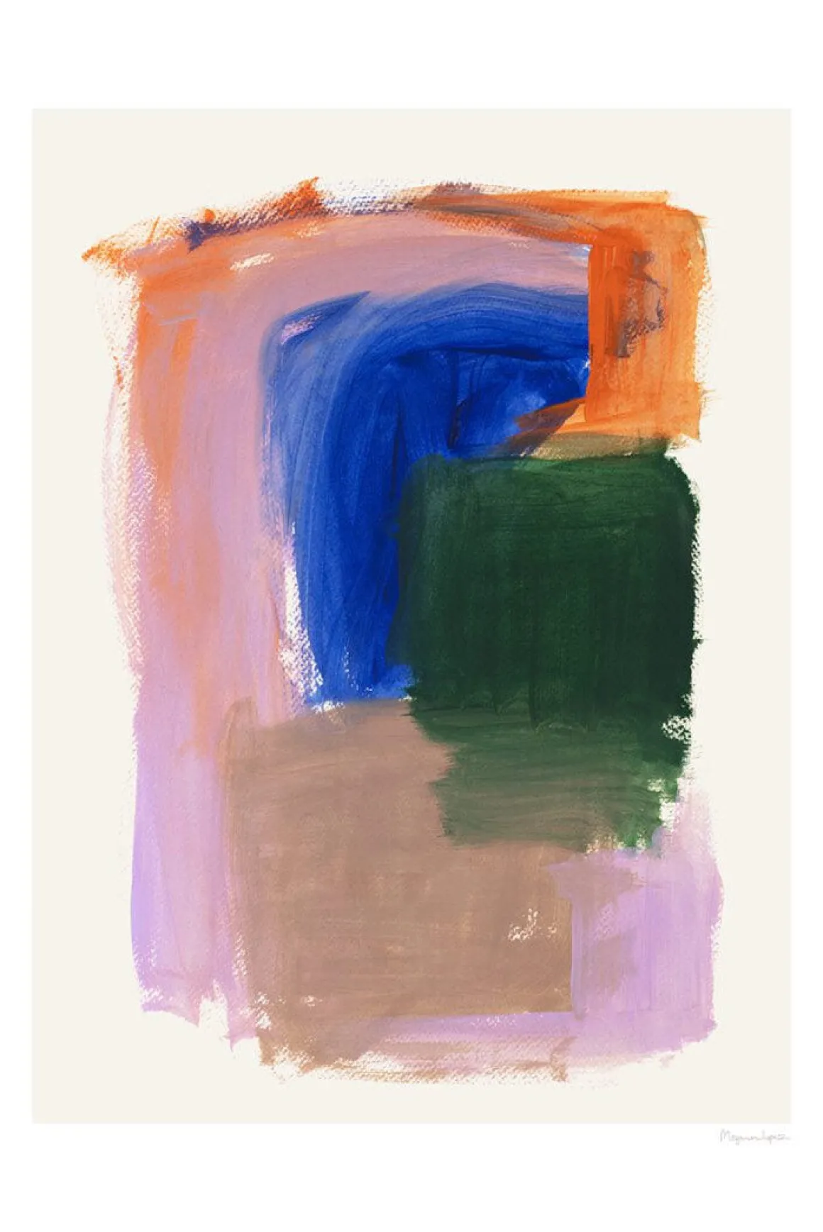 Plakaten Improvise av Berit Mogensen Lopez, laget eksklusivt for The Poster Club, er et abstrakt kunsttrykk som utforsker samspillet mellom farger, penselstrøk og komposisjon. De dype nyansene av blått, grønt og oransje møter mykere toner av rosa og beige, noe som skaper en dynamisk balanse mellom kontrast og harmoni. De synlige penselbevegelsene gir motivet en levende tekstur, der spontaniteten i uttrykket tilfører en følelse av energi og frihet.