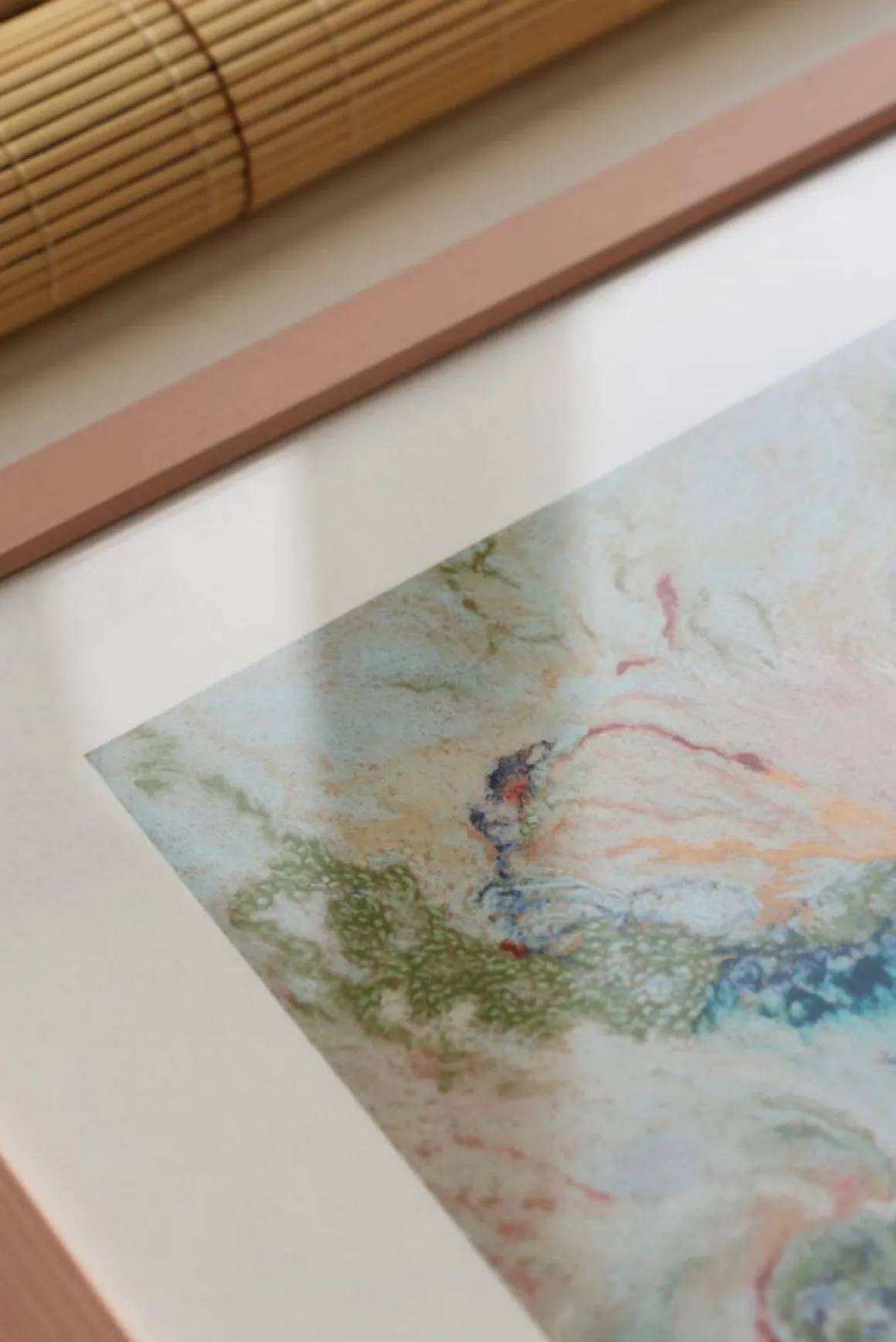 Plakaten av Sofie Rebecca Iversen, laget eksklusivt for The Poster Club, er et abstrakt kunsttrykk som henter inspirasjon fra naturens flytende former og organiske fargeoverganger. De myke pastelltonene i beige, blått, grønt og oransje smelter sammen i et uttrykk som kan minne om elveløp sett fra fugleperspektiv eller en nærstudie av mineraler og steinstrukturer. Den detaljerte teksturen og de harmoniske nyansene gir bildet en sanselig dybde, noe som gjør det til et kunstverk som kan oppleves på nye måter hver gang man ser på det.