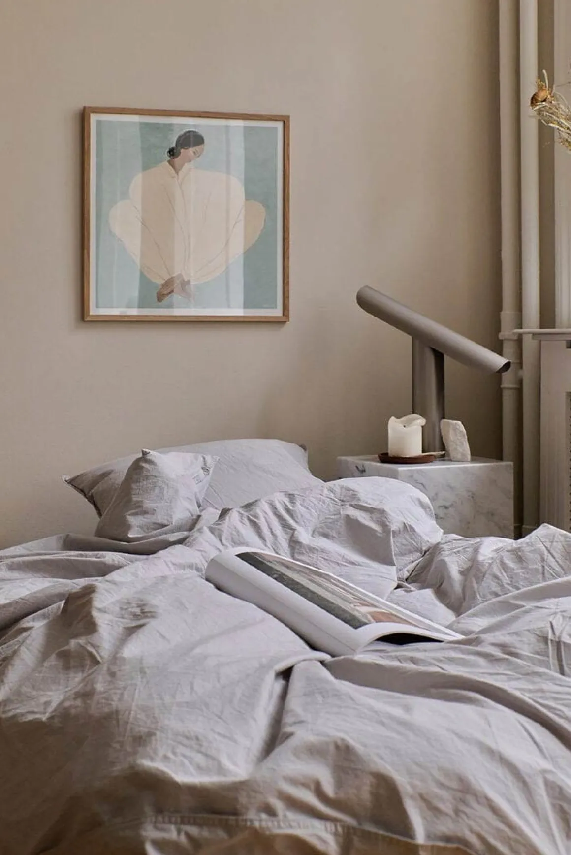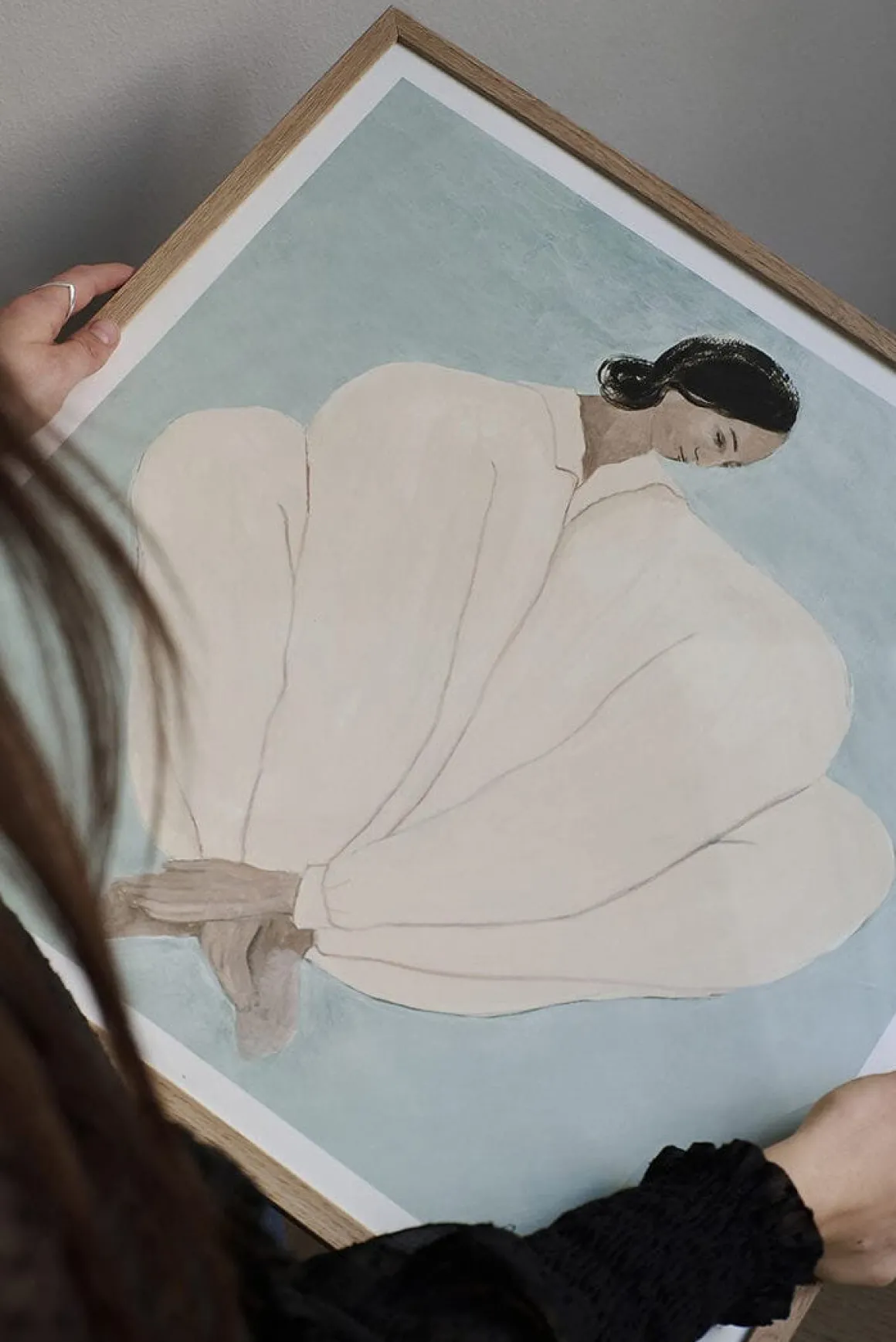 Plakaten av Sofia Lind, laget eksklusivt for The Poster Club og en del av The Paris Metro Collection, er inspirert av offentlig kunst og arkitektur, spesielt stemningen og fargepaletten i fire metrostasjoner i Paris. Med et mykt og balansert uttrykk skildrer motivet en figur i en avslappet, nesten flytende positur, der de dempede blågrønne tonene danner en rolig bakgrunn for de lyse, draperte klærne. Penselstrøkene og komposisjonen gir en sanselig dybde, mens kunstnerens karakteristiske stil tilfører motivet en subtil følelse av bevegelse og refleksjon.
