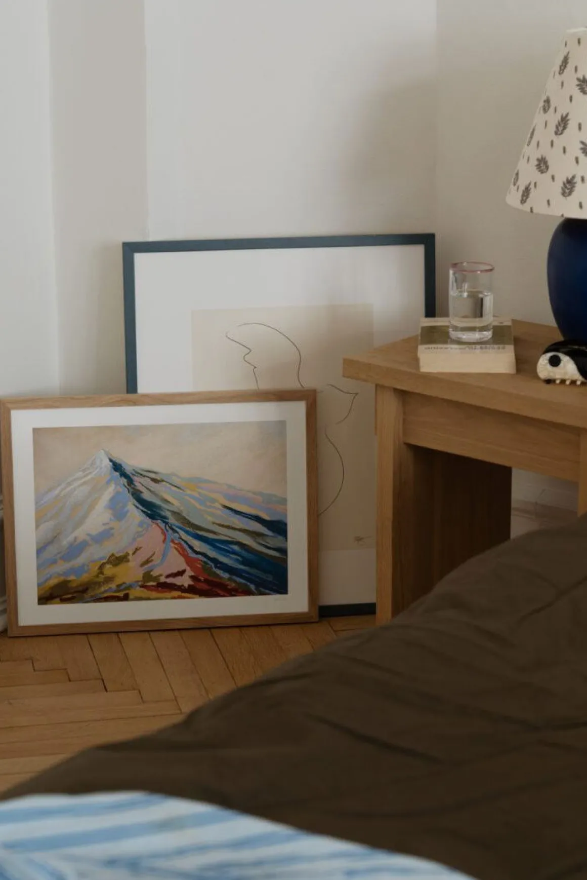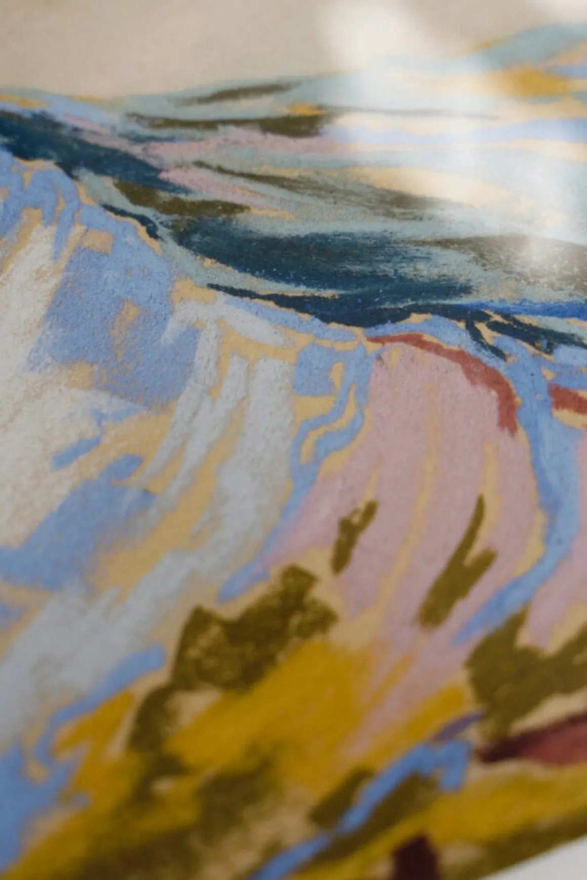 Plakaten av Mandy Maria, laget eksklusivt for The Poster Club, fanger den majestetiske skjønnheten i et fjellandskap med en ekspressiv bruk av farger og teksturer. De myke penselstrøkene og de levende nyansene av blått, oker og terrakotta gir motivet en dynamisk og drømmende kvalitet, samtidig som det gjenspeiler naturens rå uttrykk. Kontrasten mellom de kjølige og varme tonene skaper en følelse av bevegelse og dybde, som gir plakaten en kunstnerisk og tidløs appell.