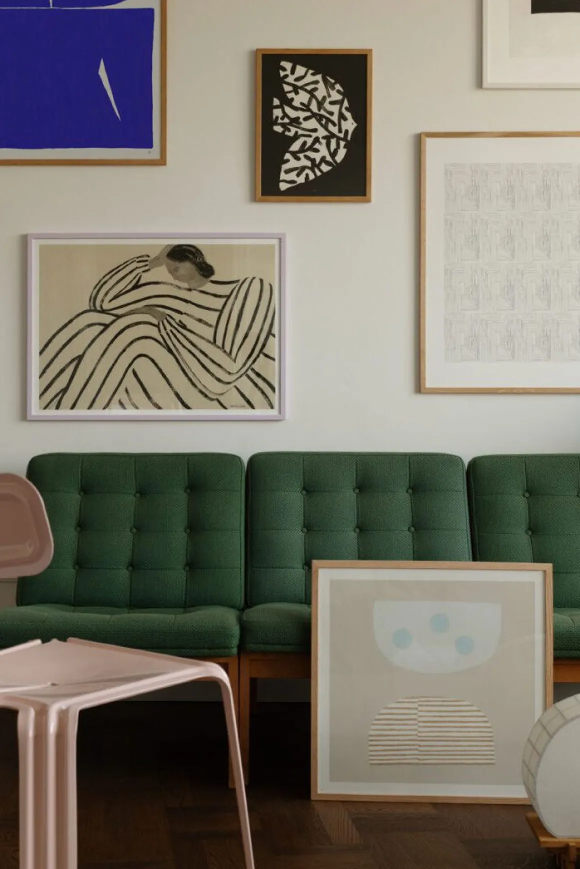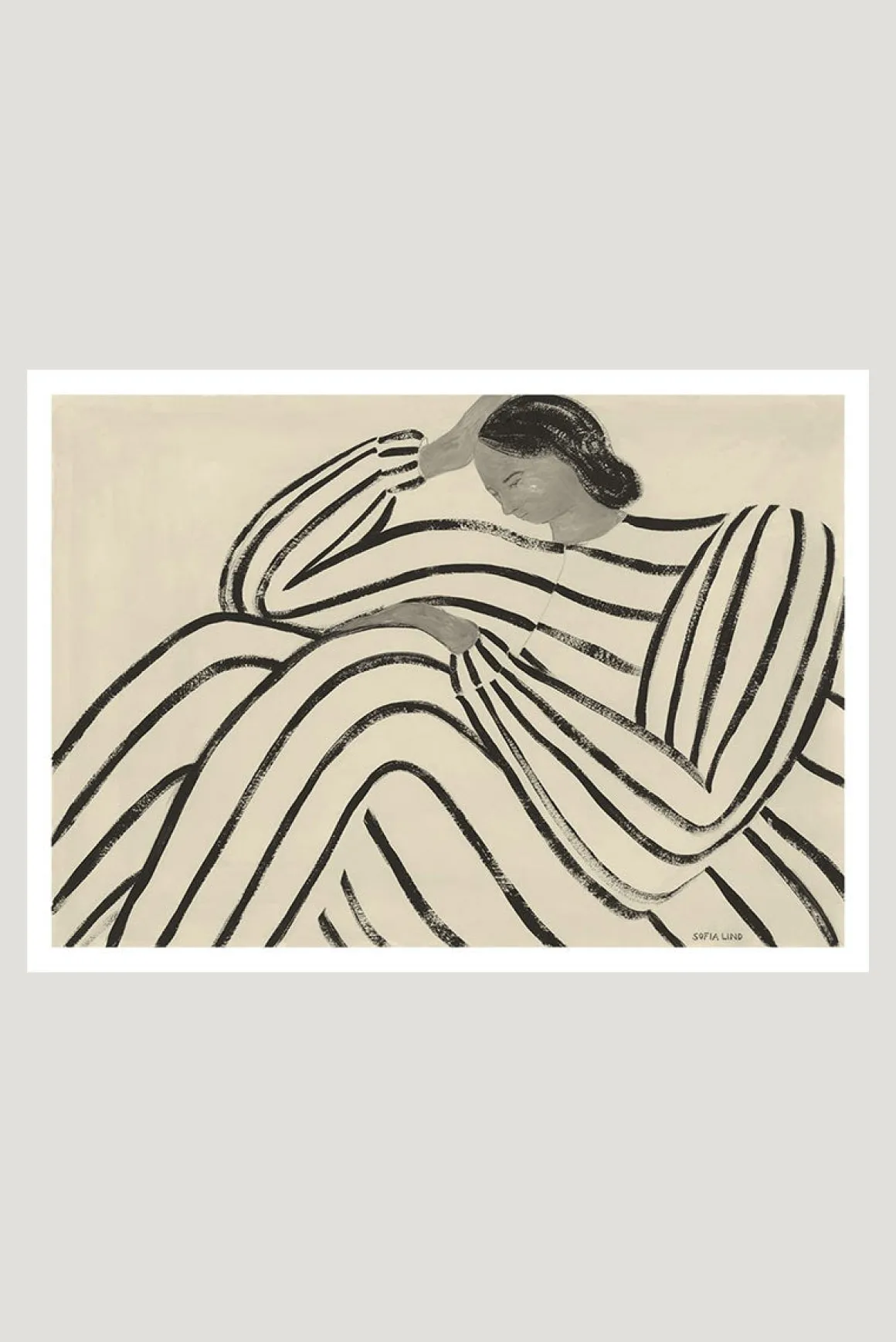 Plakaten Waiting av Sofia Lind er et kunstnerisk giclée-trykk med et beroligende og harmonisk uttrykk. Motivet viser en stilisert figur kledd i et stripet mønster, der de myke, flytende linjene skaper en organisk forbindelse mellom kropp og bakgrunn. De dempede, jordnære tonene gir bildet en rolig tilstedeværelse, mens den subtile teksturen tilfører dybde og en håndlaget følelse. Kombinasjonen av det minimalistiske uttrykket og de karakteristiske linjene gjør at plakaten passer sømløst inn i et sofistikert interiør, enten alene eller sammen med andre kunstverk i en balansert komposisjon.
