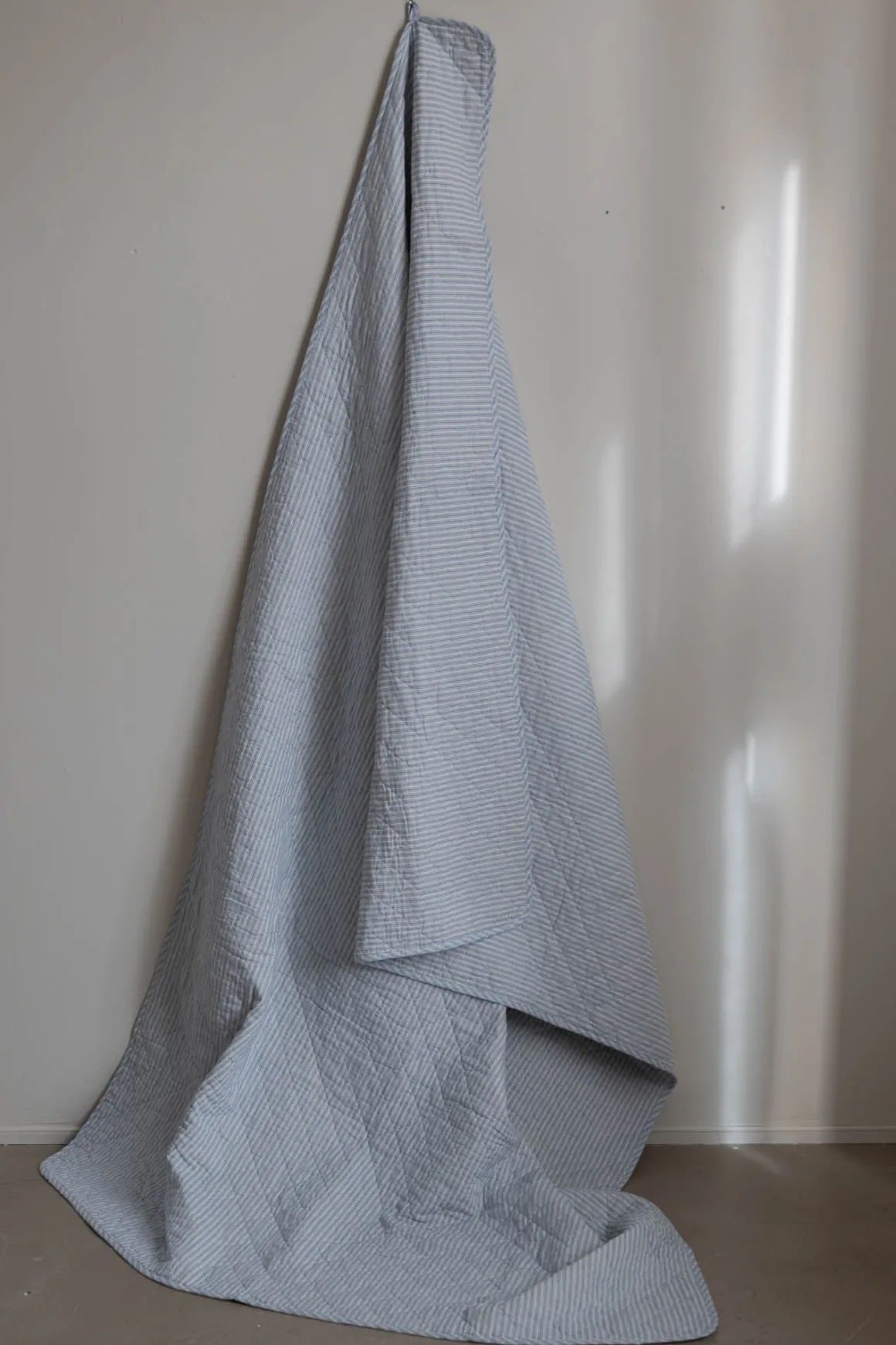 Mykt, quiltet pledd/sengeteppe fra Au Maison. Klassisk med tynne blå og hvite striper. Teppet er laget av resirkulert bomull og passer perfekt som pledd i stuen eller som sengeteppe. Bruk som piknik-pledd eller på uteplassen.