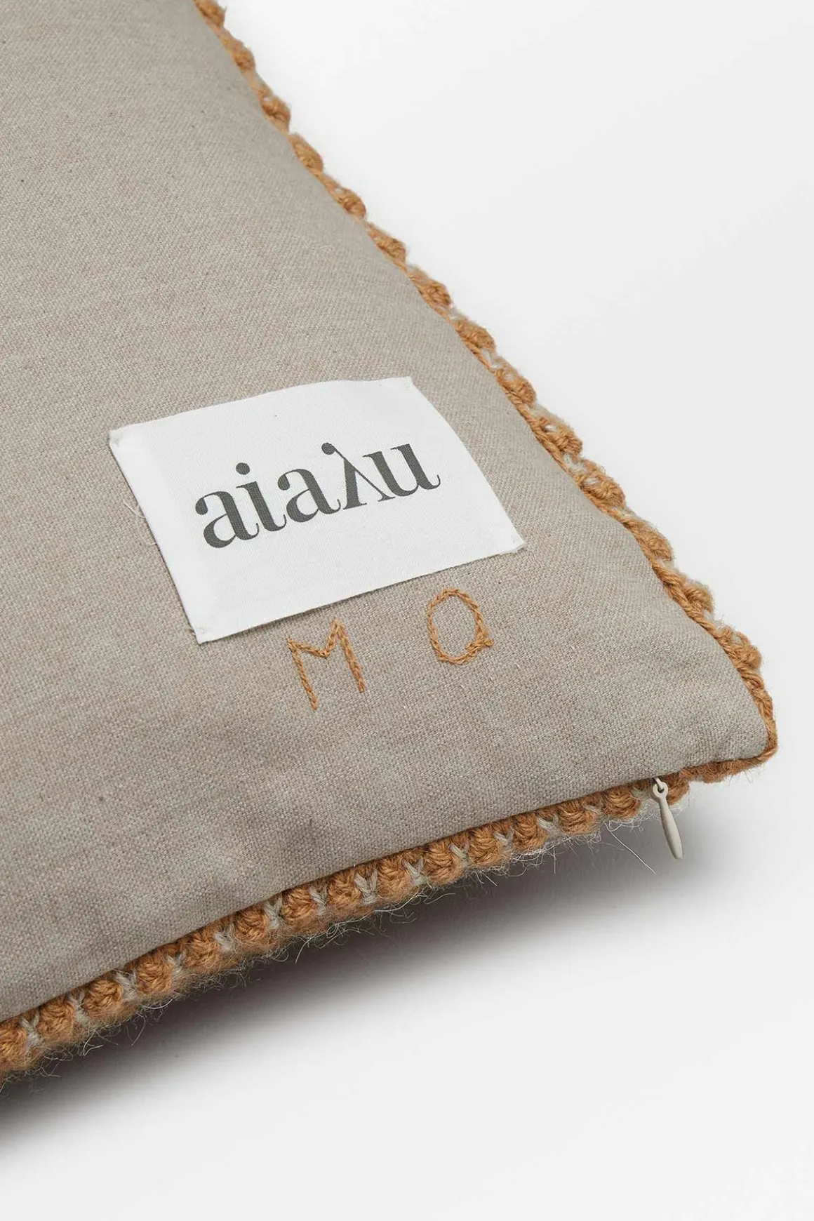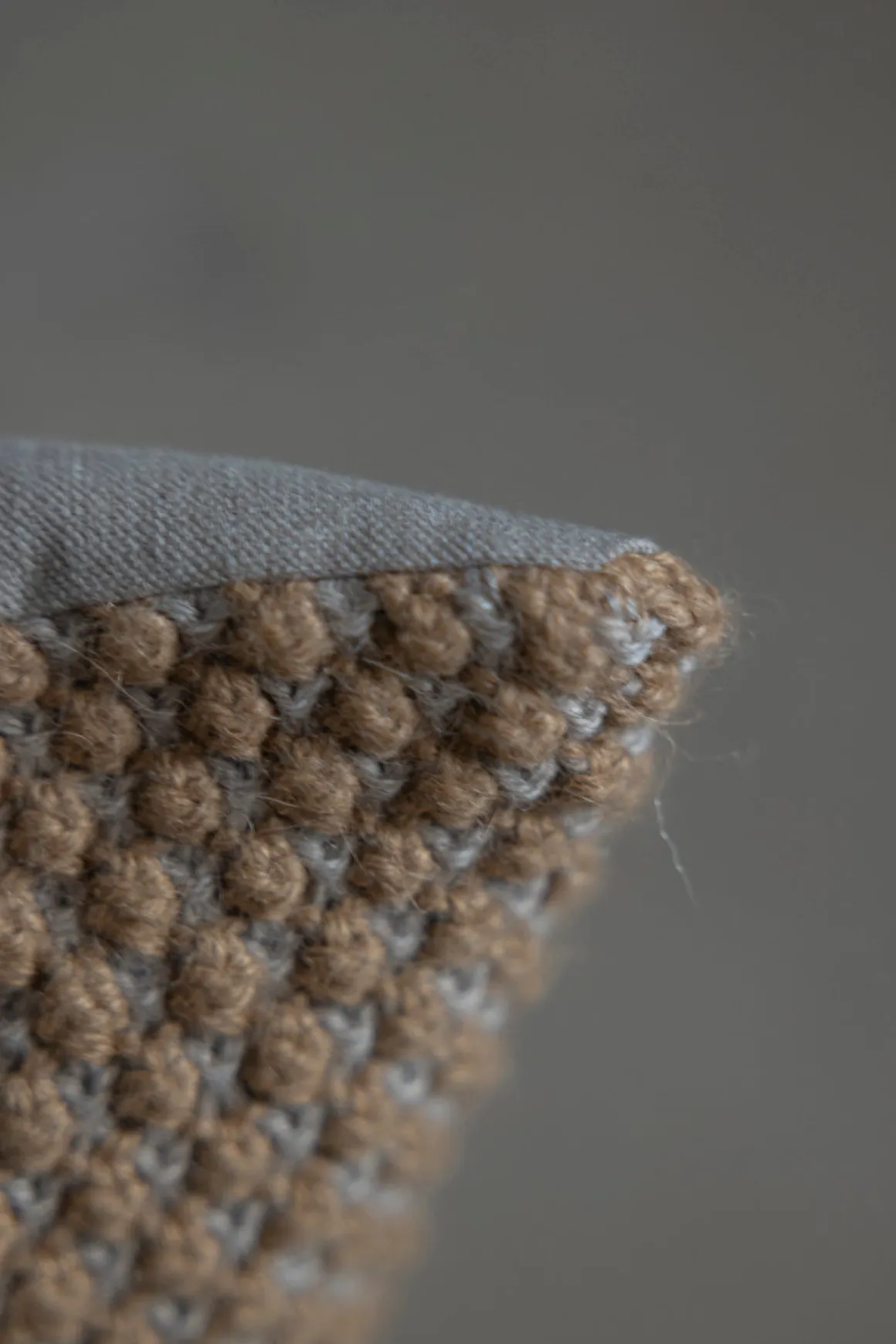 Heather pute i fargen Mix Nutmeg fra Aiayu Domus. Puten har nydelig, myk perlestrikk i 100% ull fra babylama. Putetrekket er designet i Danmark og strikket for hånd i Bolivia. Initialene til den som har strikket puten står på baksiden. Baksiden er i kanvas-kvalitet og lukkes med skjult glidelås. Puten er svært slitesterk og nupper ikke.
