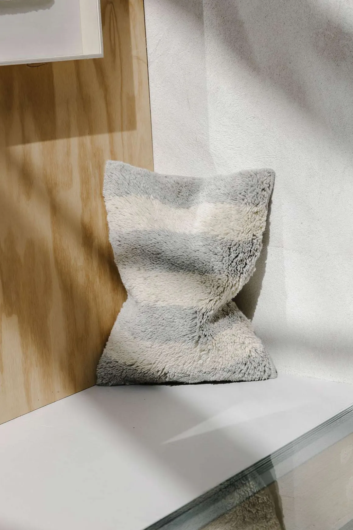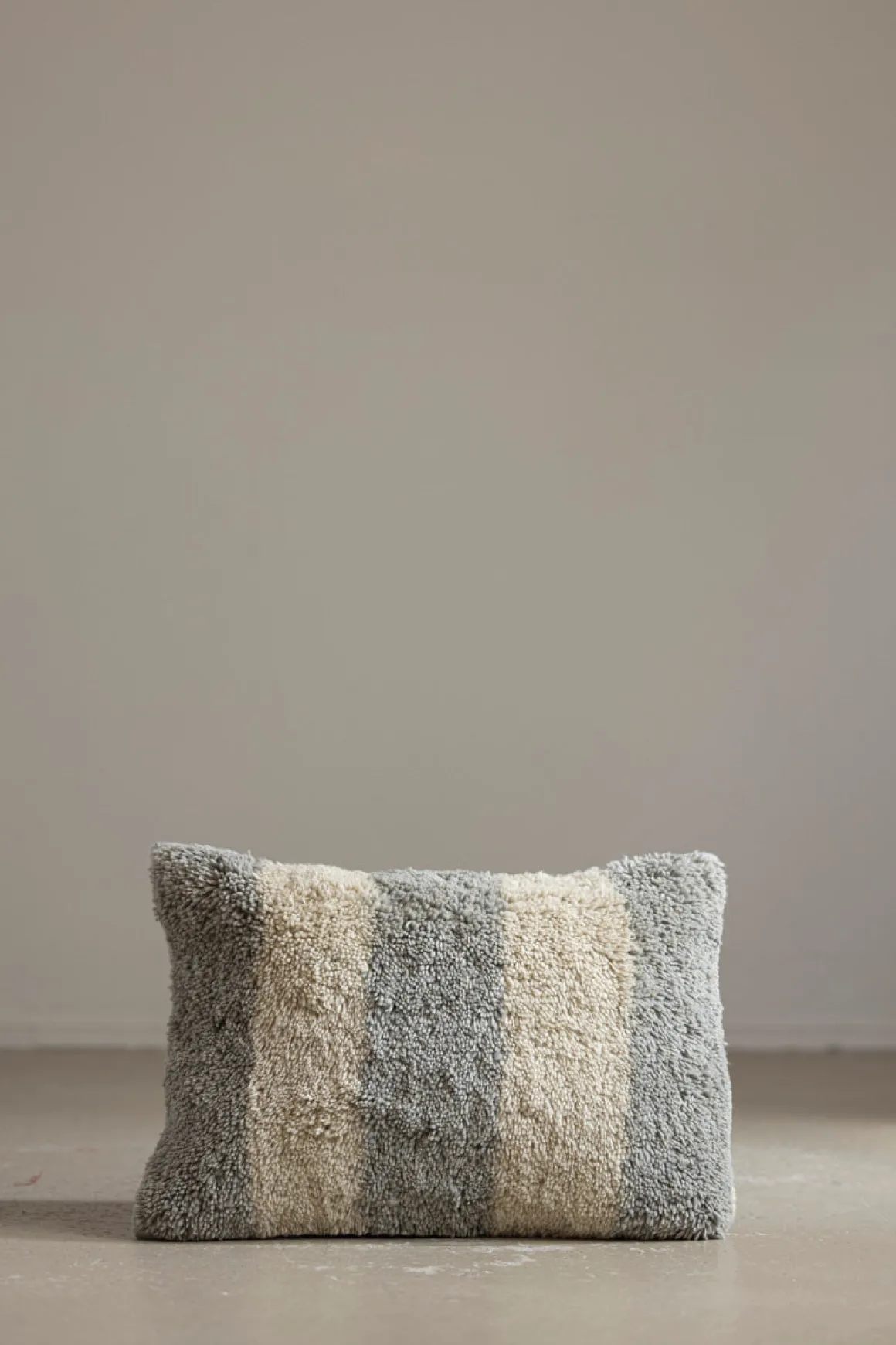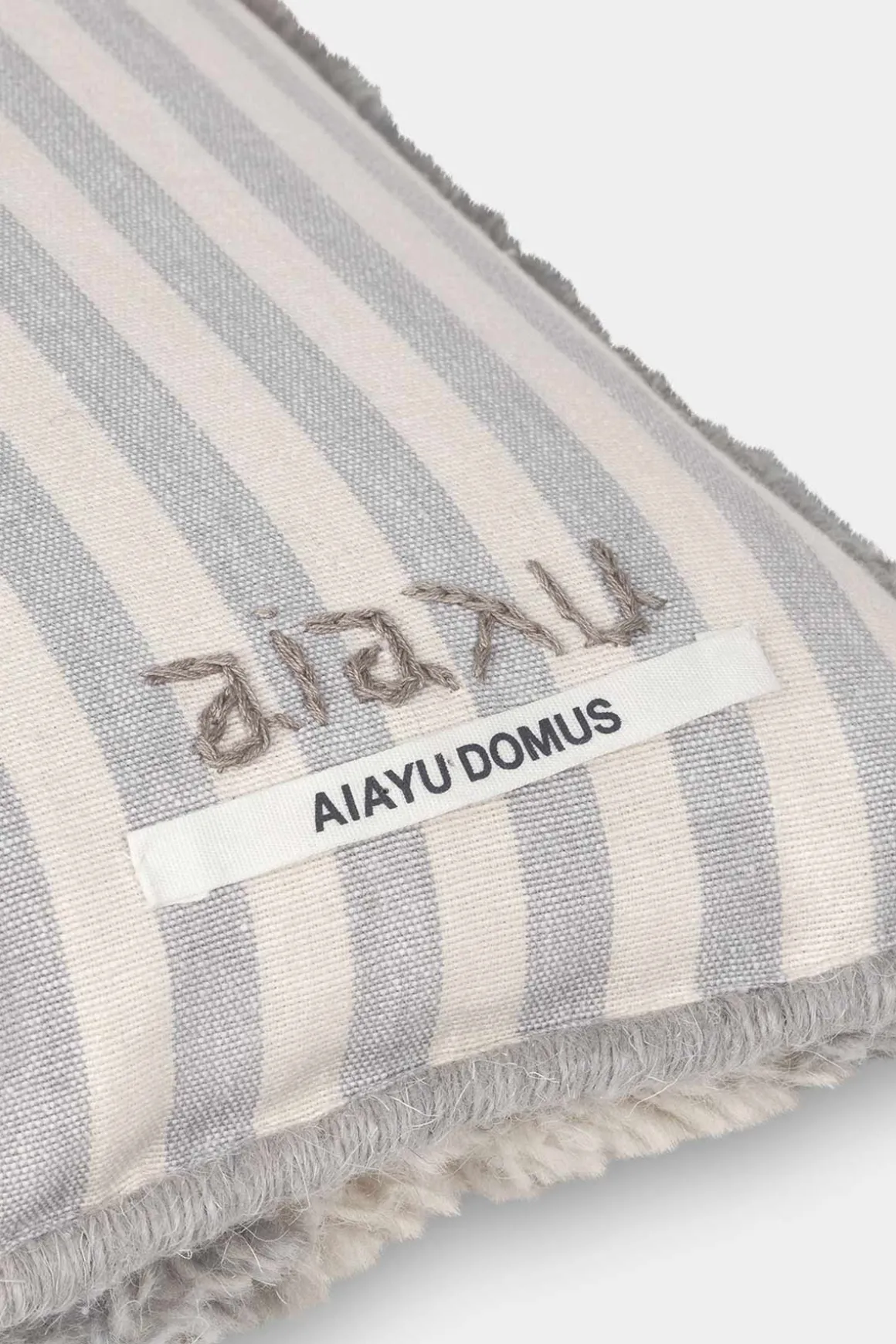 Nepal stripe puten fra Aiayu Domus er håndlaget i Kathmandu og har en organisk, raggete finish og et klassisk mønster. Hver pute er laget ved å binde håndfargede biter av tibetansk saueull inn i et stripet mønster, og deretter håndkutte ullen som et siste trinn for å få den fantastiske plysjoverflaten. Ullen er hentet direkte fra Tibet og bearbeidet lokalt på Aiayus verksted i Nepal. Baksiden er av økologisk bomull med en konvoluttlukking og håndbrodert Aiayu-logo. Puten er svært slitesterk og nupper ikke.