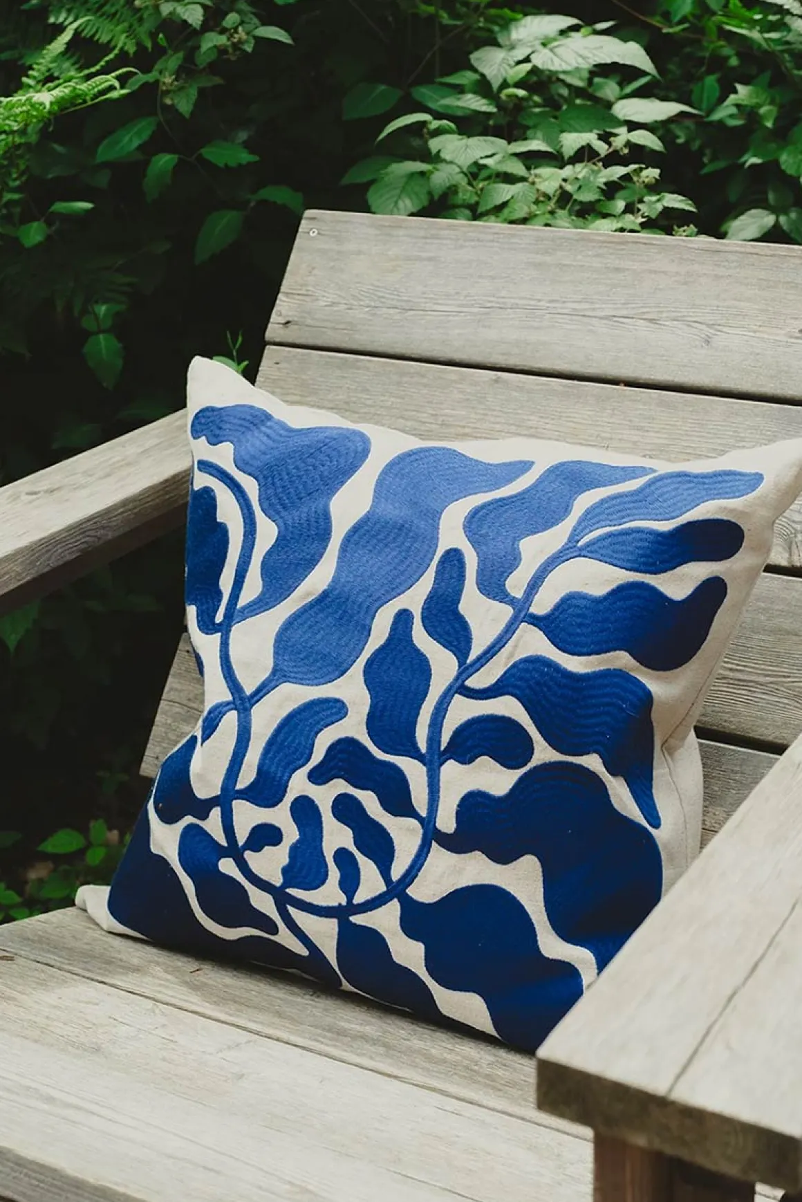 Leaves-putetrekket fra Fine Little Day er designet av Linnéa Andersson og har et karakteristisk brodert bladmotiv i blått på naturfarget bunn. Trekket er laget i en kraftig lin- og bomullsblanding med polyesterbroderi, og gir et kunstnerisk og dekorativt preg til sofaen eller lenestolen. Motivet vises kun på én side, og trekket lukkes med glidelås i bunnen.